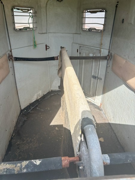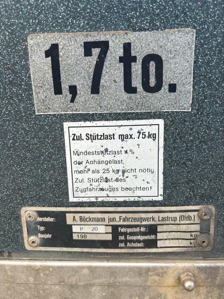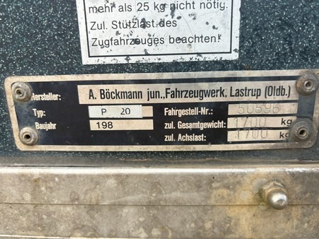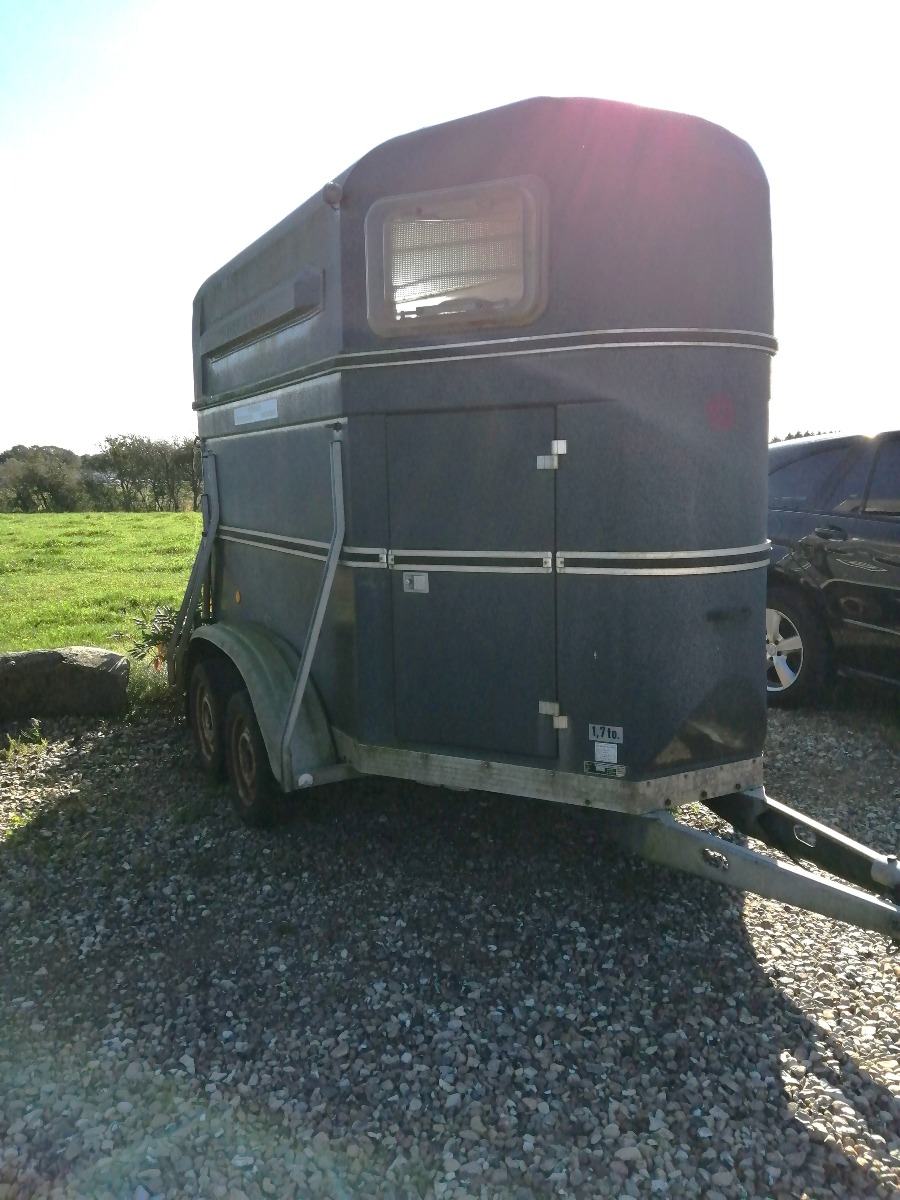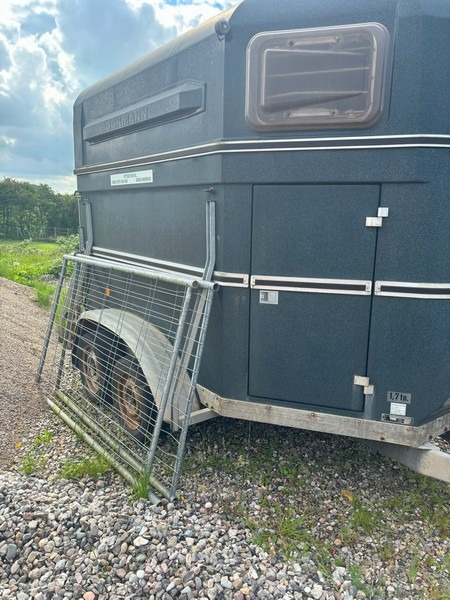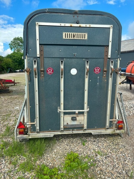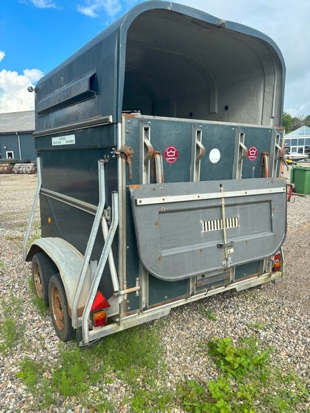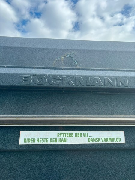 Böckmann T2v hestetrailer i glasfiber med svingbar rampe og svingbar panoramavindue over rampe. Godkendt til transport af dyr. Indregistreret oktober 1986. Egenvægt 675kg. Maksimallast 1025kg. Totalvægt 1700kg. Står uden plader. Med regi. attest. Skal synes ved omregistrering. Den ene bagrefleks er knækket. Brugt og med brugsspor.