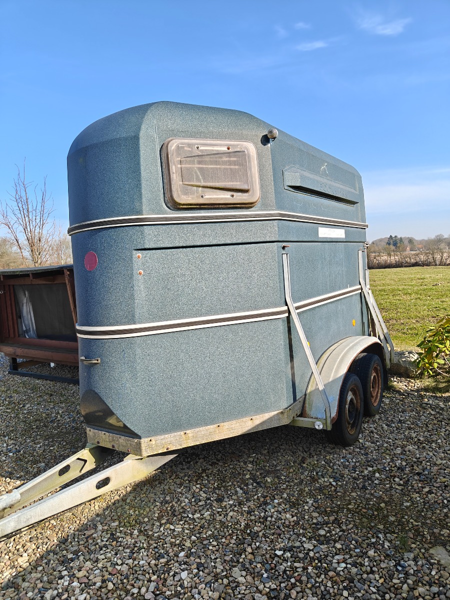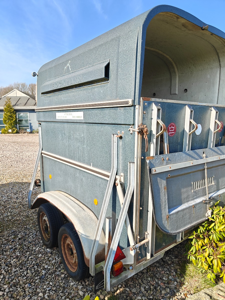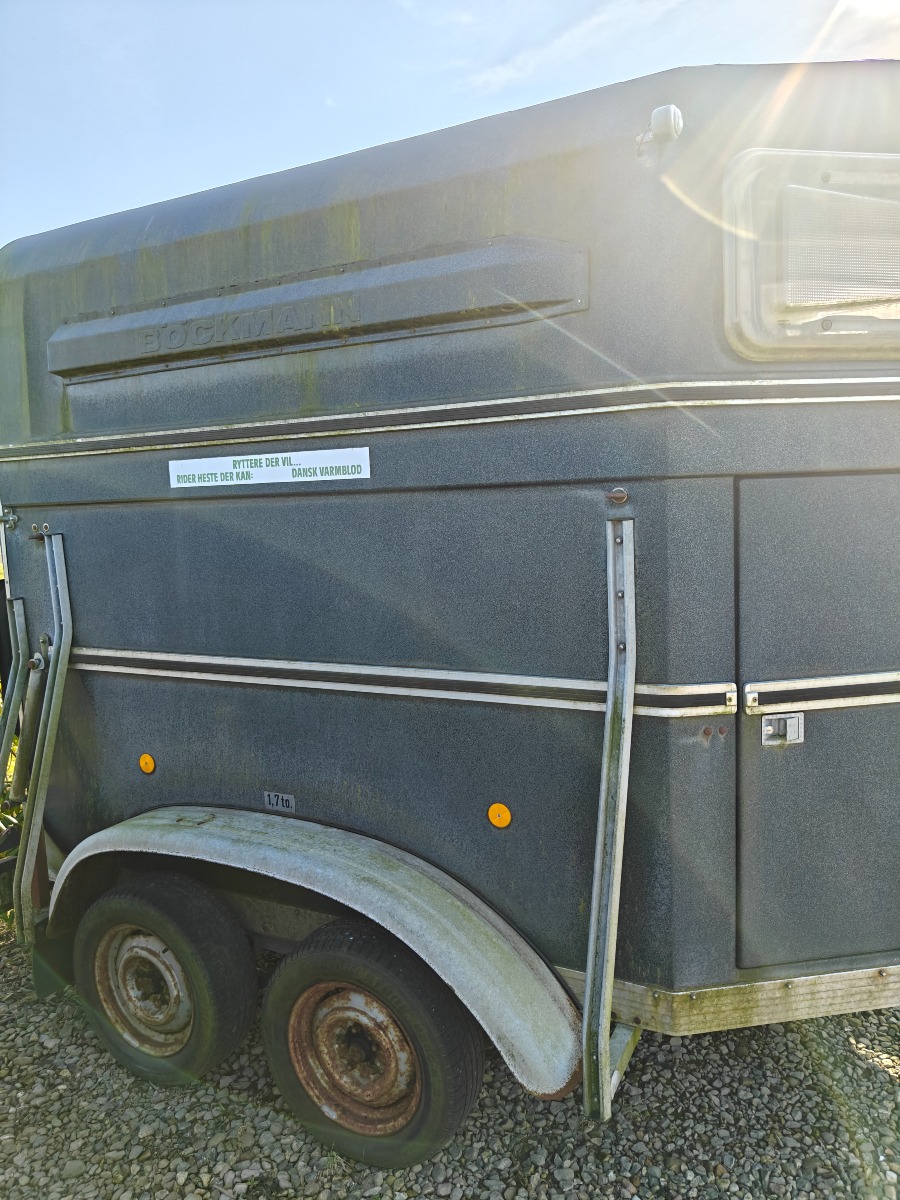 Böckmann T2v hestetrailer i glasfiber med svingbar rampe og svingbar panoramavindue over rampe. Godkendt til transport af dyr. Indregistreret oktober 1986. Egenvægt 675kg. Maksimallast 1025kg. Totalvægt 1700kg. Står uden plader. Med regi. attest. Skal synes ved omregistrering. Den ene bagrefleks er knækket. Brugt og med brugsspor.