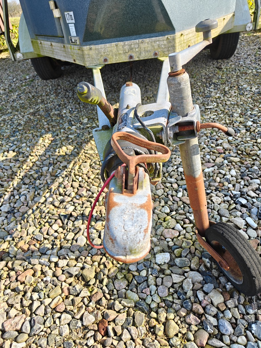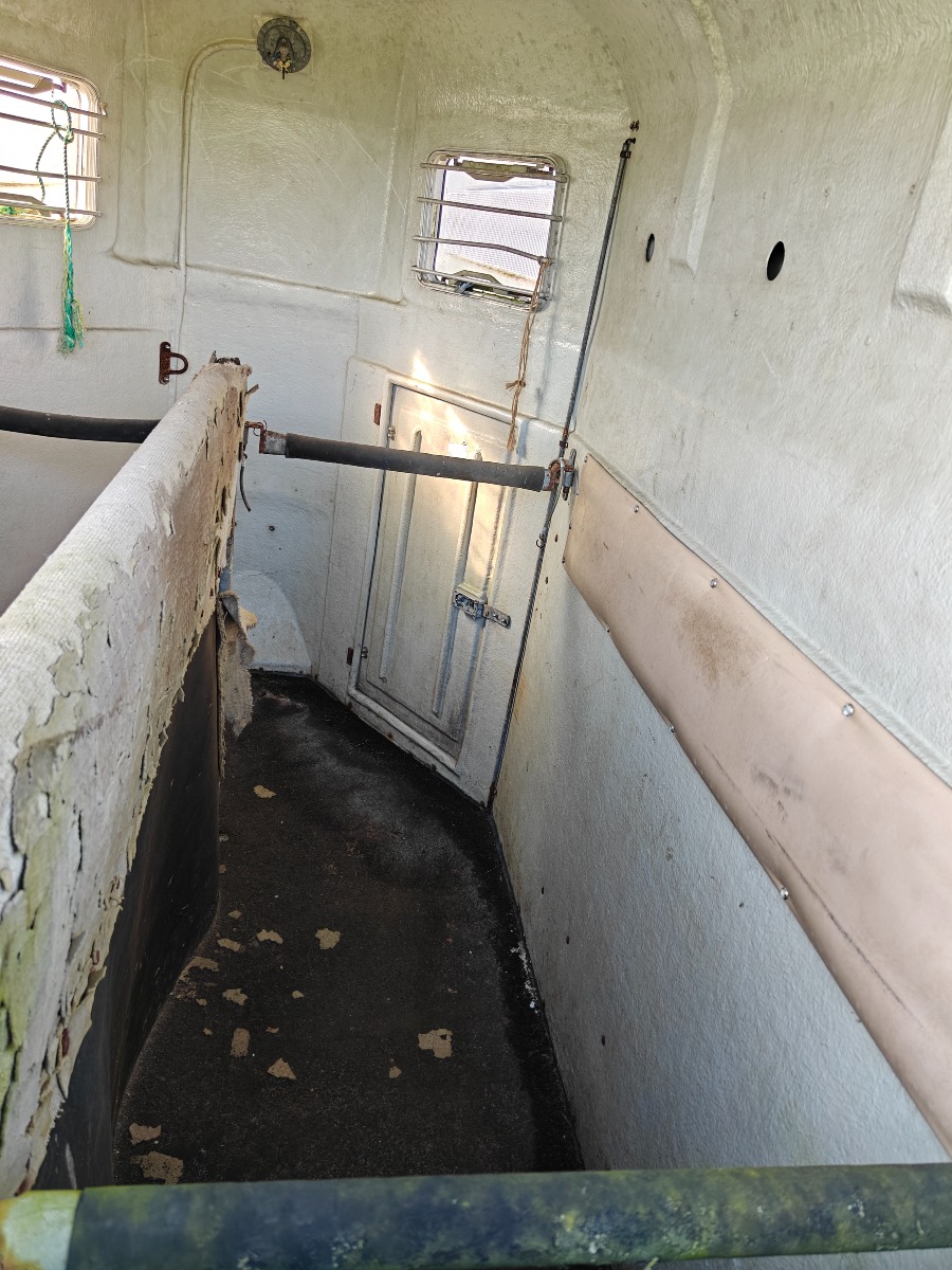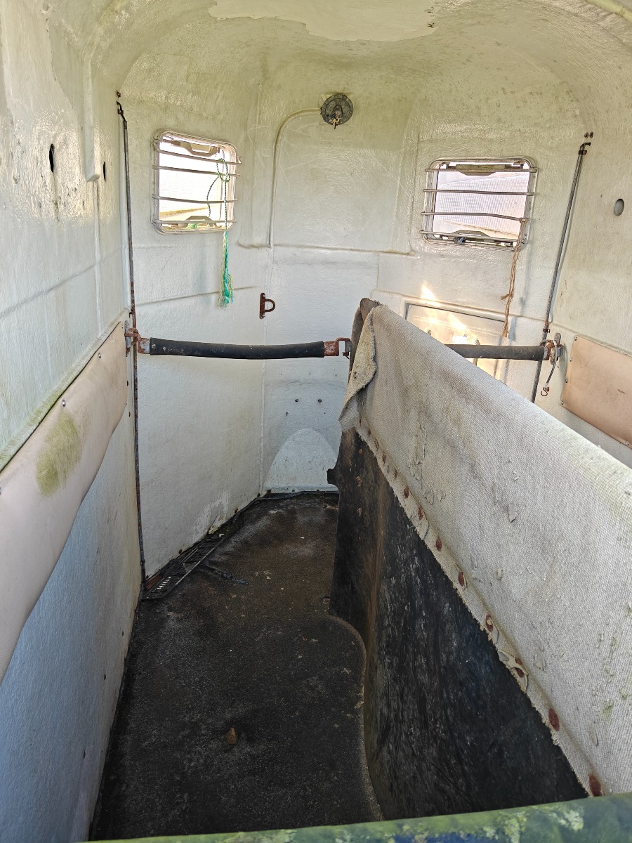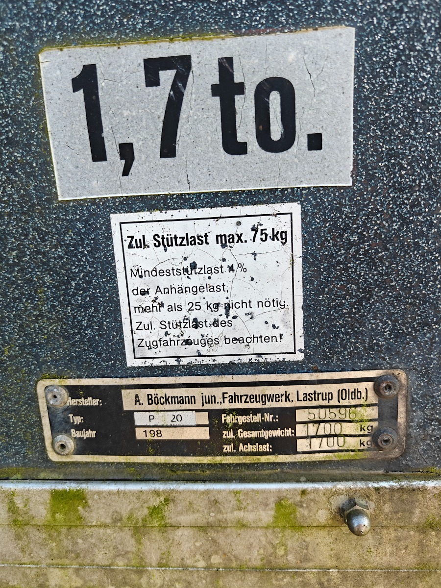 Böckmann T2v hestetrailer i glasfiber med svingbar rampe og svingbar panoramavindue over rampe. Godkendt til transport af dyr. Indregistreret oktober 1986. Egenvægt 675kg. Maksimallast 1025kg. Totalvægt 1700kg. Står uden plader. Med regi. attest. Skal synes ved omregistrering. Den ene bagrefleks er knækket. Brugt og med brugsspor.
