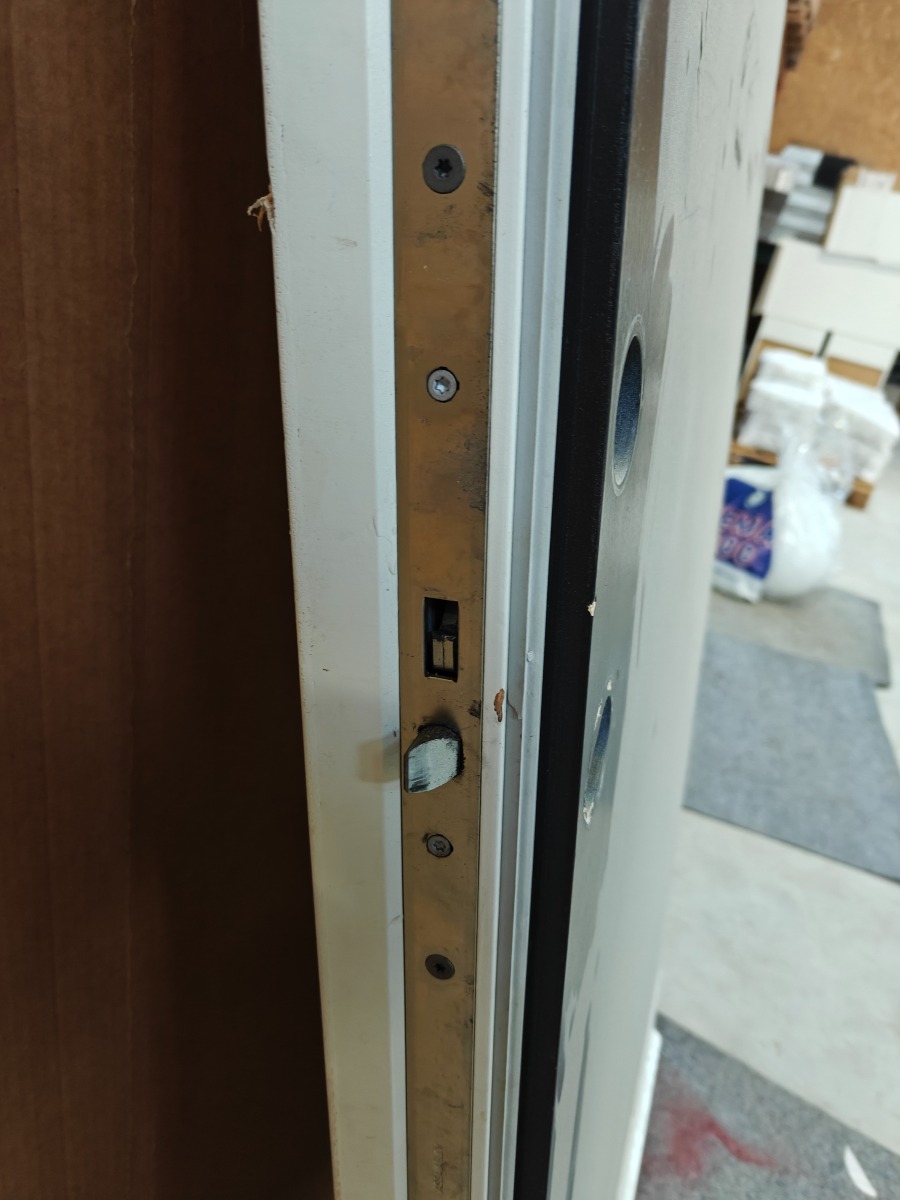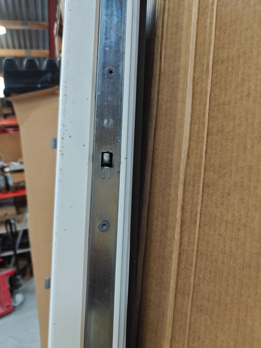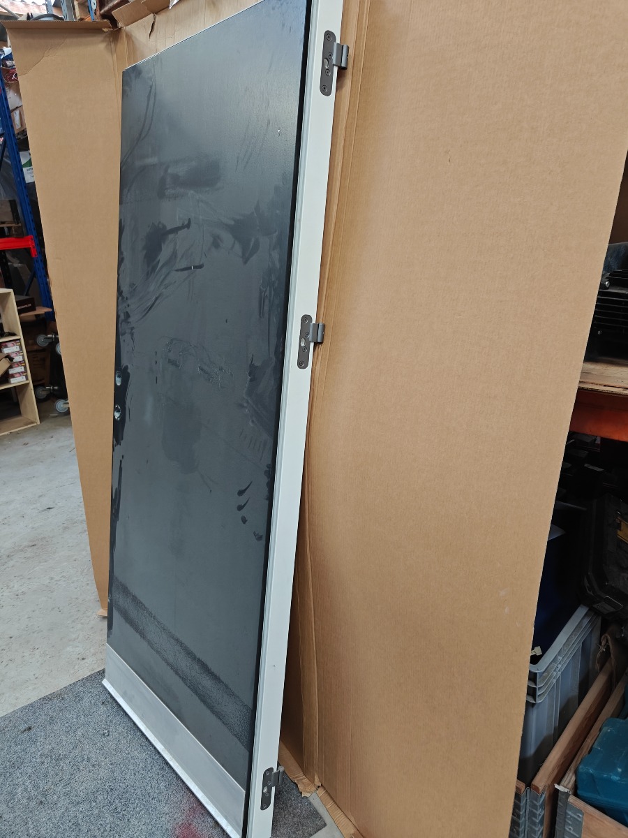 Assa abloy træ dør uden karm,  Antracit grå udv. / hvid indv. 3 x låse pal mål 888 x 2070 x 80 mm små skrammer.