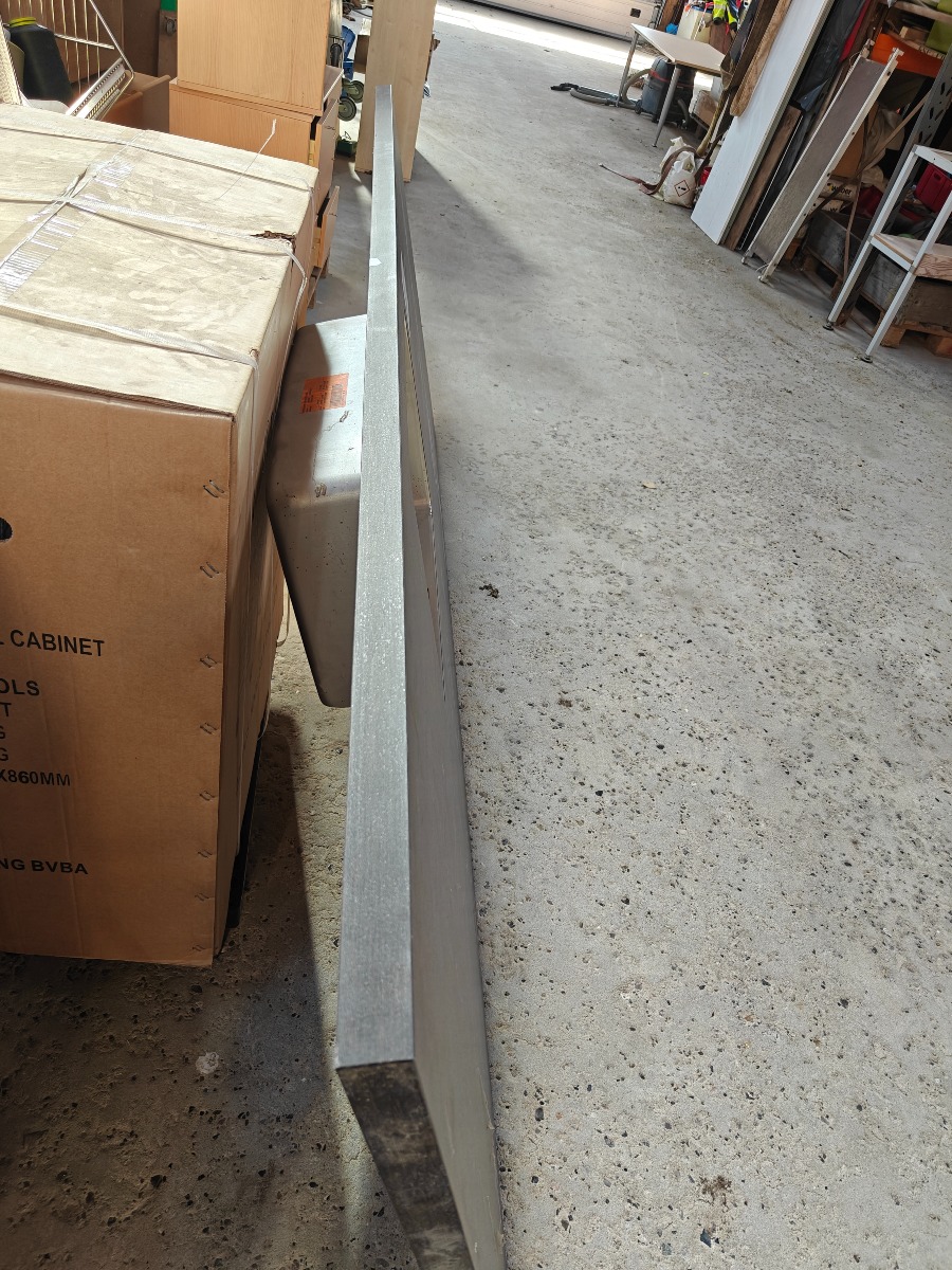 Bordplade til køkken ø med mørk ege laminat måler 965 x 2470 x 40 mm med stålvask,vasken er monteret 8 cm fra fronten og 68 cm ind fra højre side, afløb i vask måler ø 90 mm pæn stand