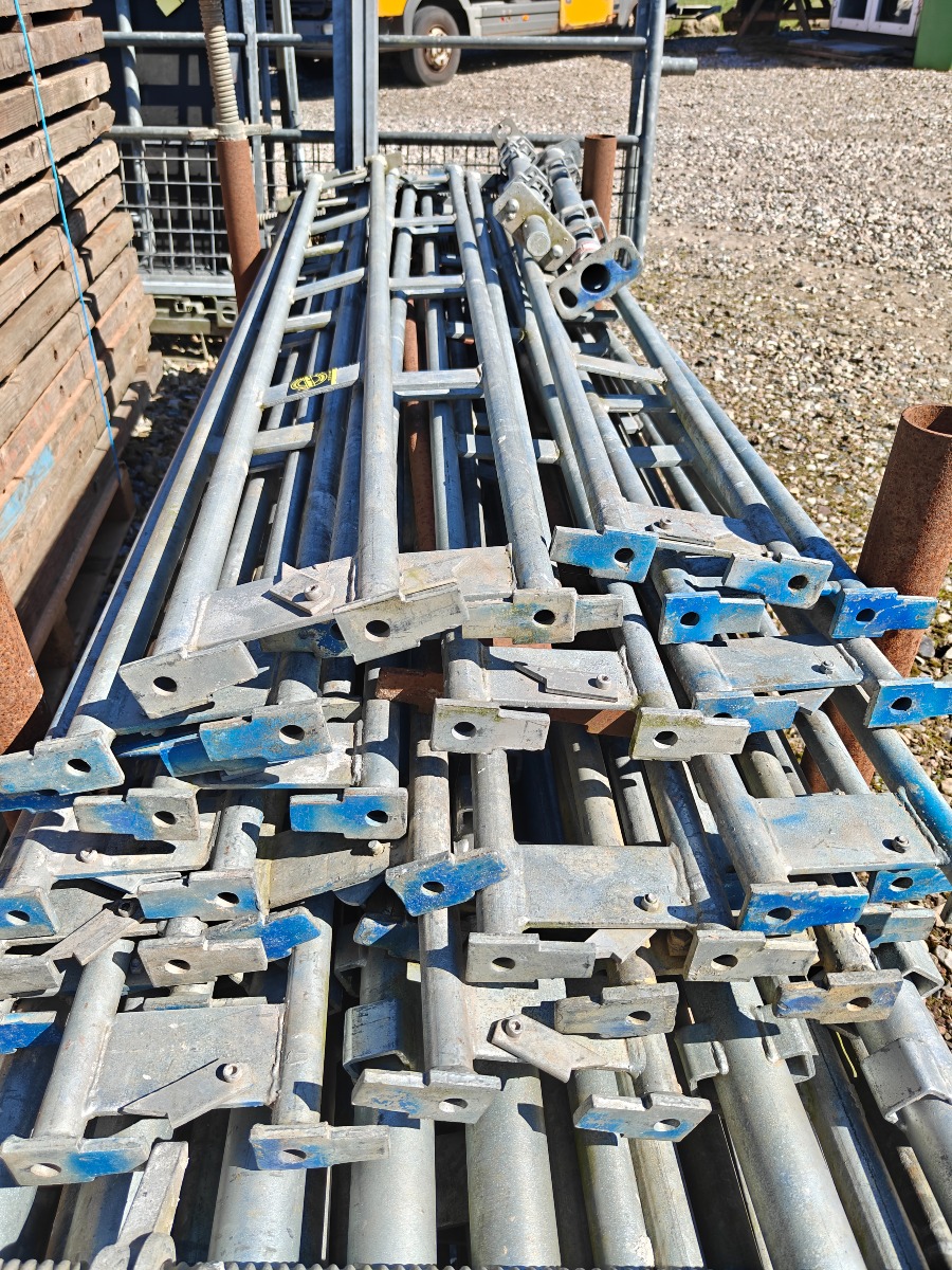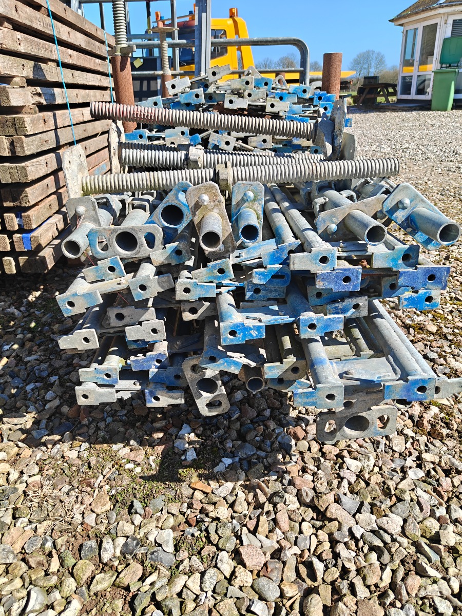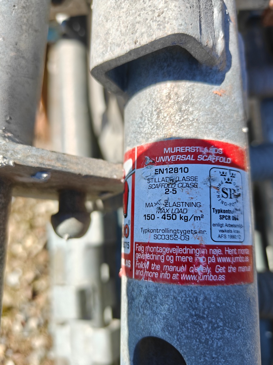 Jumbo murestillads: 24 stk tralle 220 x 35 cm, 12 stk ben 300 cm, 2 stk ben 100 cm, 20 stk tvær stænger 160 cm, 20 stk længde bjælker 300 cm & 10 stk stillads fødder. I god stand