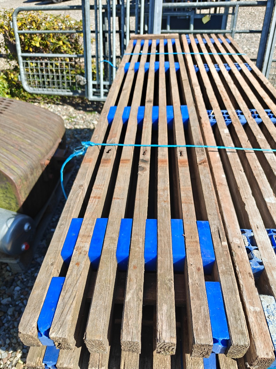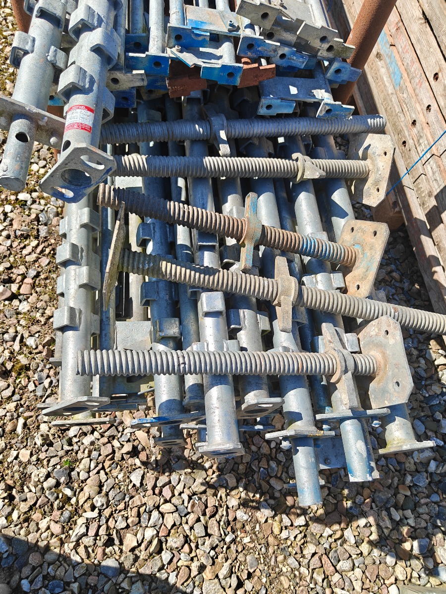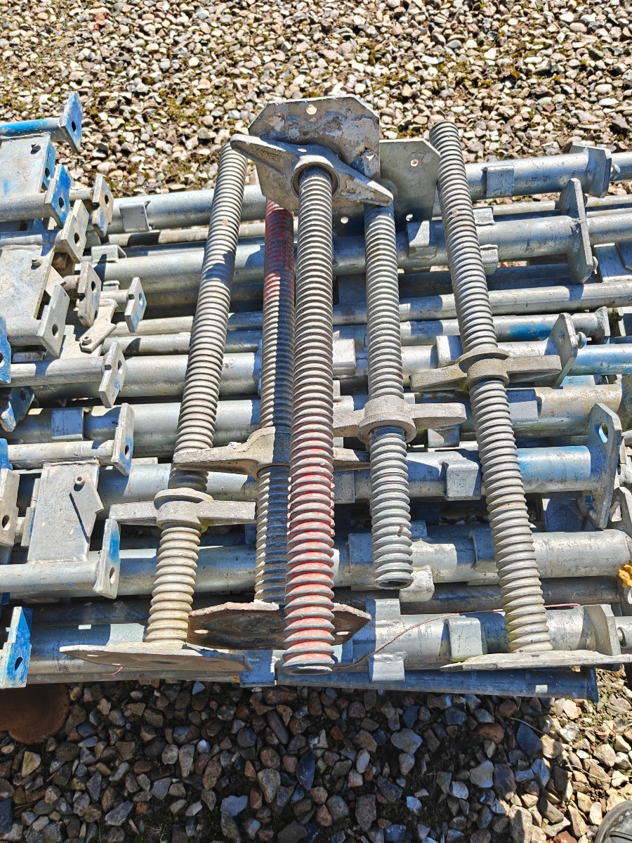 Jumbo murestillads: 24 stk tralle 220 x 35 cm, 12 stk ben 300 cm, 2 stk ben 100 cm, 20 stk tvær stænger 160 cm, 20 stk længde bjælker 300 cm & 10 stk stillads fødder. I god stand