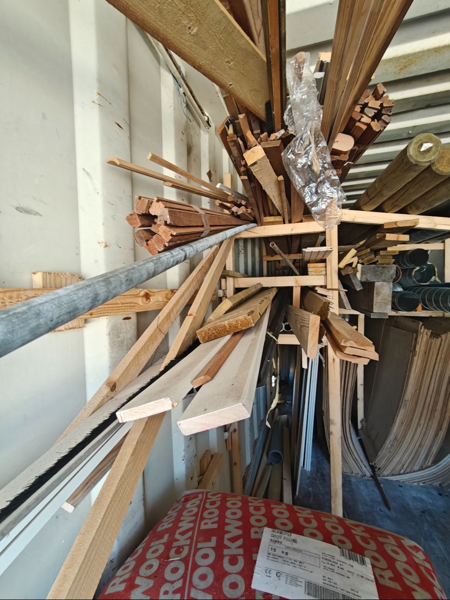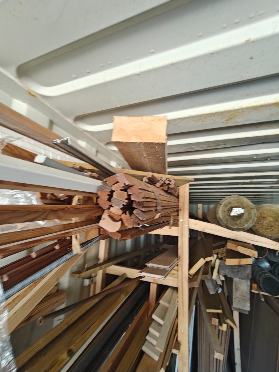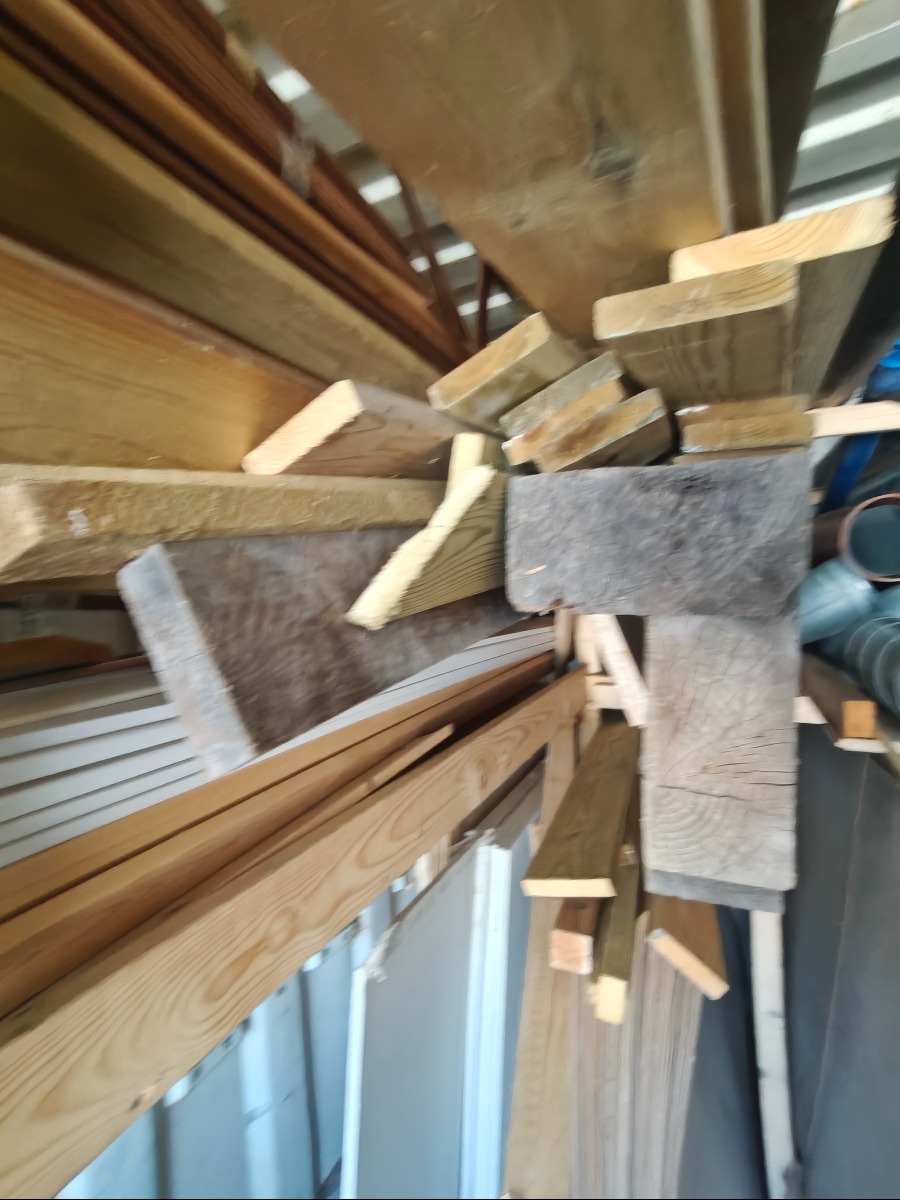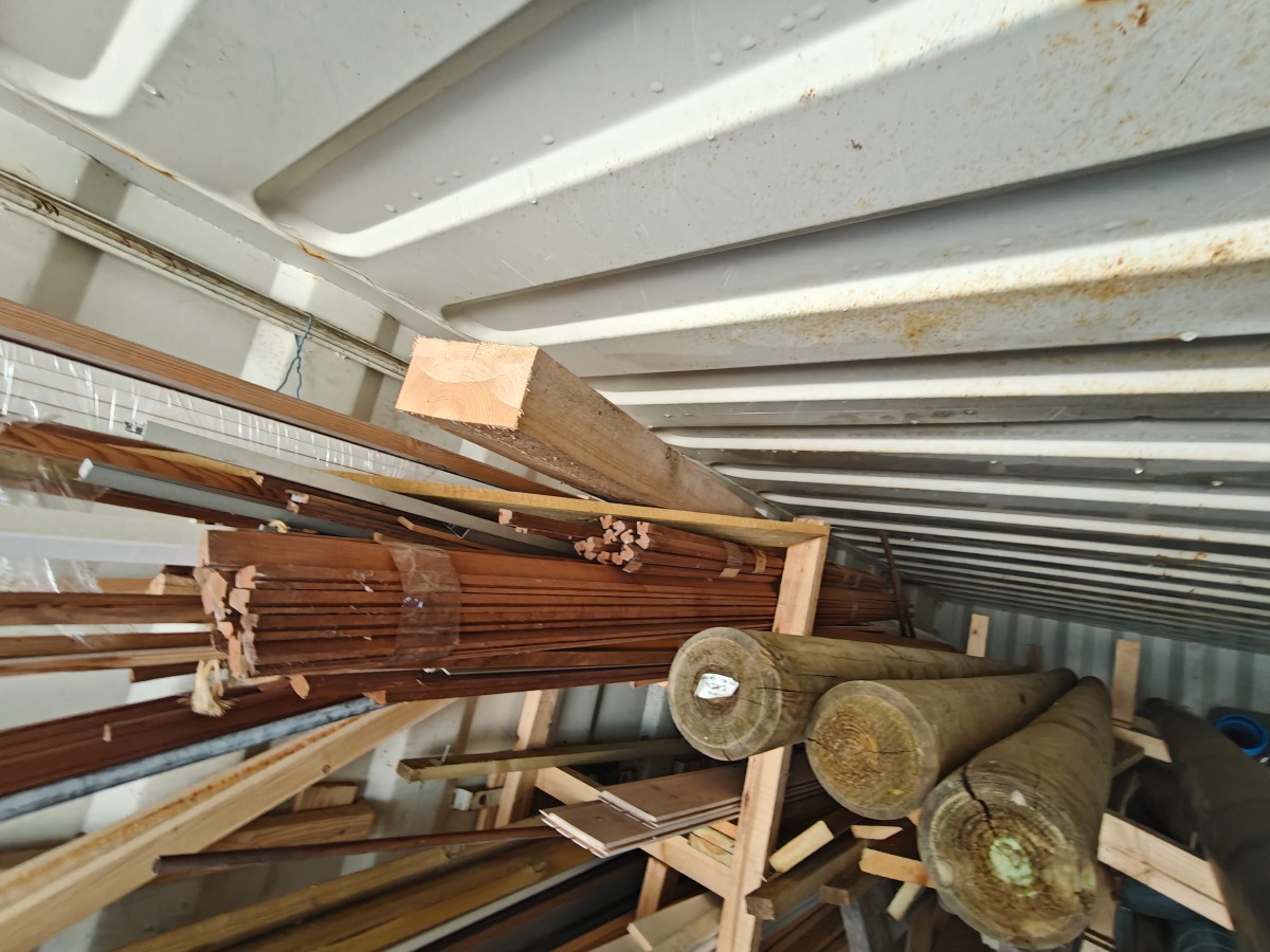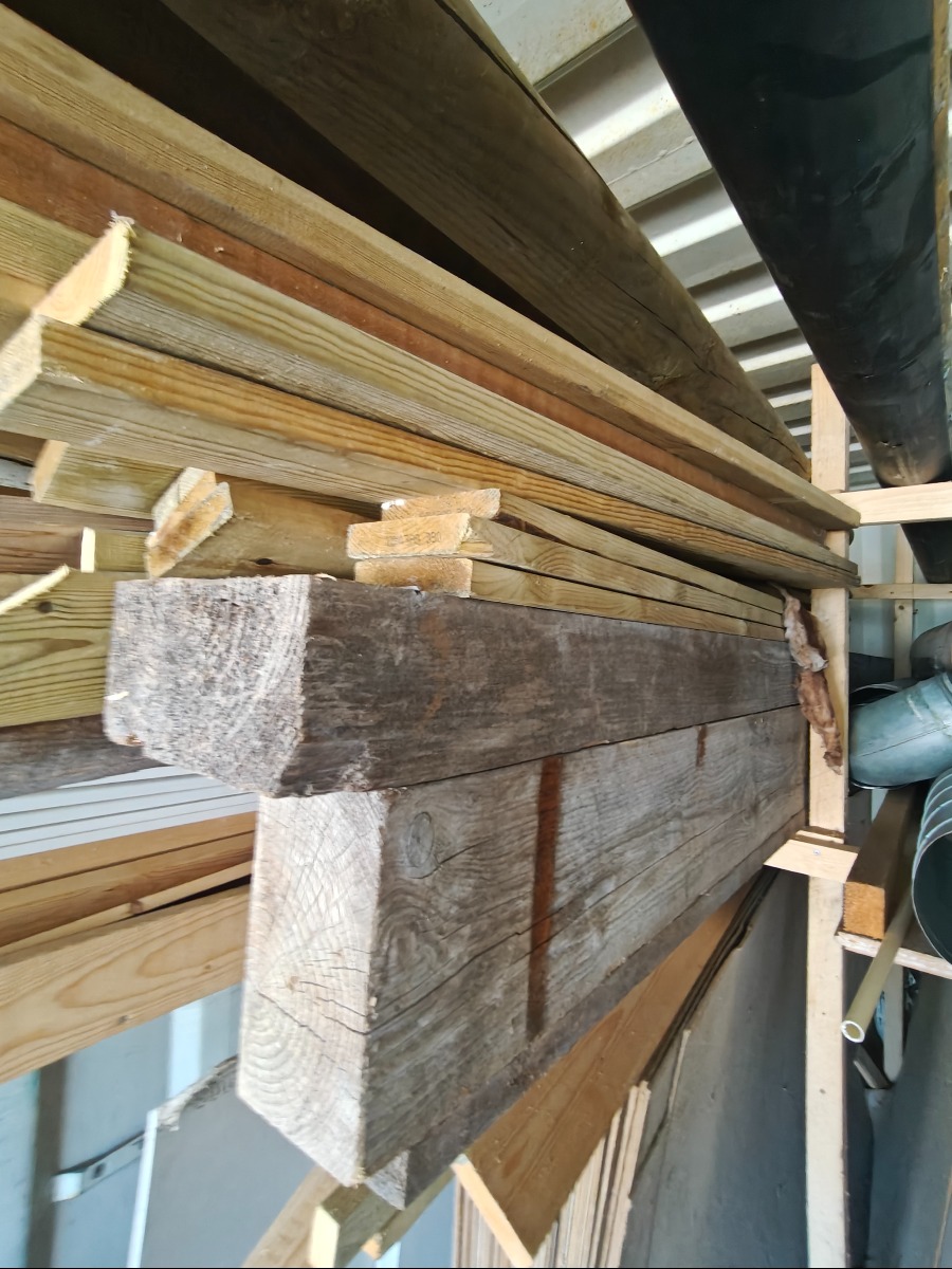Parti lister & brædder, 2 bjælker/ overliggere måler 10 x 20 x 300 cm, 3 stk tryk impreneret træpæle ø 10 x 300 cm, masonit/gipsplader medfølger ikke, har stået i container noget tid