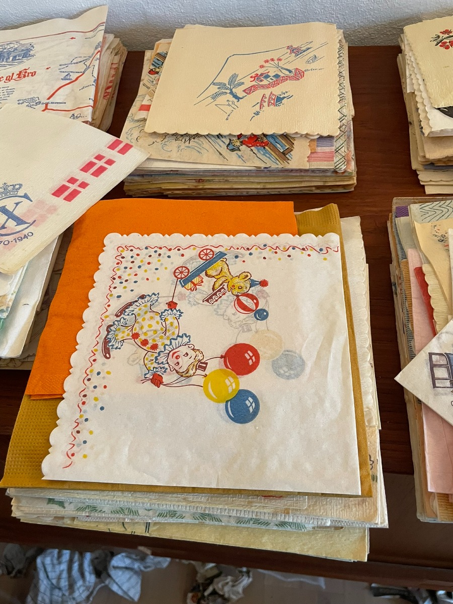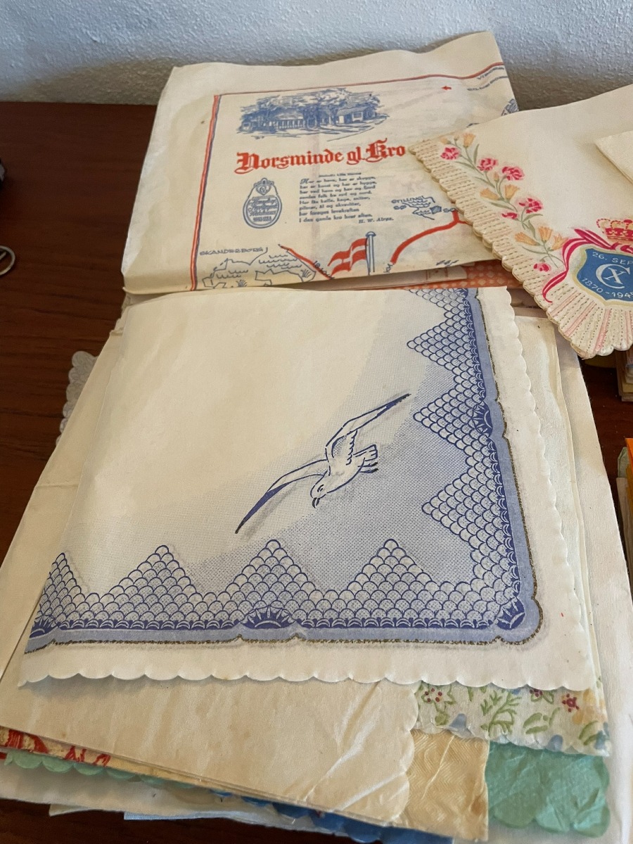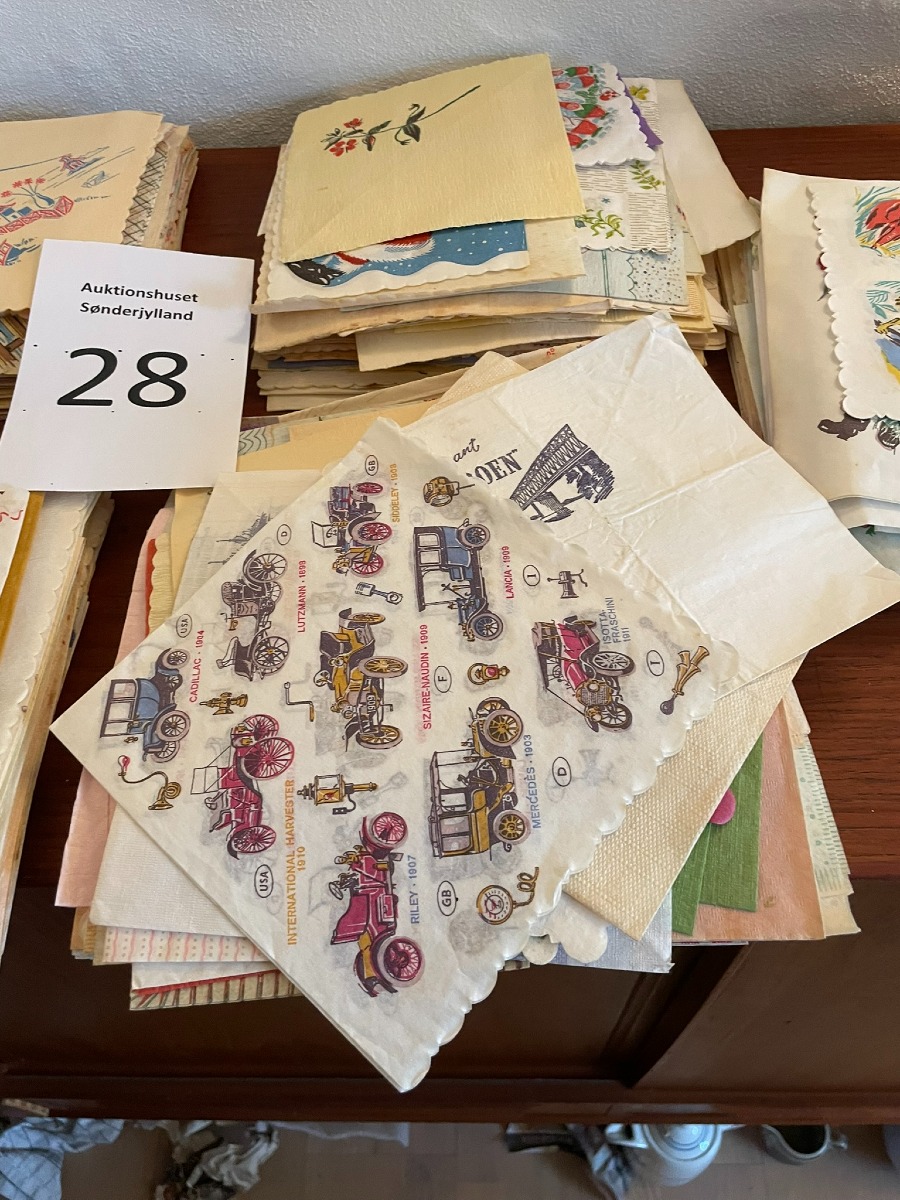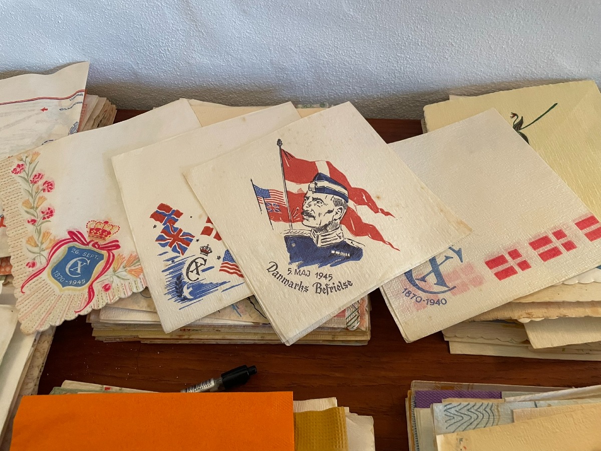 Servietsamling. Ca. 700 servietter. Dubletter forekommer. Enkelte har fugt plamager. Datering: fra omkring 1930 frem til 1980.