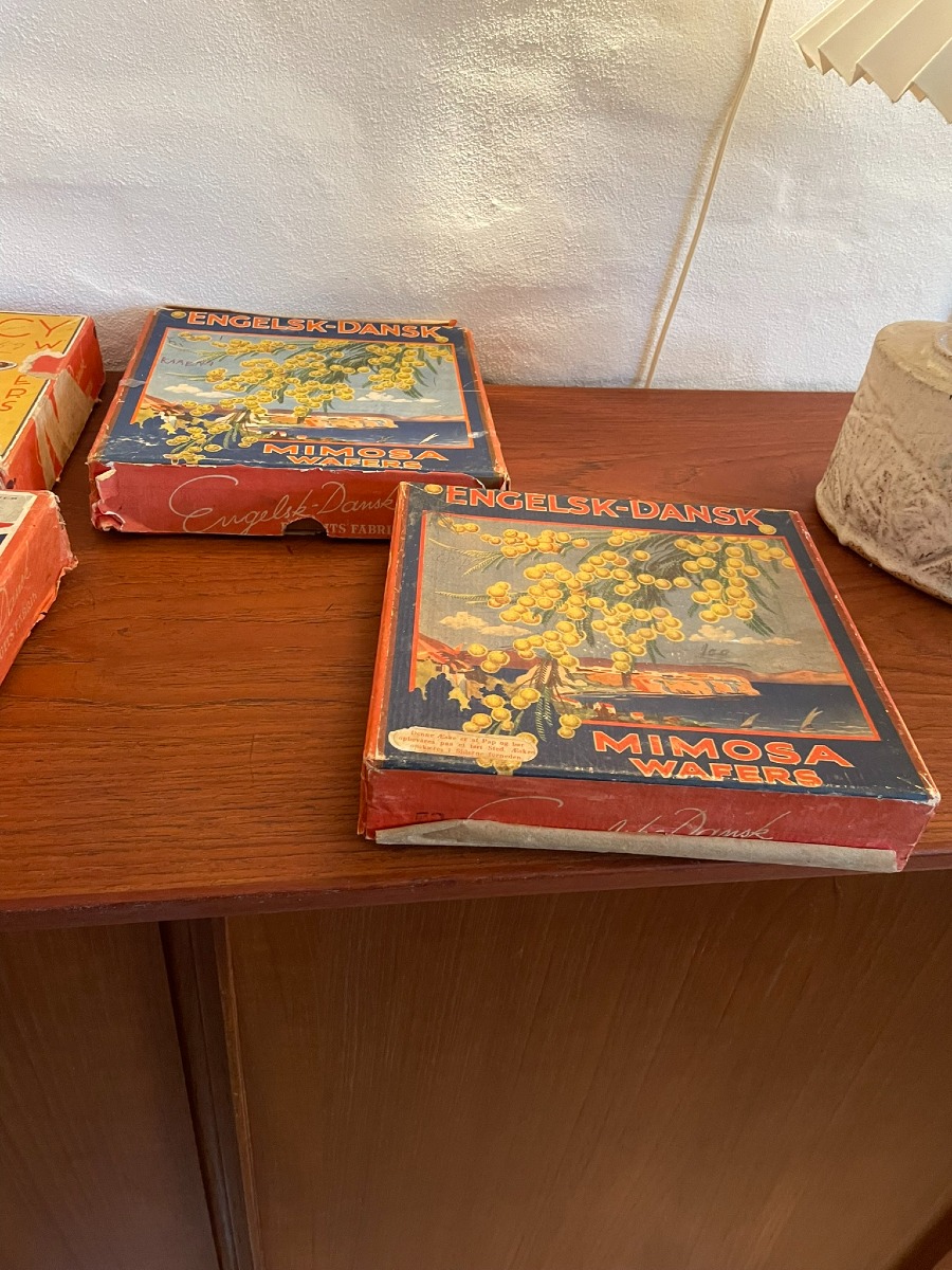 Æsker fra Engelsk – Dansk biscuits fabrik. Datering ca 1930 – 1945. Æskerne har aldersrelaterede brugsspor f.eks. i form af hjørnesamlinger der er gået op. Der er skrevet på æskerne med blyant/ kuglepen.
