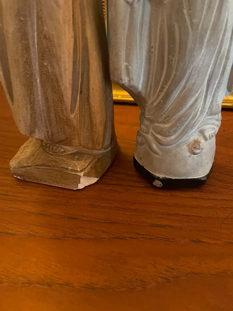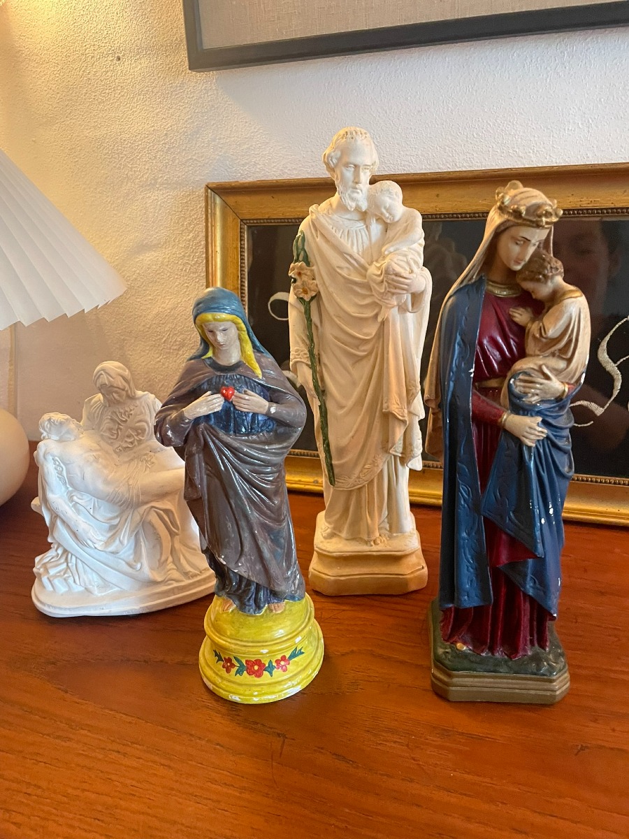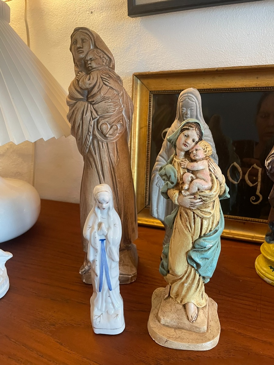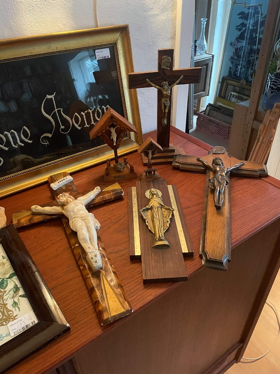 Religiøse artefakter. 2 billeder. 111 x 32 cm samt 20 x 30 cm. 8 Madonna og Jesus figurer i varrierende alder, stand og størrelser. 3 krucifiks i varierende alder, stand og størrelser, 1 madonna relief samt 2 “vejhuse” med kristus.