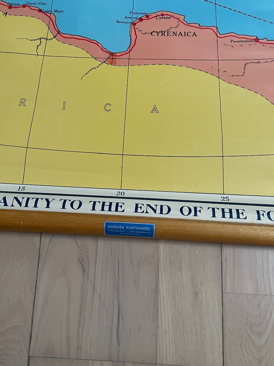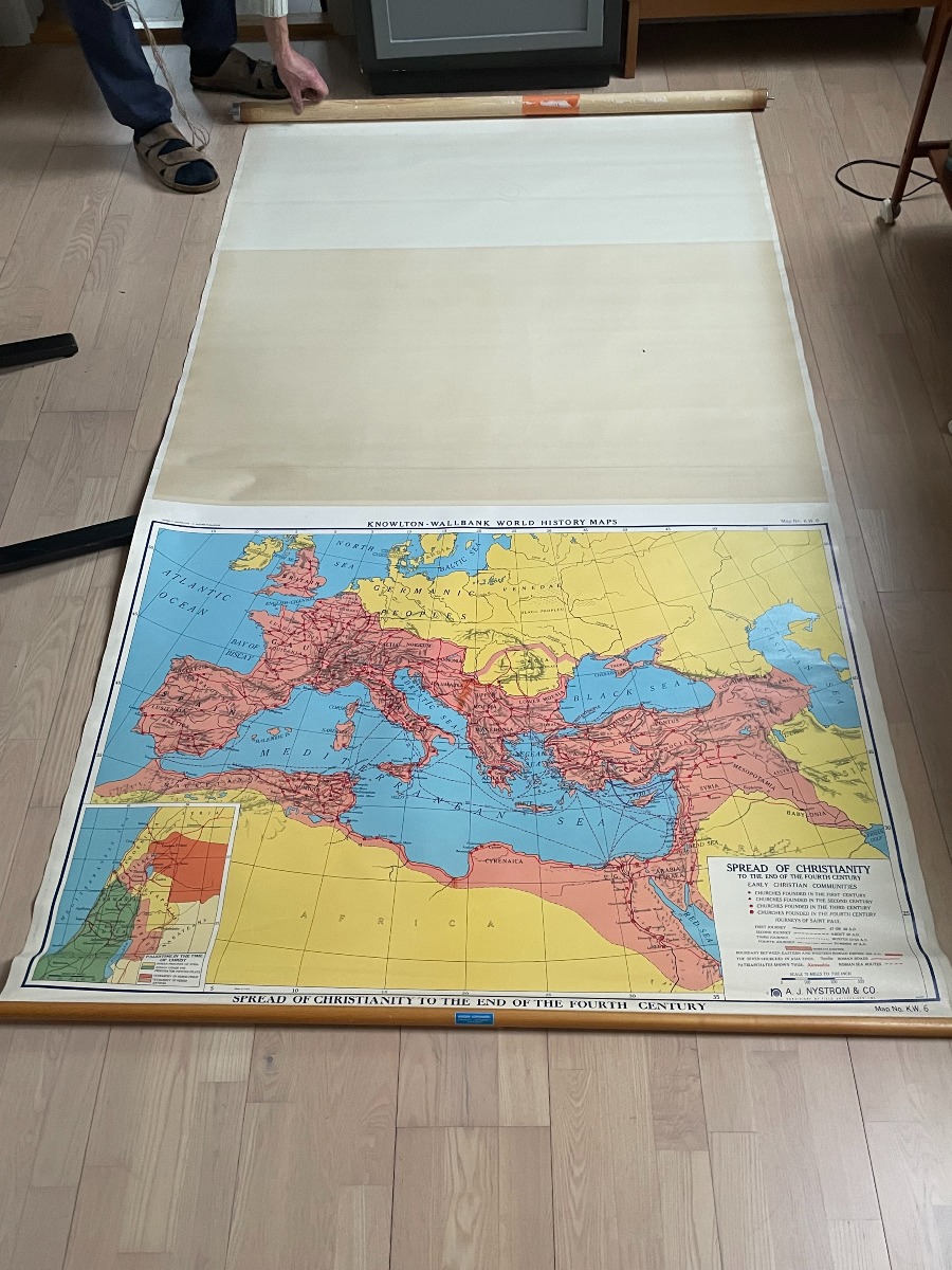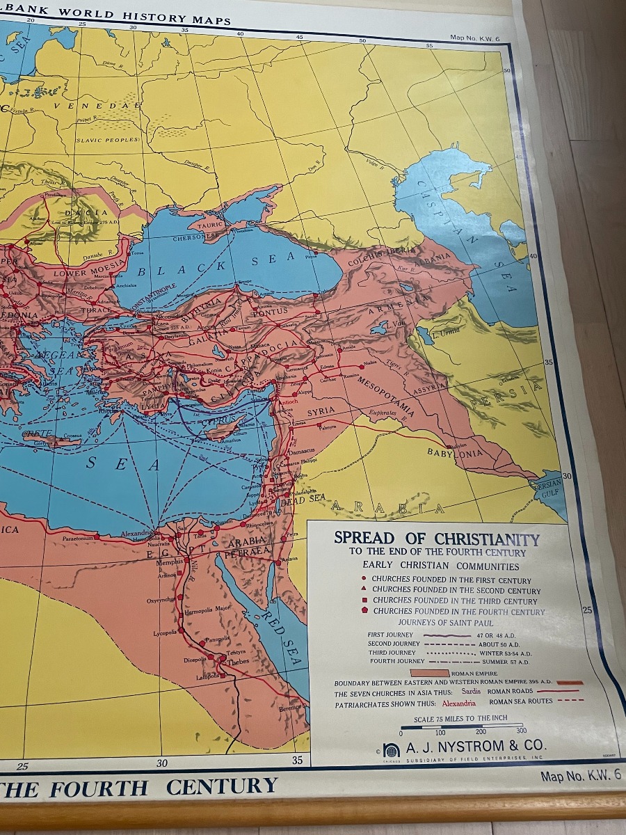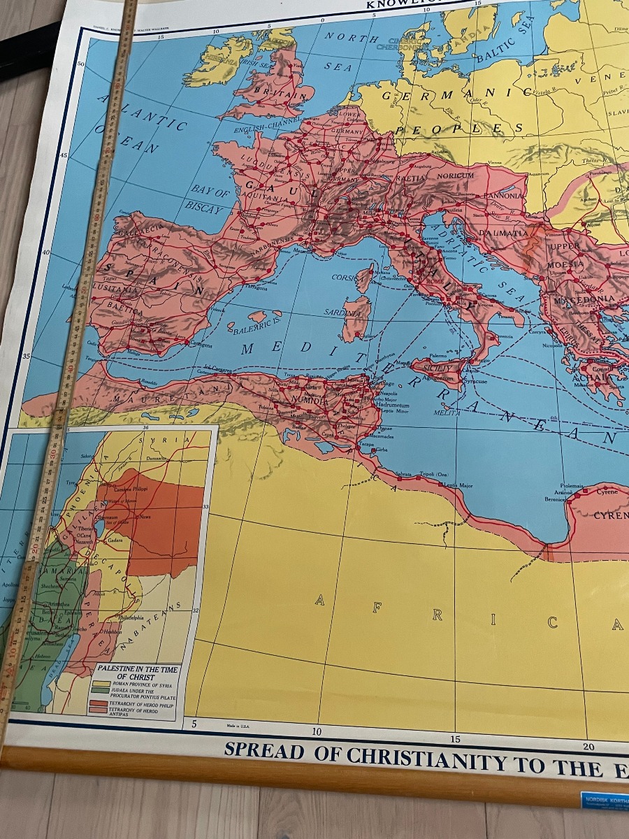 Skolekort. Kristendommens udspredelse i europa og middelhavsområdet år ca 900 e.kr. Knowlton – Wallbank world history maps. Udg. Af A. J. Nystro4m & Co 20cm ca 1955. Fuldt mål 231 x 133 cm. Kortmål 92 x 123 cm.