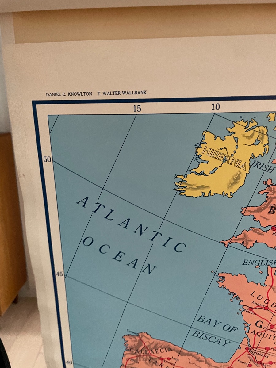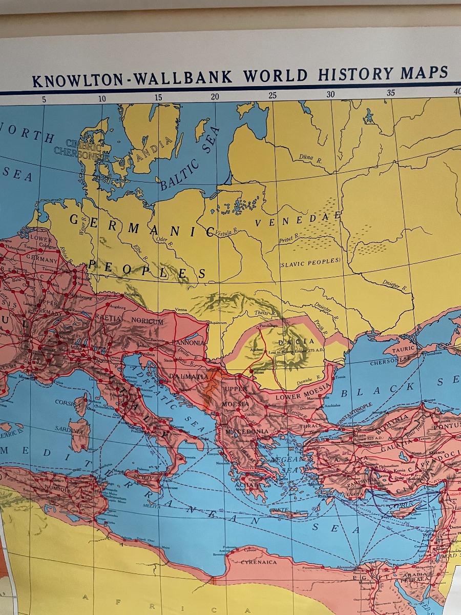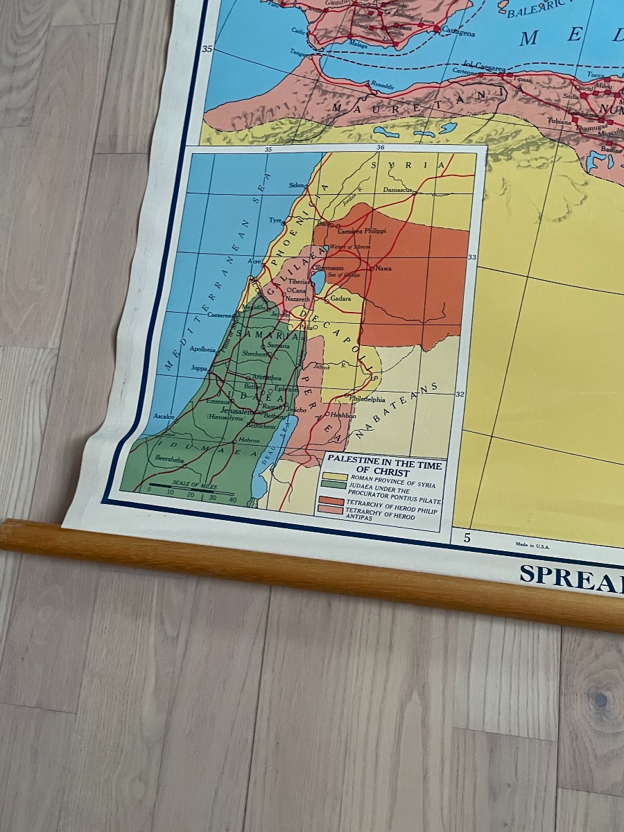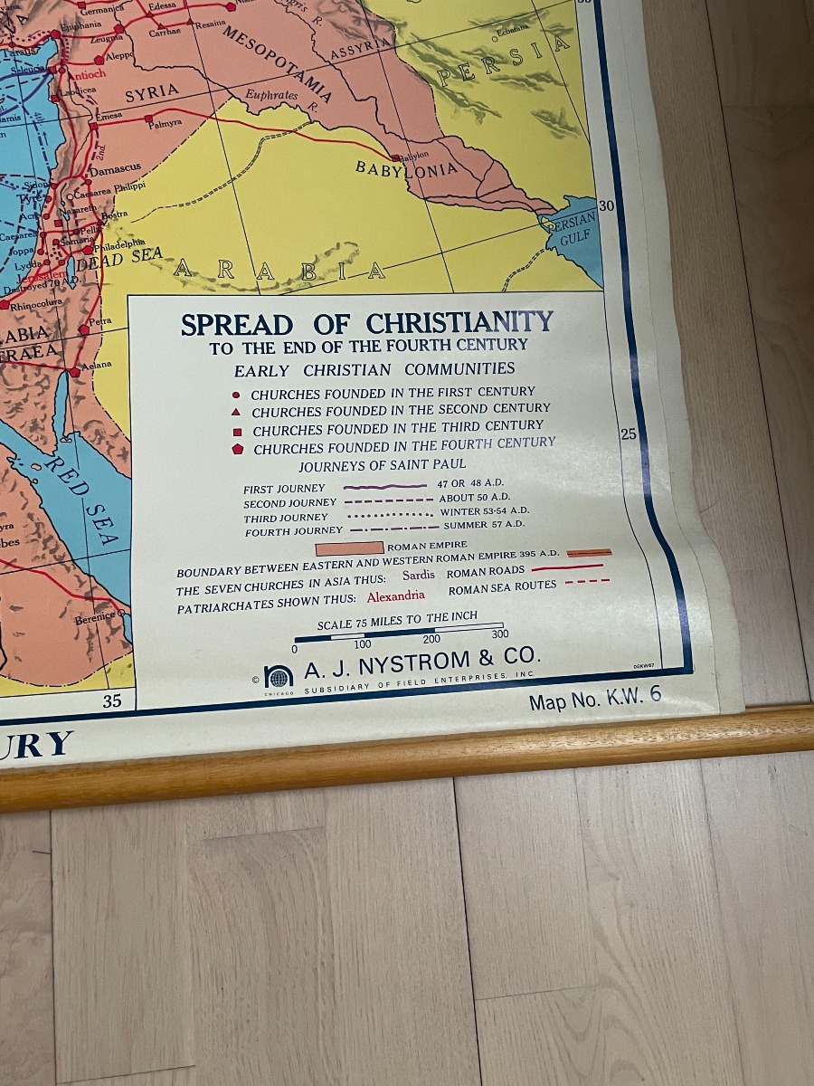 Skolekort. Kristendommens udspredelse i europa og middelhavsområdet år ca 900 e.kr. Knowlton – Wallbank world history maps. Udg. Af A. J. Nystro4m & Co 20cm ca 1955. Fuldt mål 231 x 133 cm. Kortmål 92 x 123 cm.