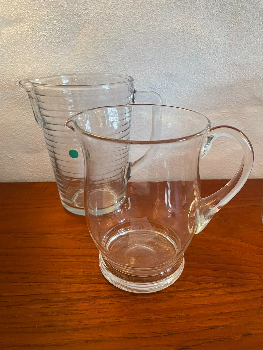 7 glaskander. 2 fra Holmegaard, 2 fra Fyns Glasværk heri blandt 2 af serien Nanna, 1 polsk Krosno kande samt 2 ældre glas kander