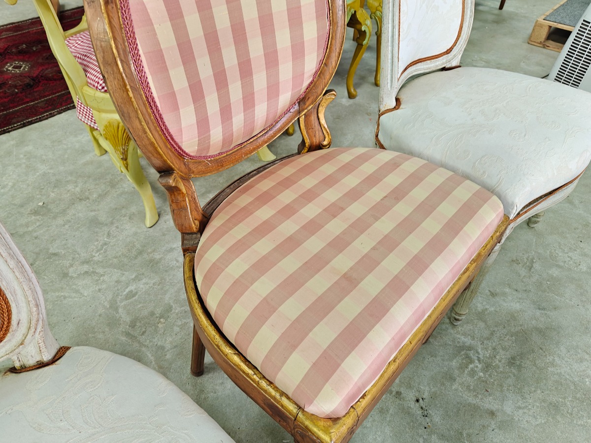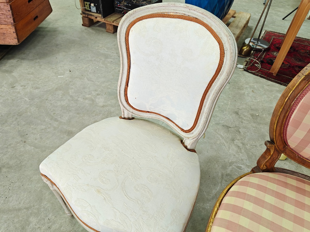 Gustaviansk stil 3 stole. 2 hvidmalede og med lys montering. 1 med delvist forgyldt stel og monteret med terne taft.