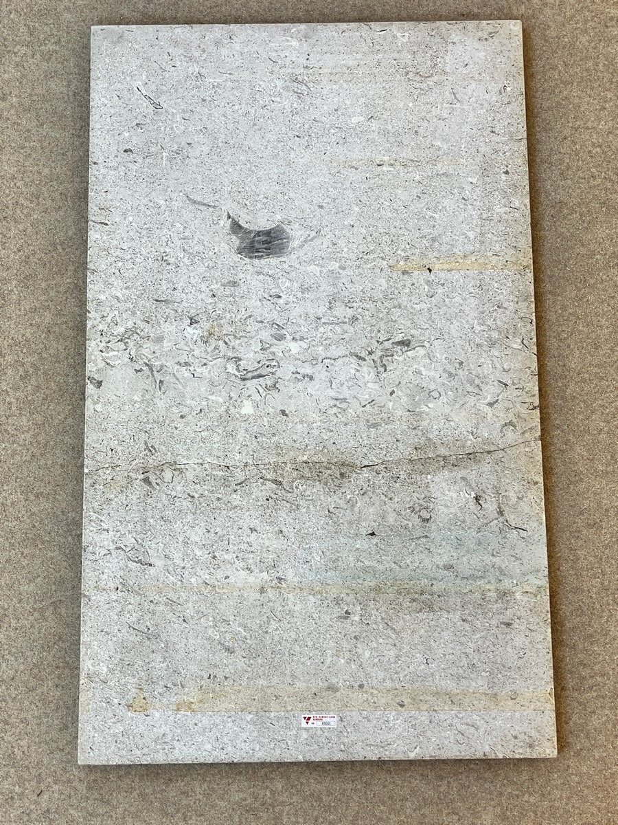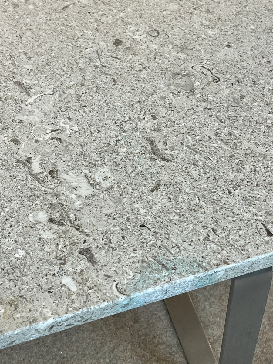 Hans J. Wegner JH808 sofabord. Stel af stål med medeben. Løs plade af antageligt grå kalksten. Pladen er med gennemgående revne. Møblet er udgået fra Den Danske Bank i Hamborg. Fremstillet hos Johannes Hansen Møbler. H. 42, B. 170, D. 70 cm.