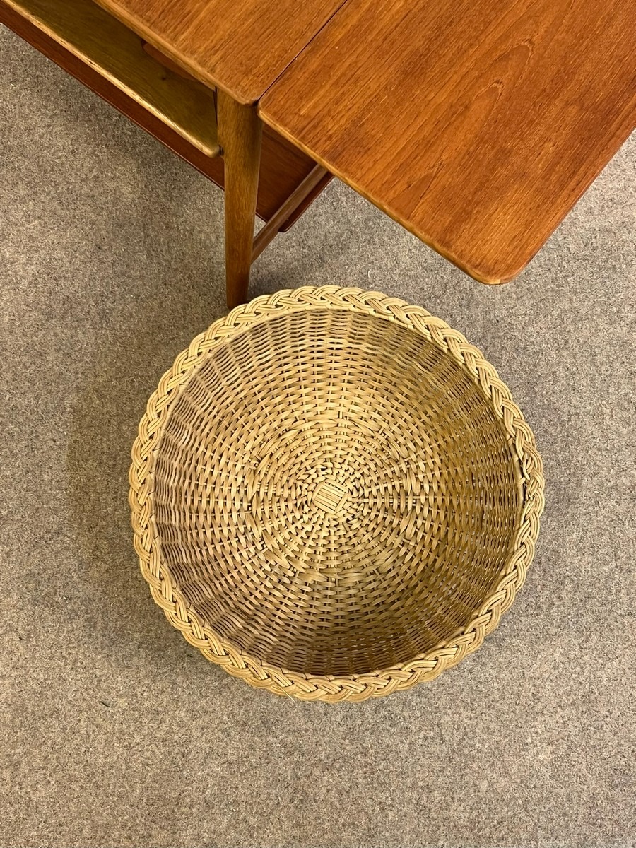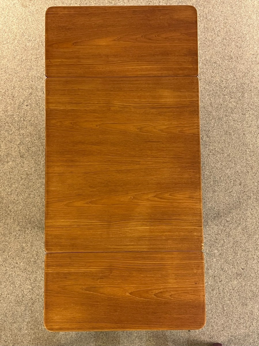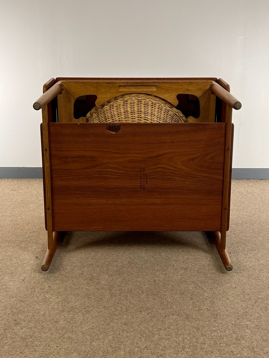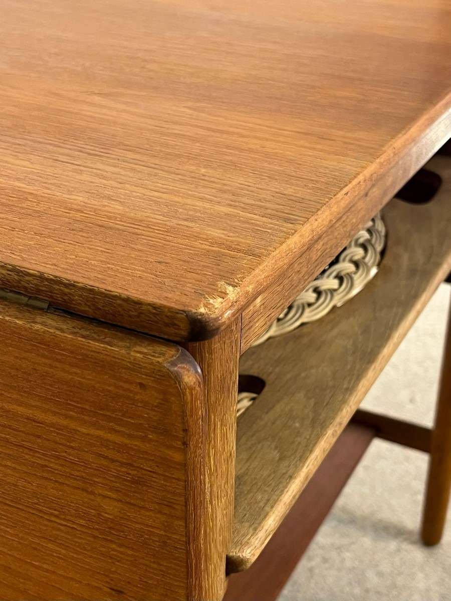 Hans J. Wegner sybord af teak og eg. Fremstillet hos Andreas Tuck. Fremstår velholdt, dog med mindre skade på topplade i ene hjørne. Skuffe mangler. H. 60, B. 64/117 cm. D. 57 cm.