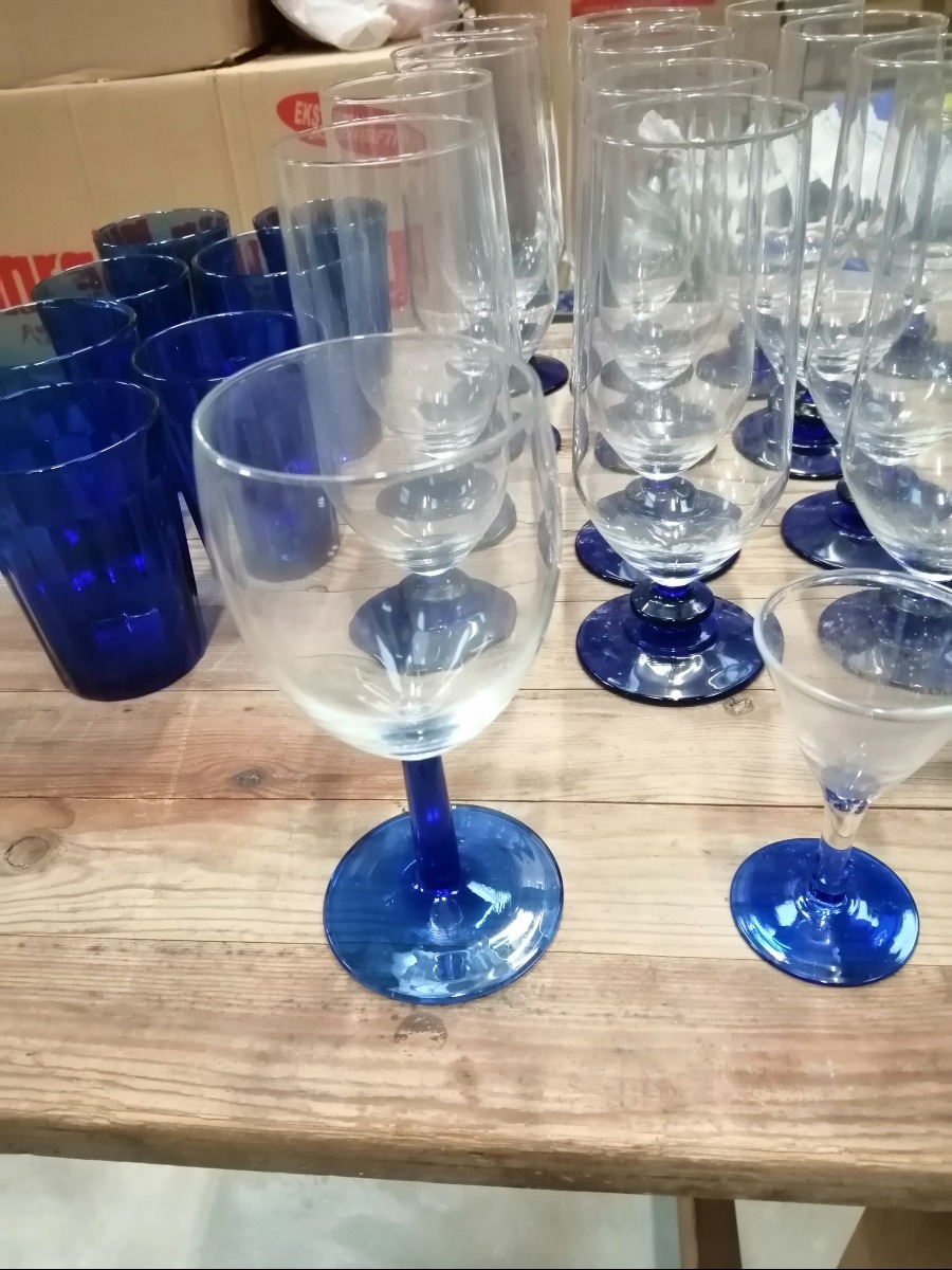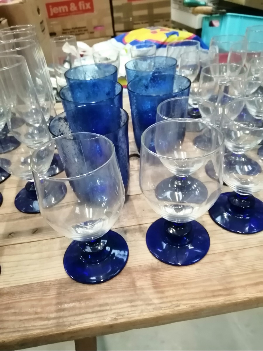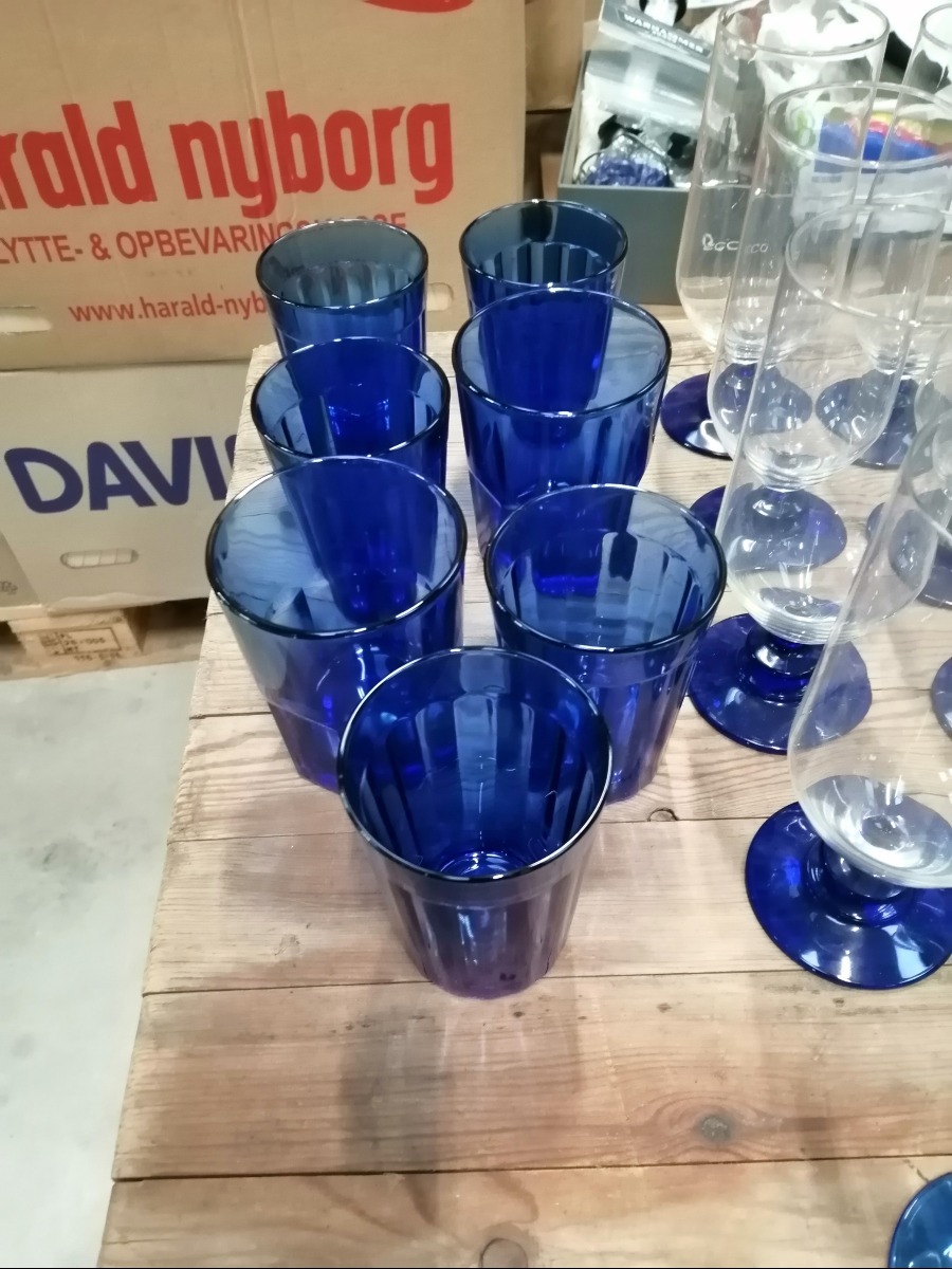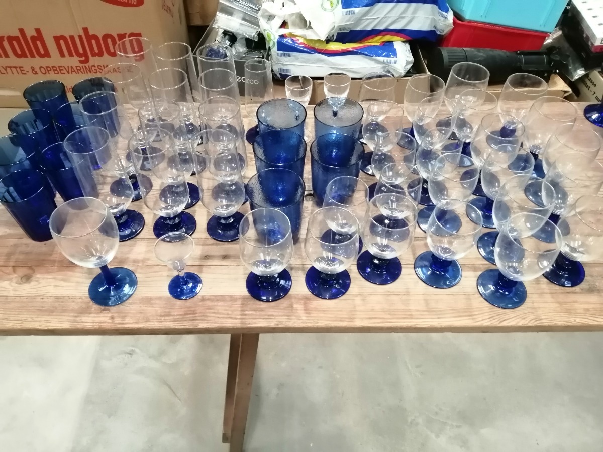 Blå glas, en samling af forskellige vaser, glas, skåle og lysestager.