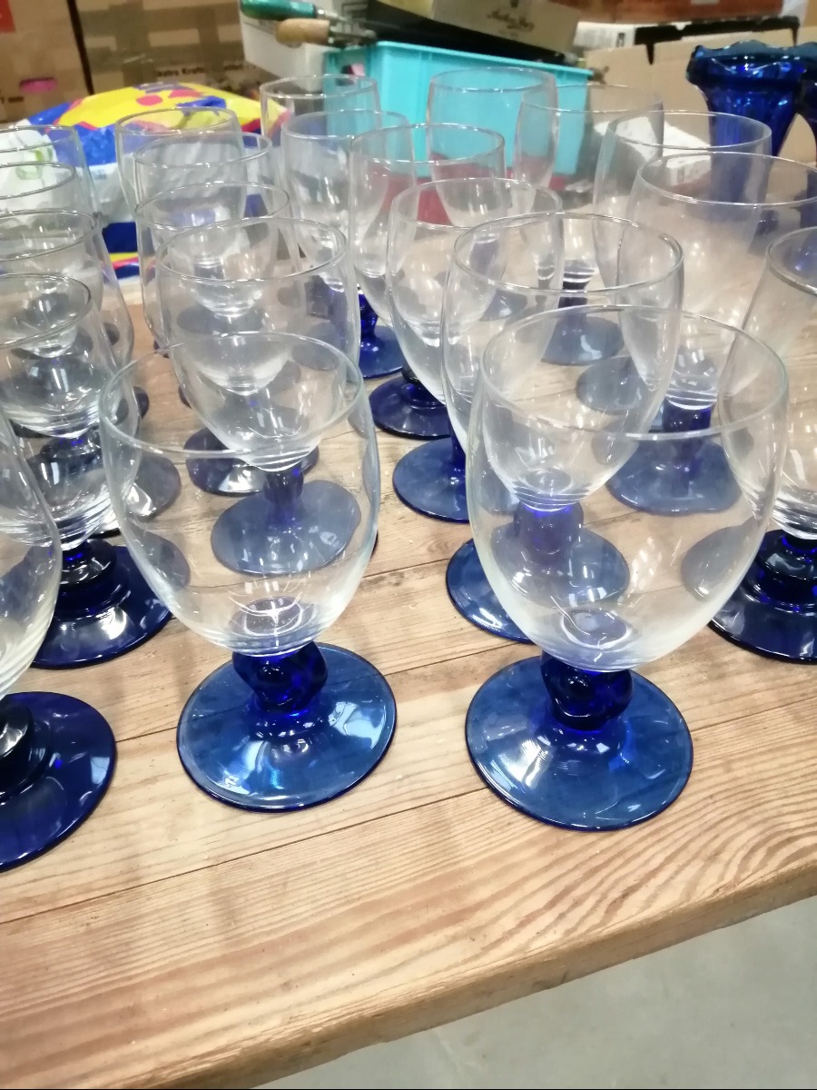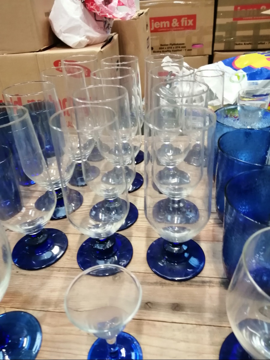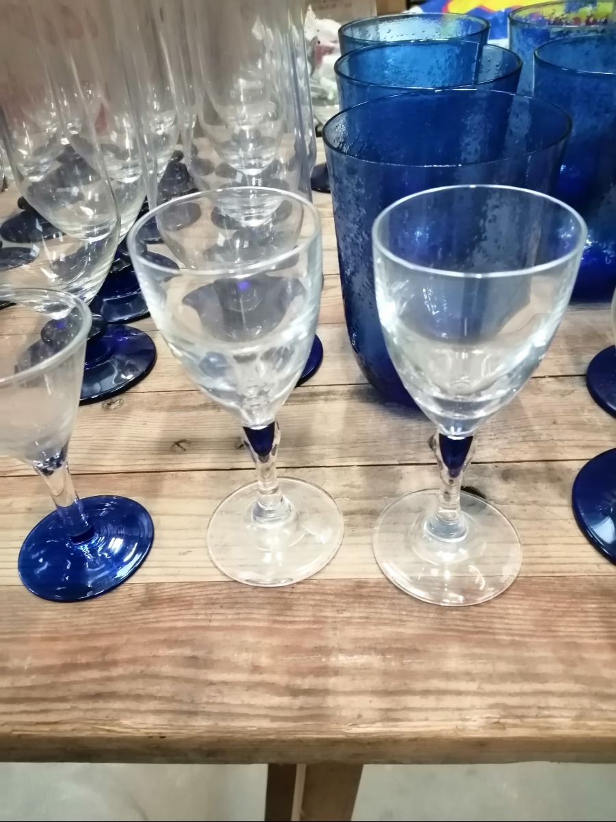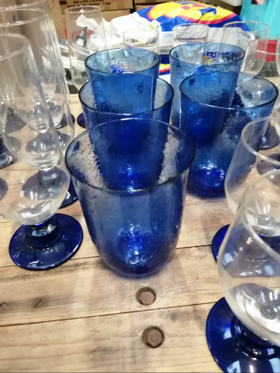 Blå glas, en samling af forskellige vaser, glas, skåle og lysestager.