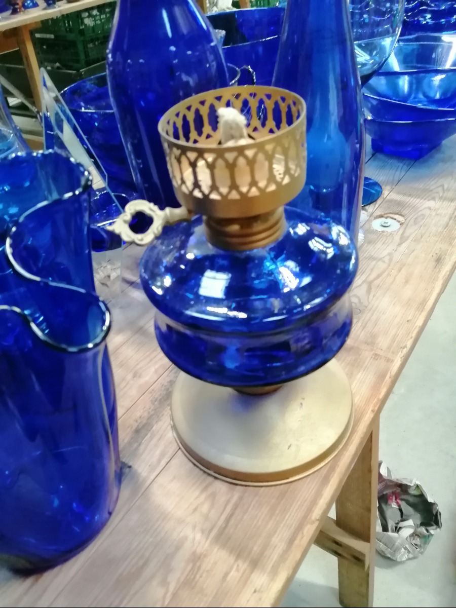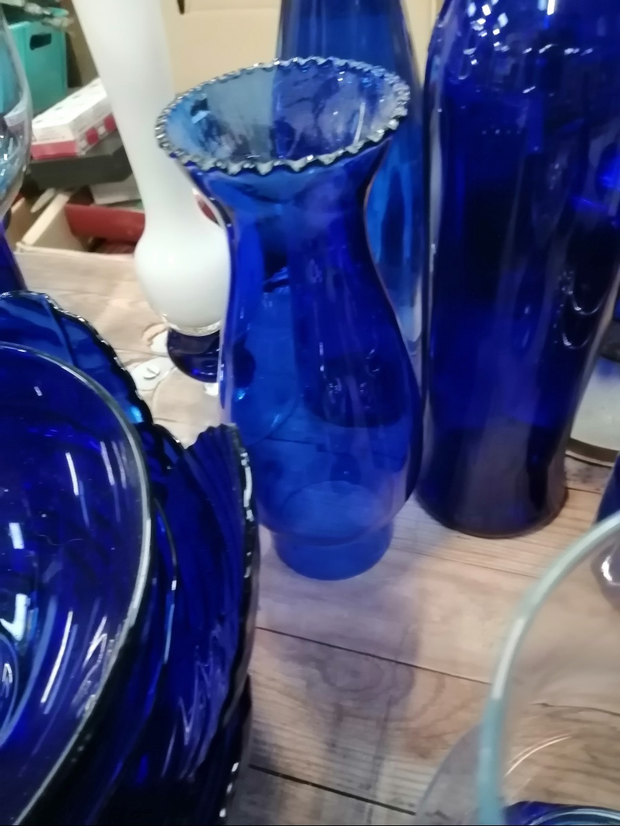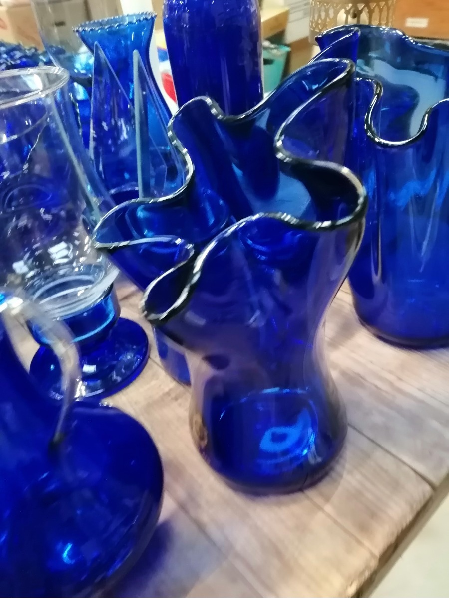 Blå glas, en samling af forskellige vaser, glas, skåle og lysestager.