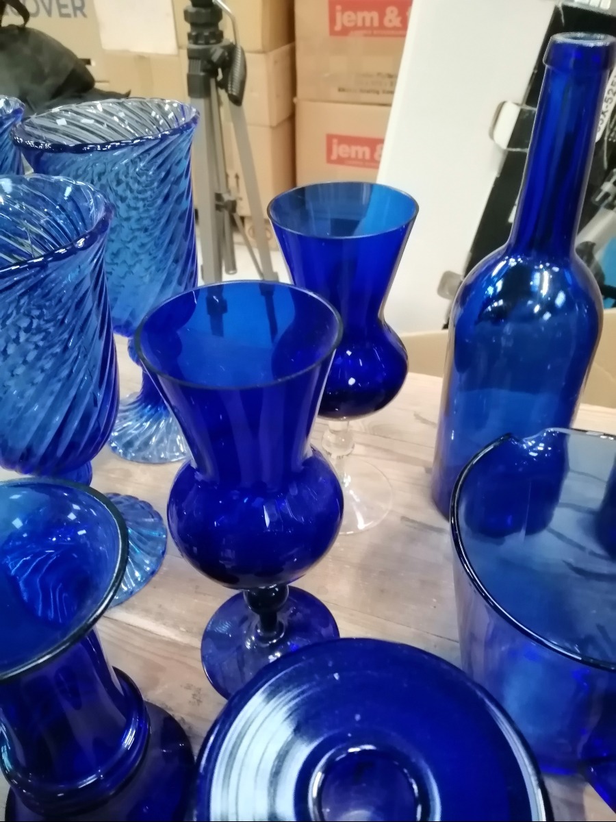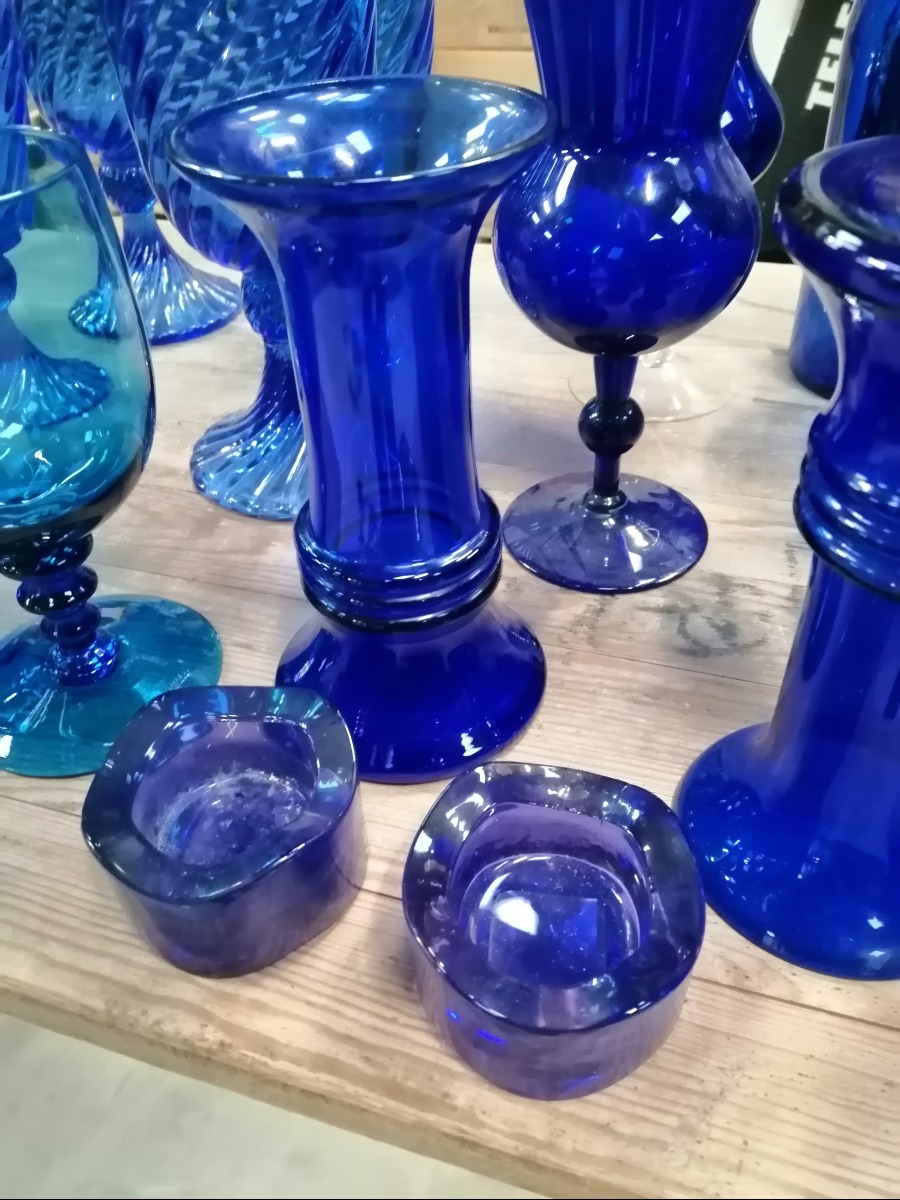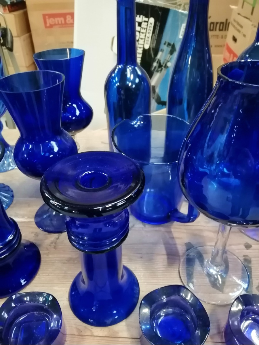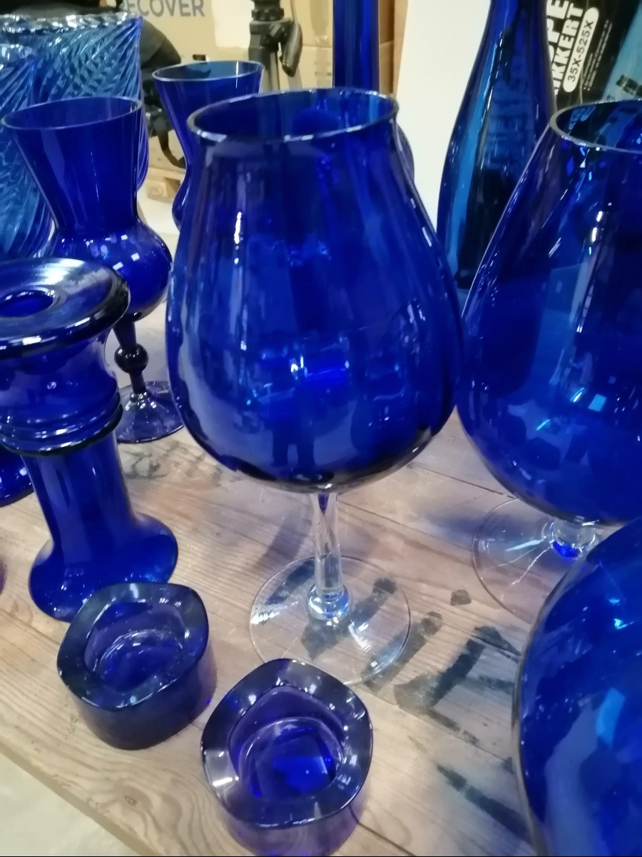 Blå glas, en samling af forskellige vaser, glas, skåle og lysestager.