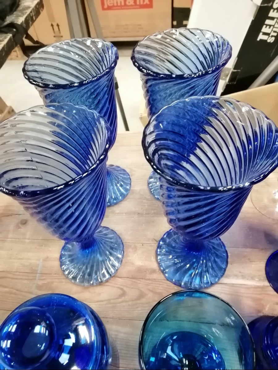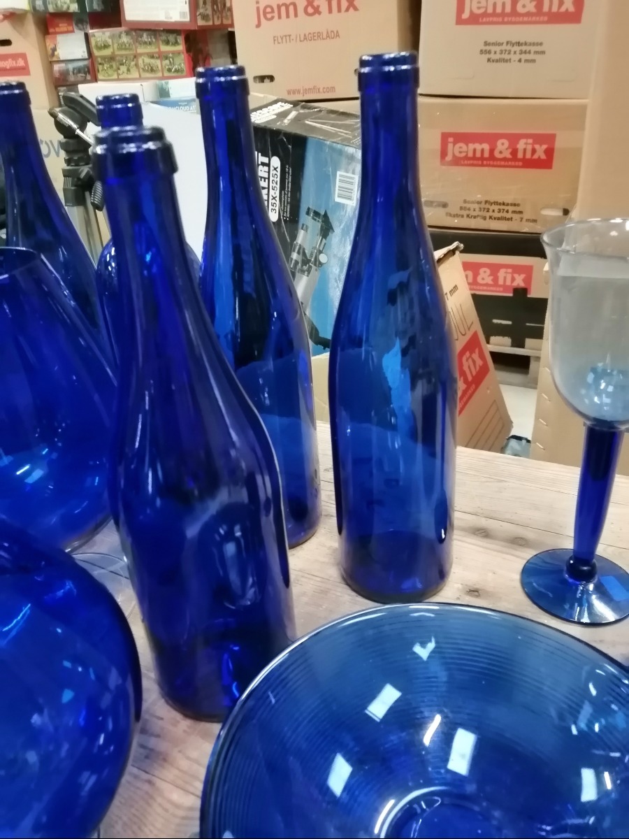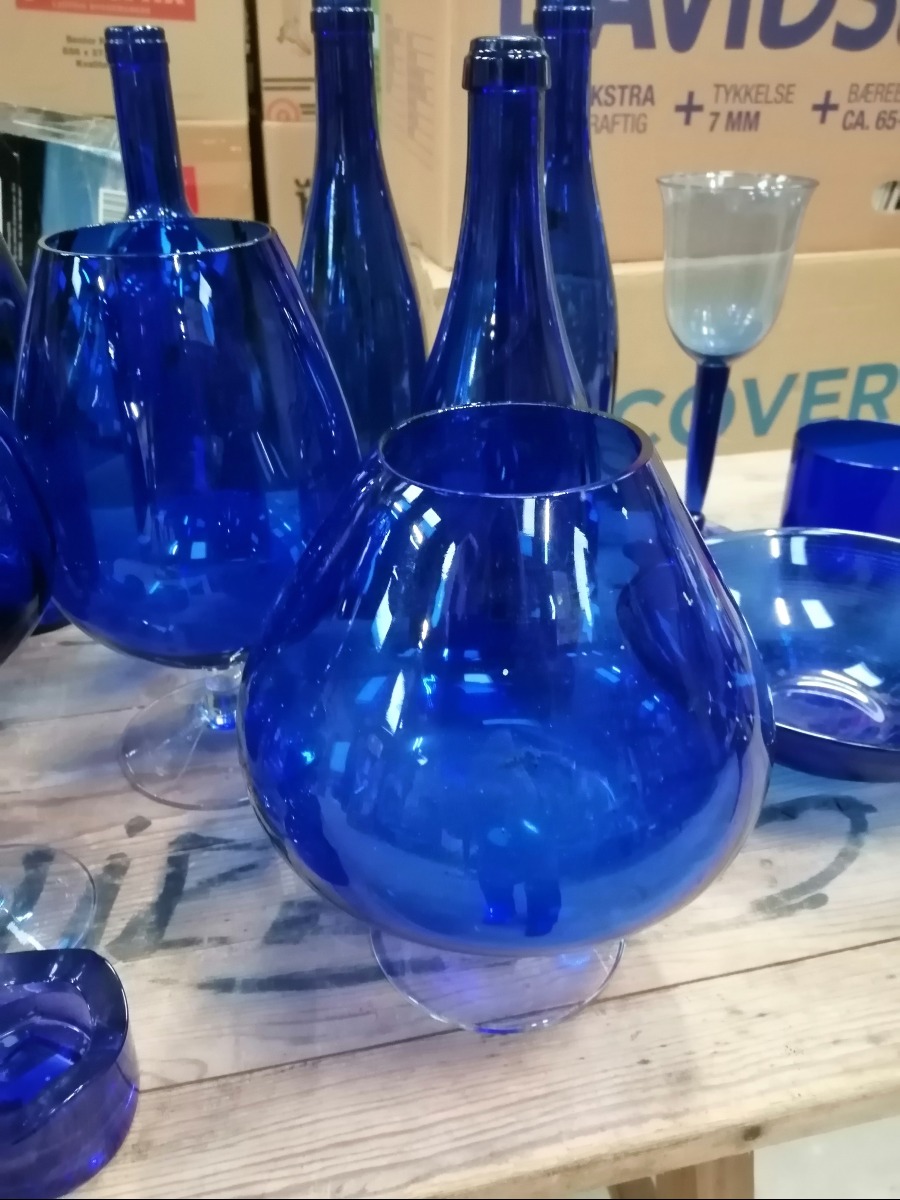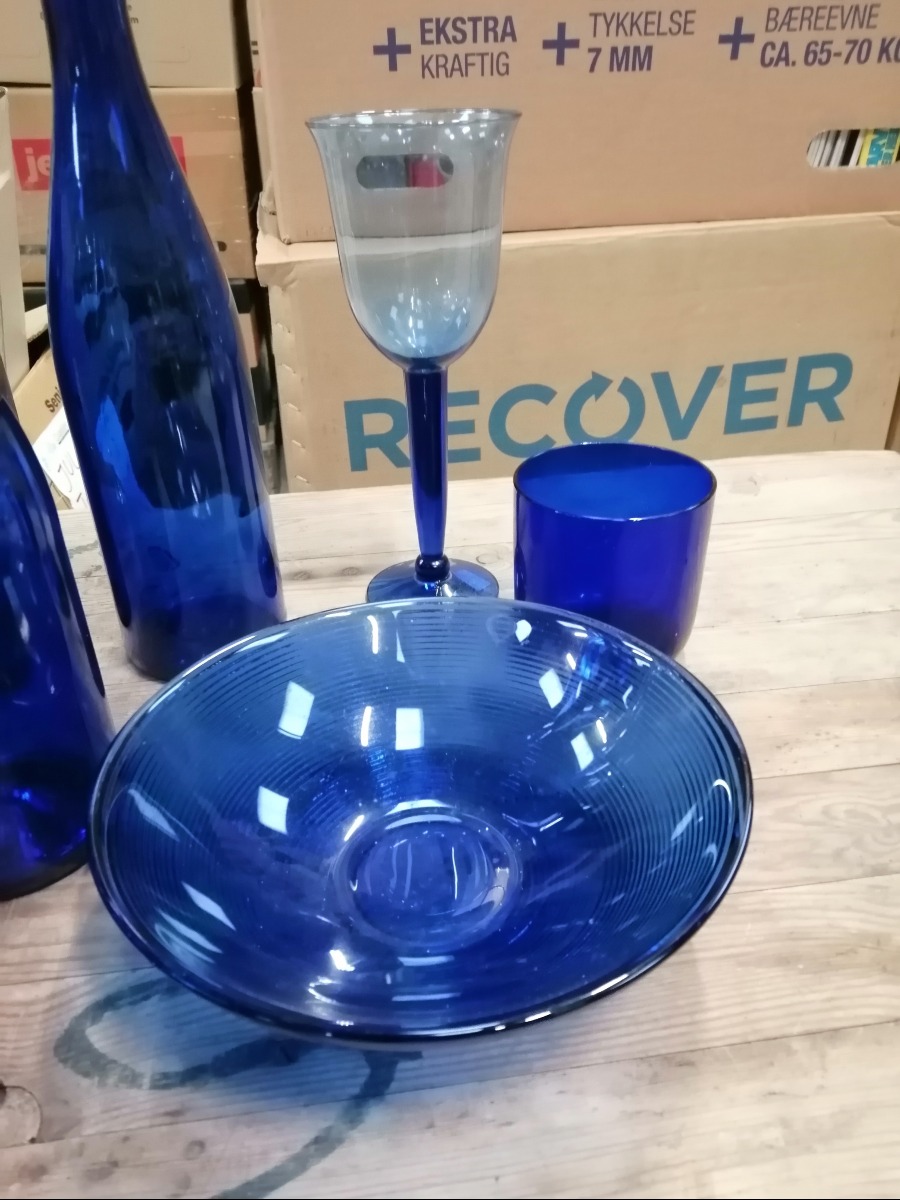 Blå glas, en samling af forskellige vaser, glas, skåle og lysestager.