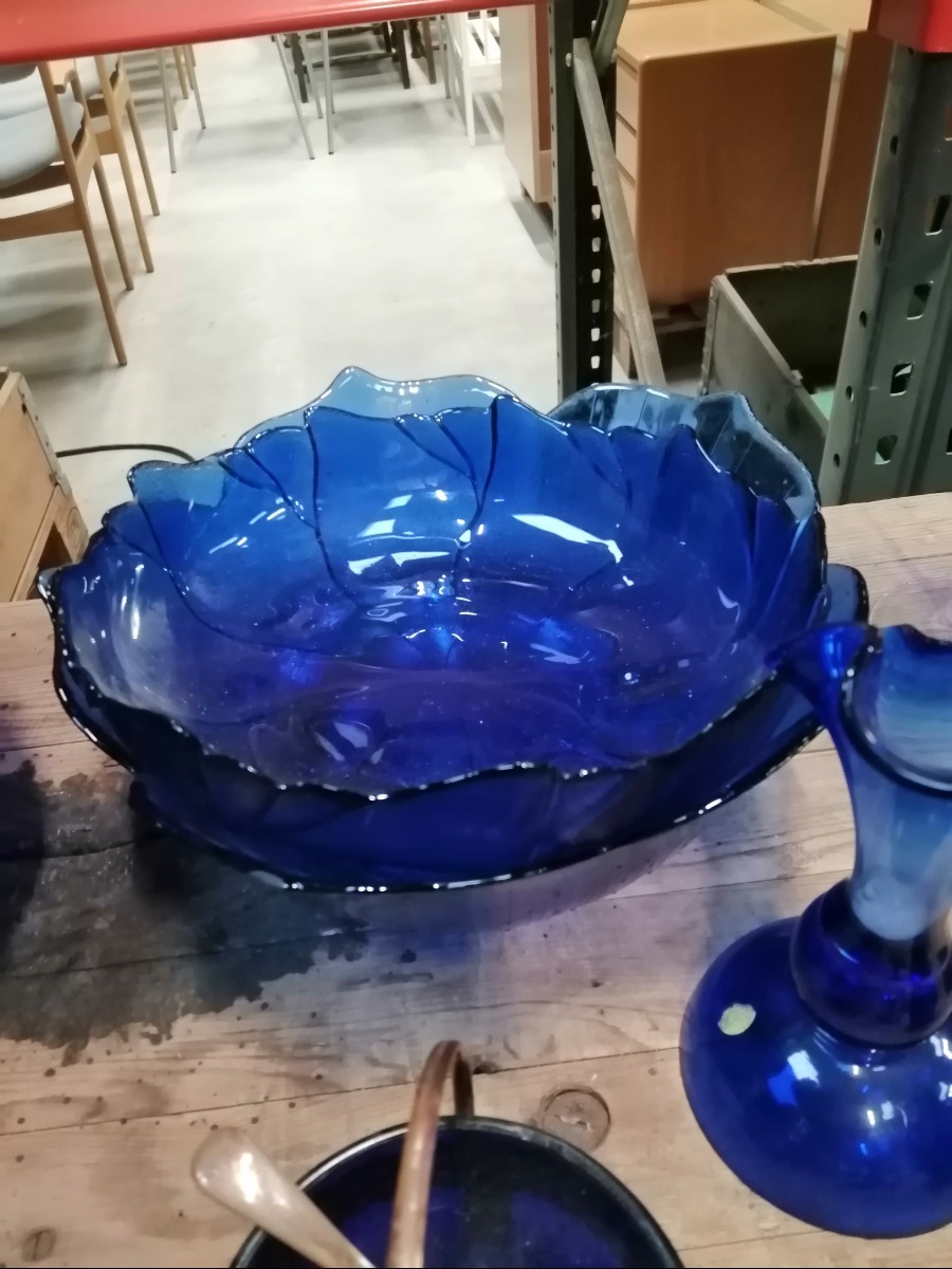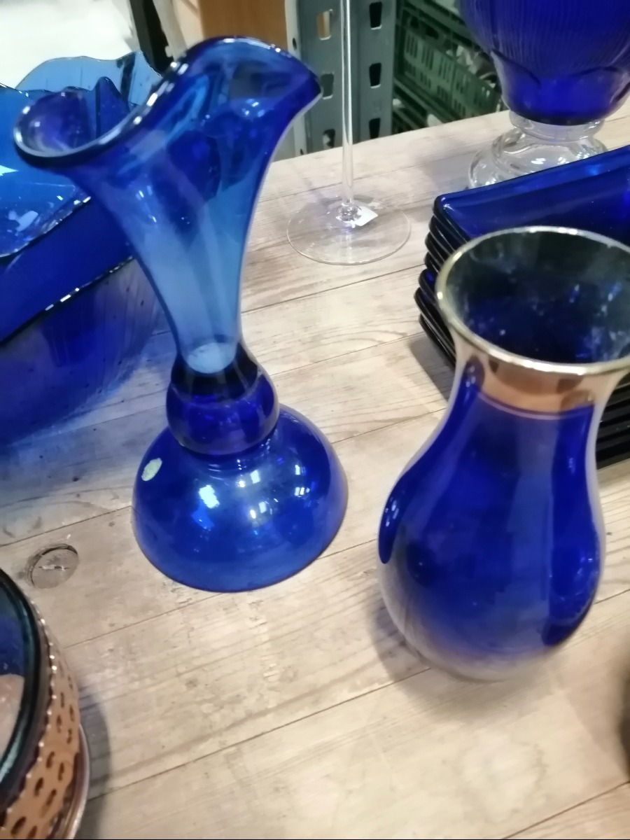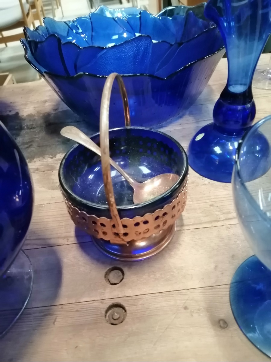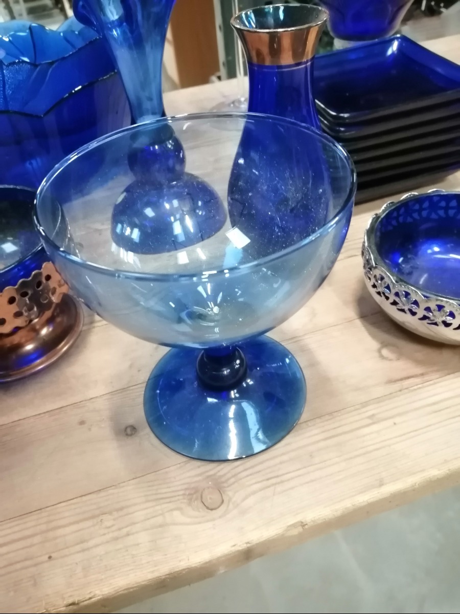 Blå glas, en samling af forskellige vaser, glas, skåle og lysestager.