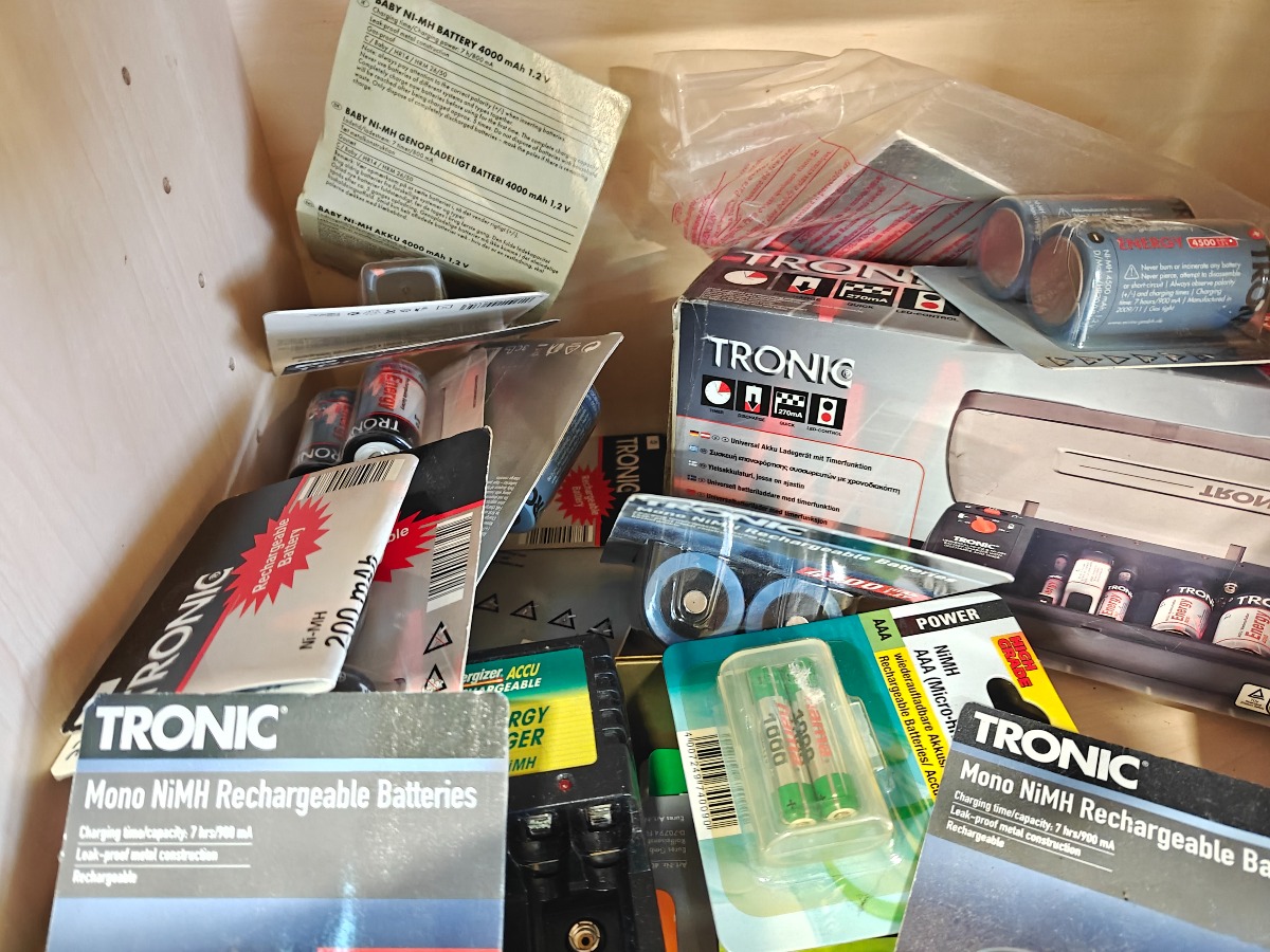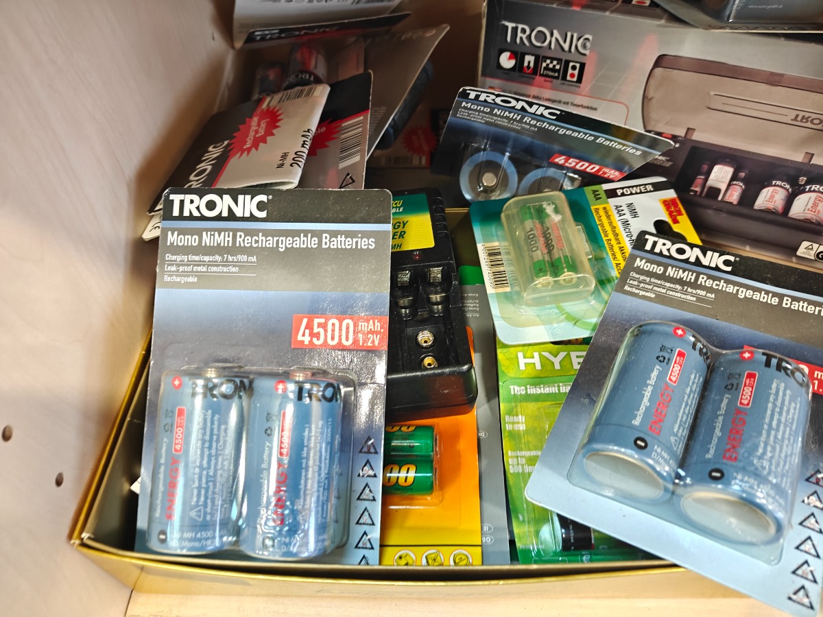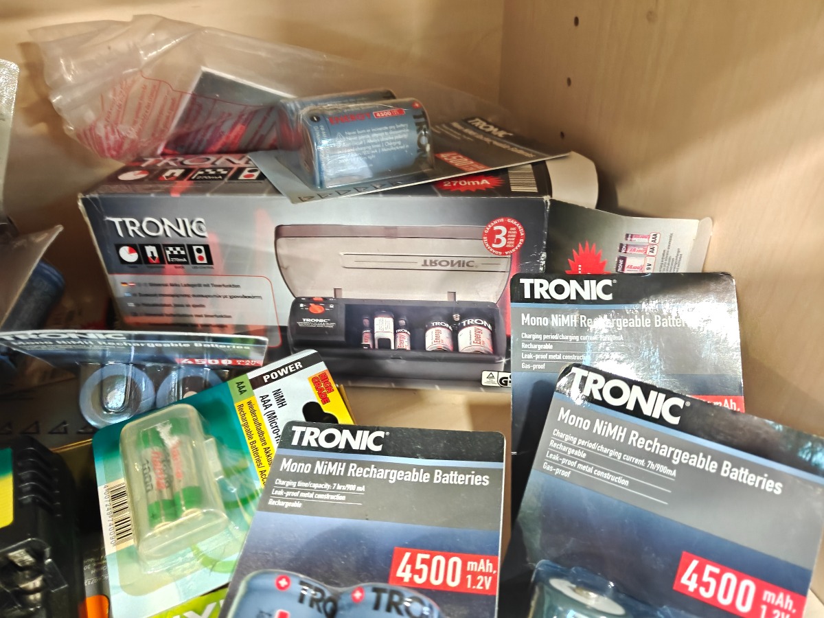 Batterioplader samt stor mængde genopladelige batterier. De fleste batterier er i uåbnede pakker. Mange forskellige størrelser.