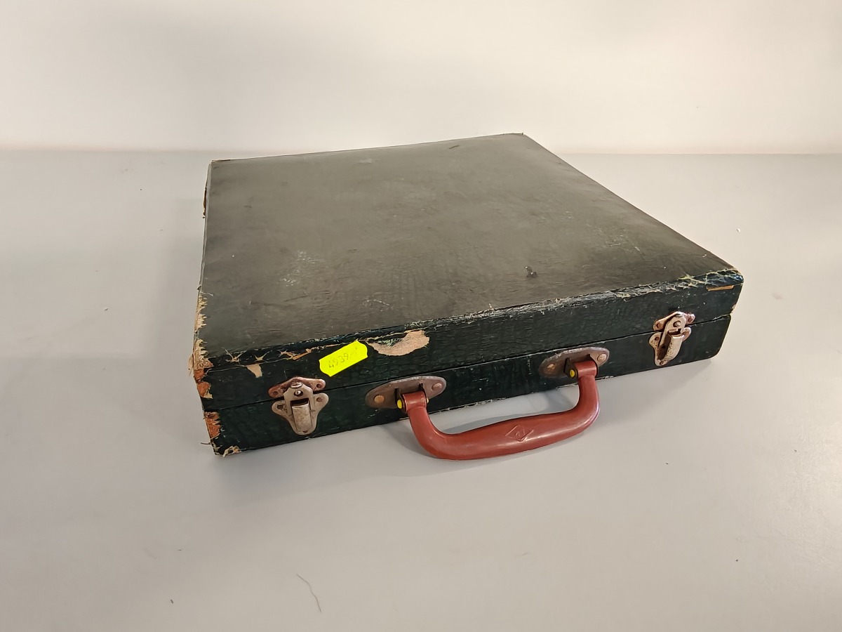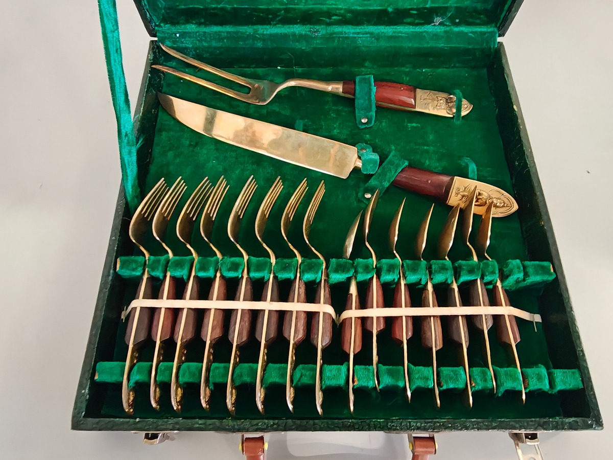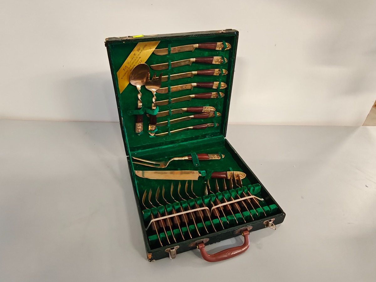 Bestikkuffert. Bestik af messing med trægreb. Prydet med orientalsk motiv.