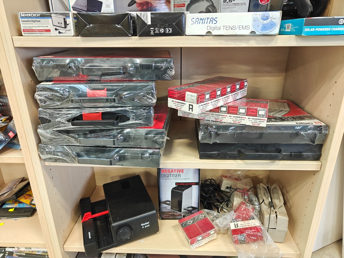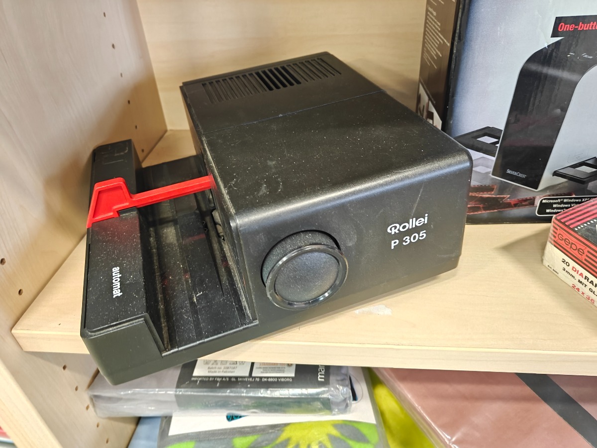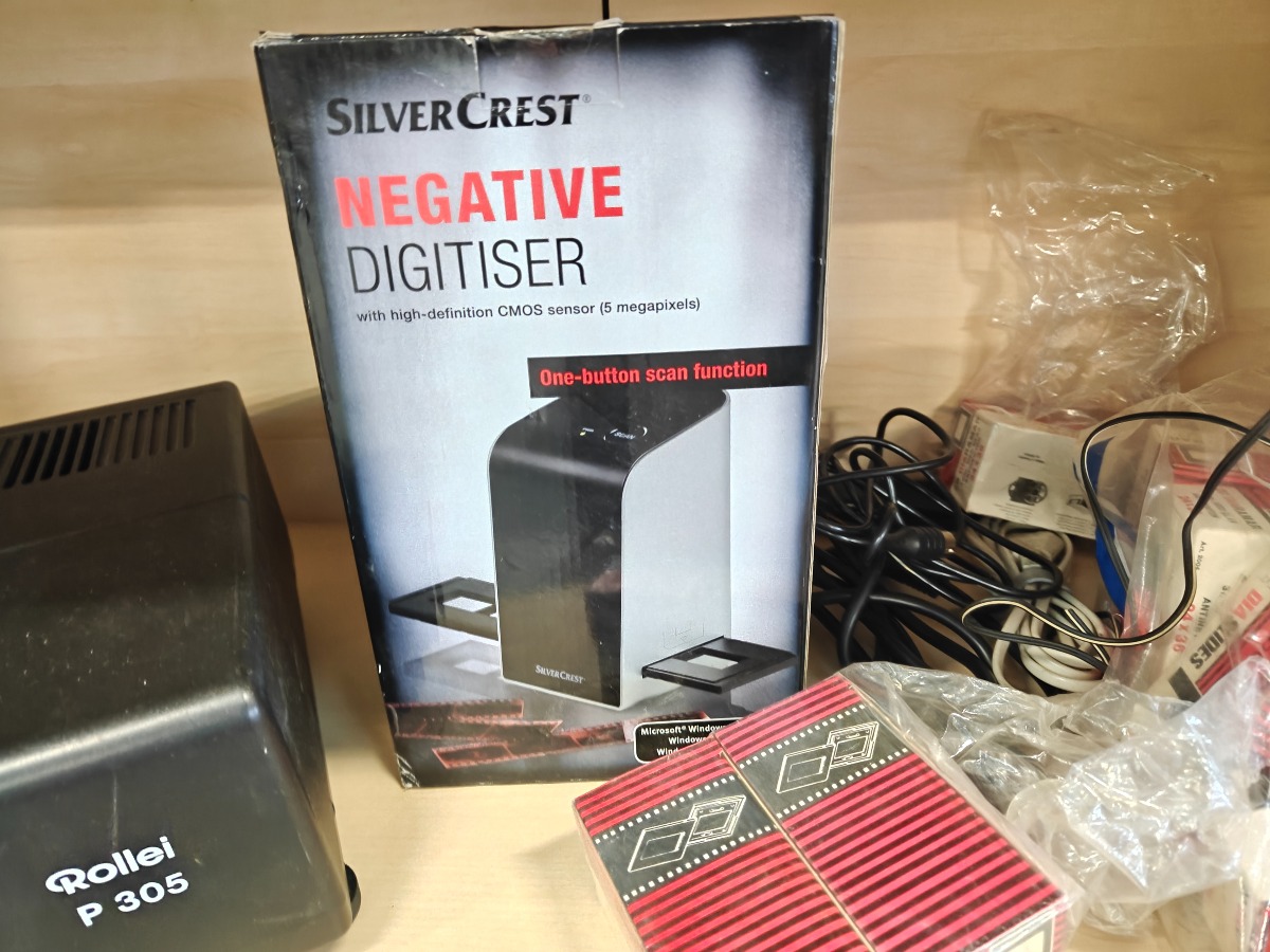Dias udstyr. Rollei P308 diasfremviser med fjernbetjening med kabel. Digitiser til negativer. Tomme ubrugte diasrammer, skuffer til opbevaring samt ældre diaspparat. Ene opbevaringskasse med dias med motiver.