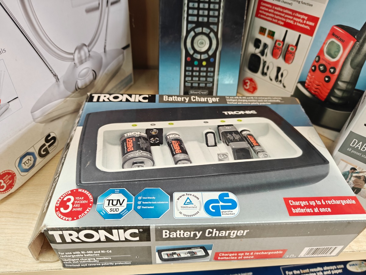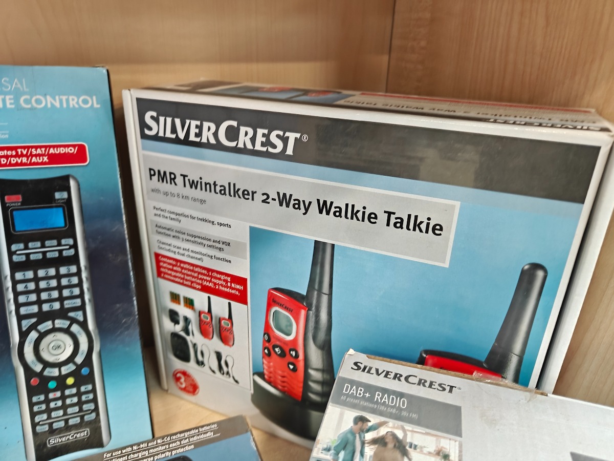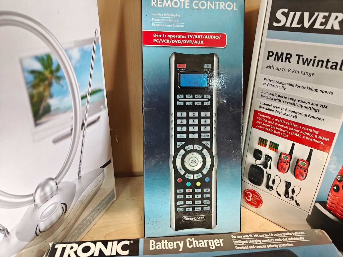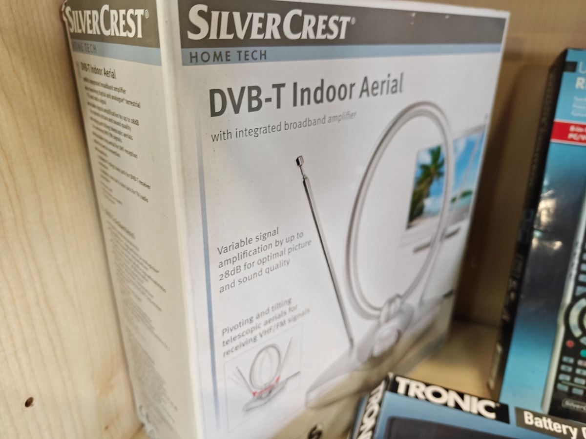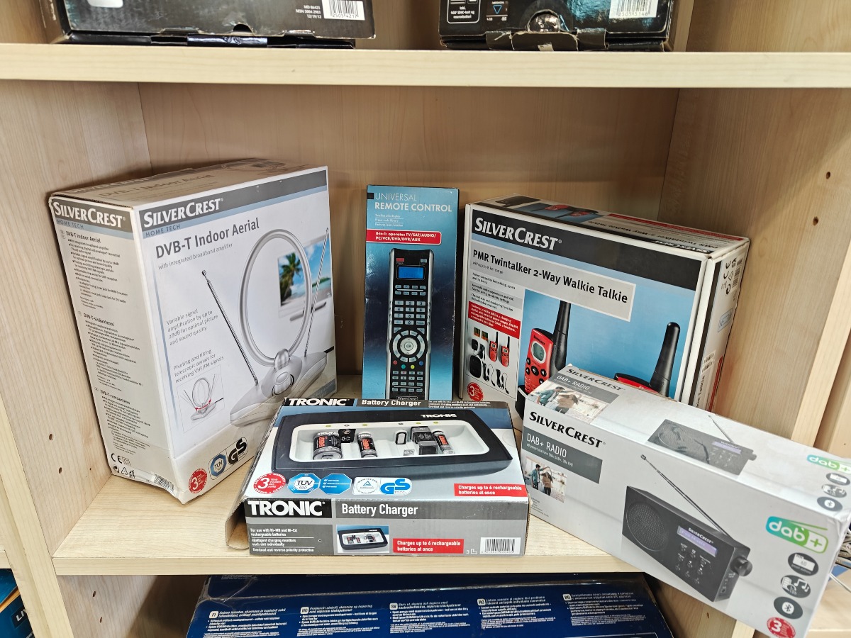 Diverse hjemmeelektronik. Indendørs TV-antenne, universal fjernbetjening, batterilader, walkie talkie sæt og DAB+ radio. Vi garanterer ikke for funktionaliteten på produkterne.