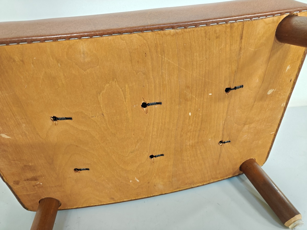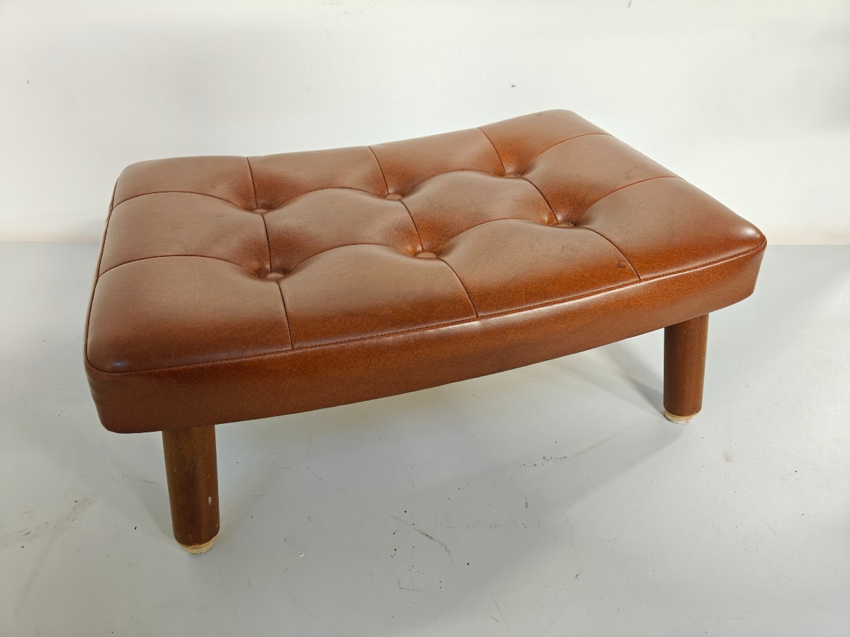 Fodskammel på bejdsede ben af bøg. Monteret med knapstukken kunstlæder. 48 x 32 cm.