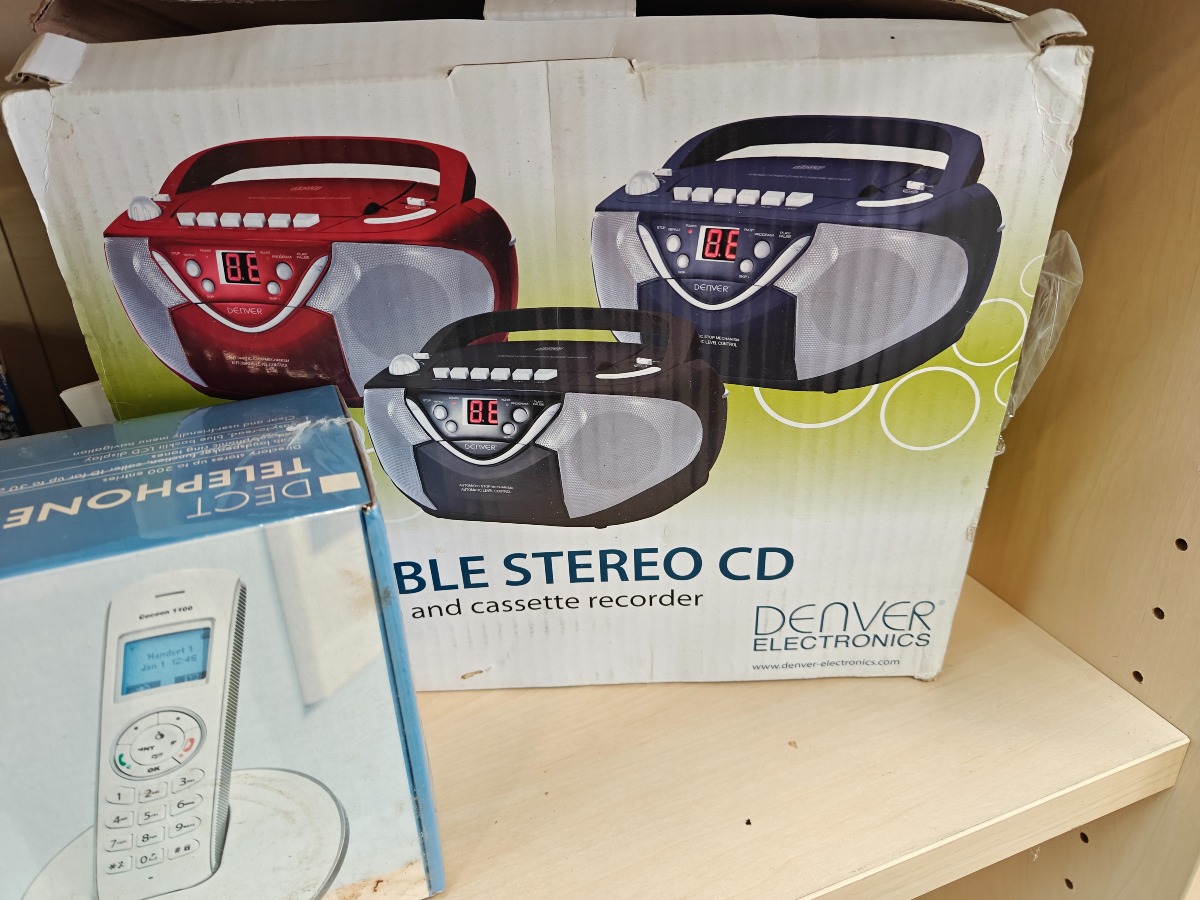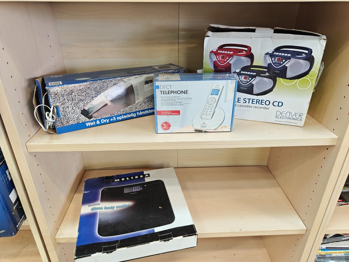 Forskelligt elektronik til hjemmet. Elektronisk badevægt, håndstøvsuger, fastnettelefon og transportabel CD-afspiller. Vi garanterer ikke for funktionaliteten.