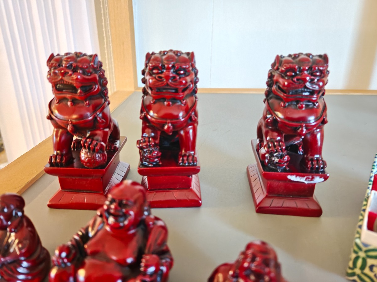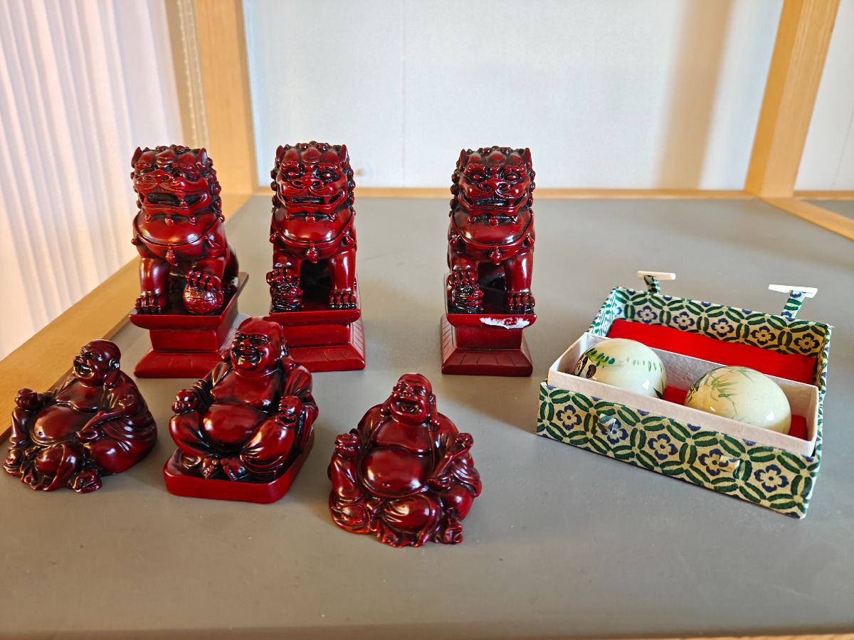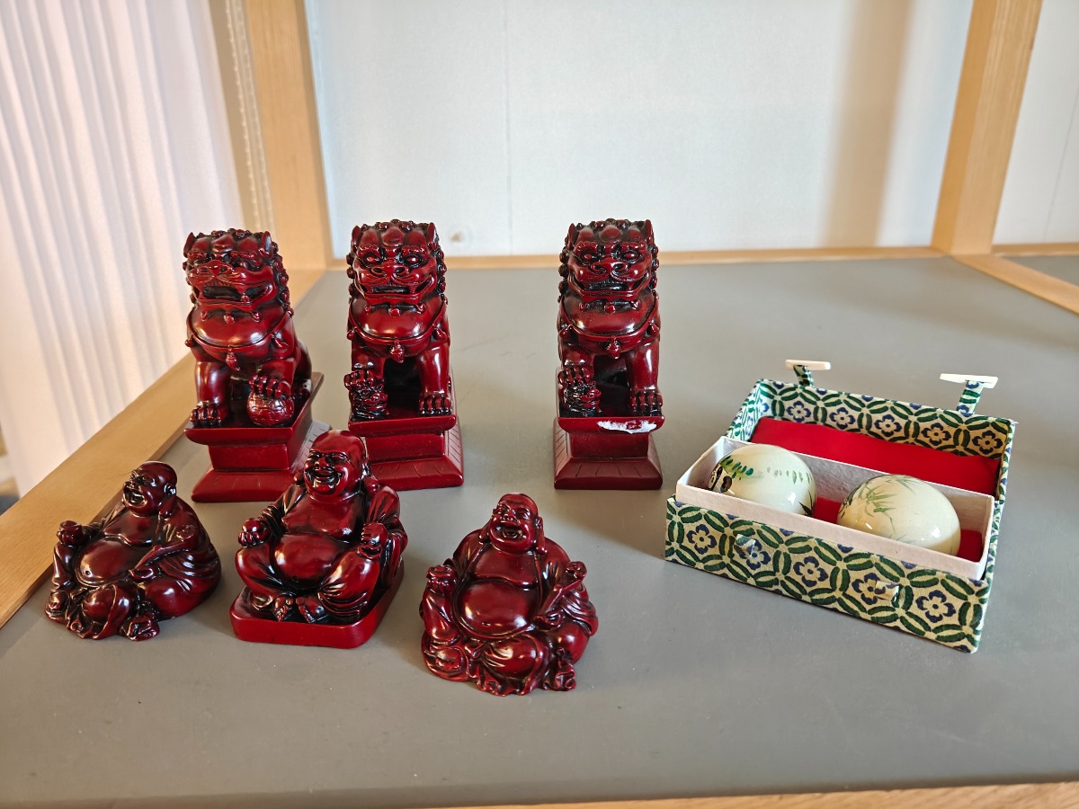 Kinesiske buddhaer og Foo hunde samt æske med stresskugler.