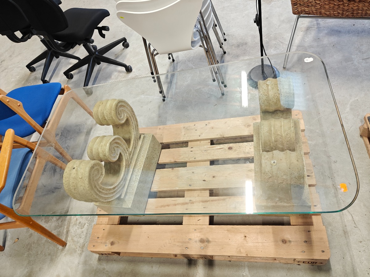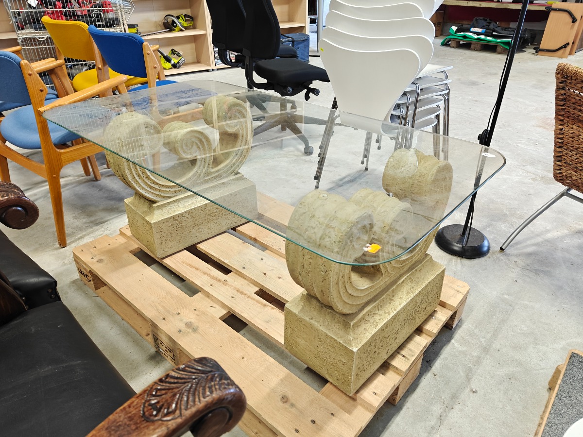 Sofabord på sokkel af fiberbeton med rektangulær topplade af glas med afrundede hjørner. 120 x 70 cm.