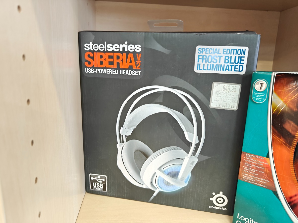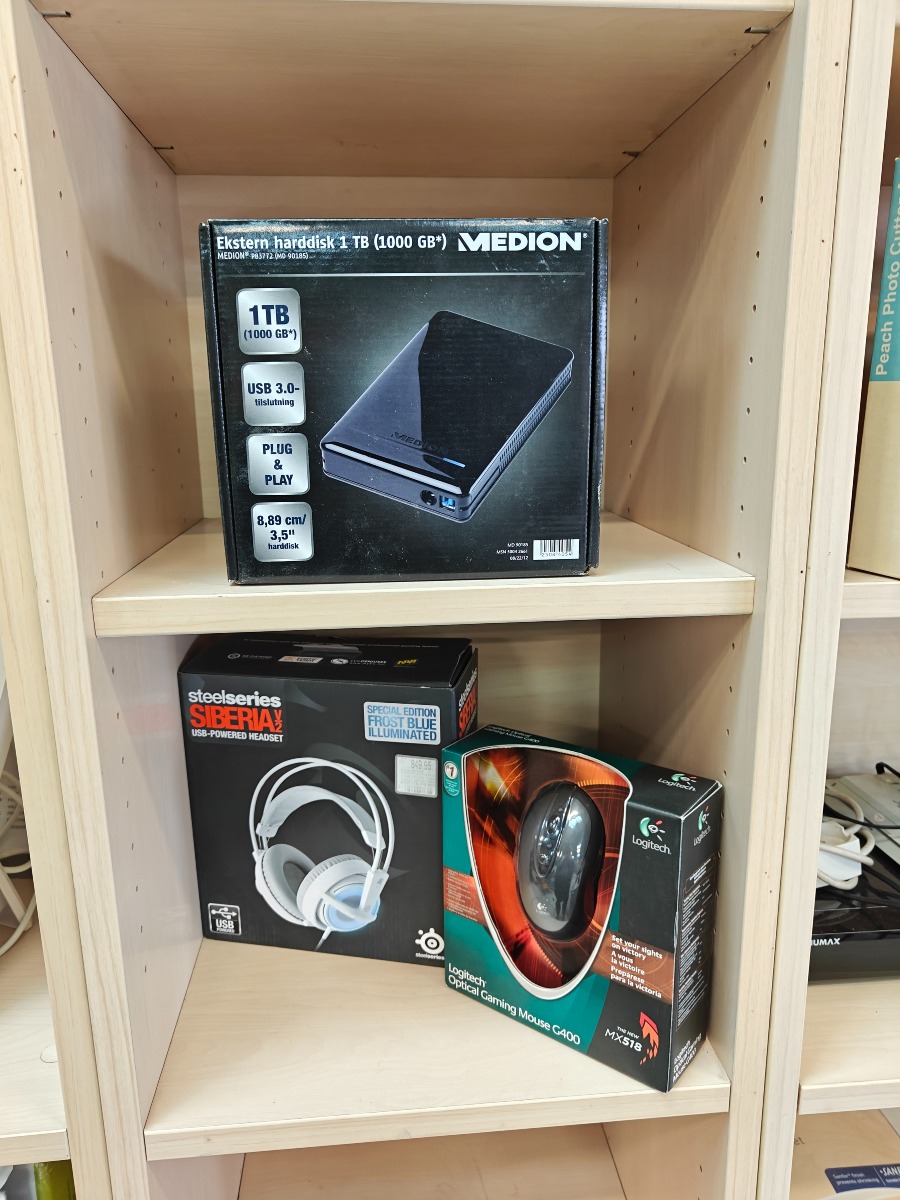 Til hjemmekontoret. Medion 1 TB ekstern harddisk, Steelseries Siberia headset og Logitech gamer mus.