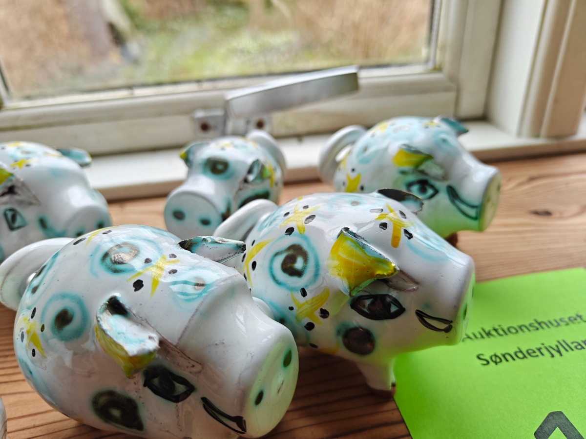 Små grise af keramik. L. ca. 10 cm. Effekterne stammer alle fra Boet efter Kunstner Marianne Permin. Keramik af kunstneren selv er 2. sort. Derfor kan der forekomme fejl eller mangler.