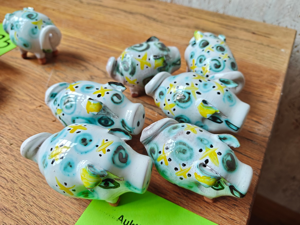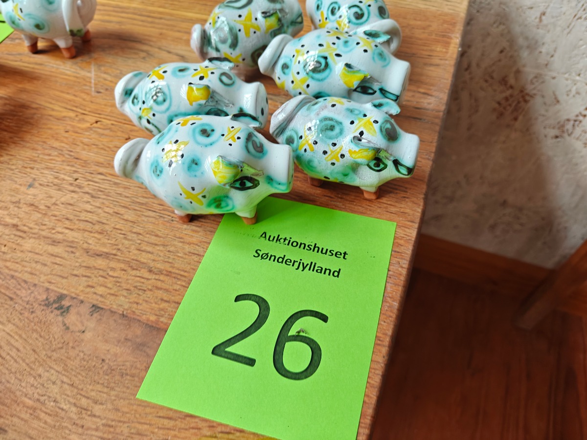 Små grise af keramik. L. ca. 10 cm. Effekterne stammer alle fra Boet efter Kunstner Marianne Permin. Keramik af kunstneren selv er 2. sort. Derfor kan der forekomme fejl eller mangler.