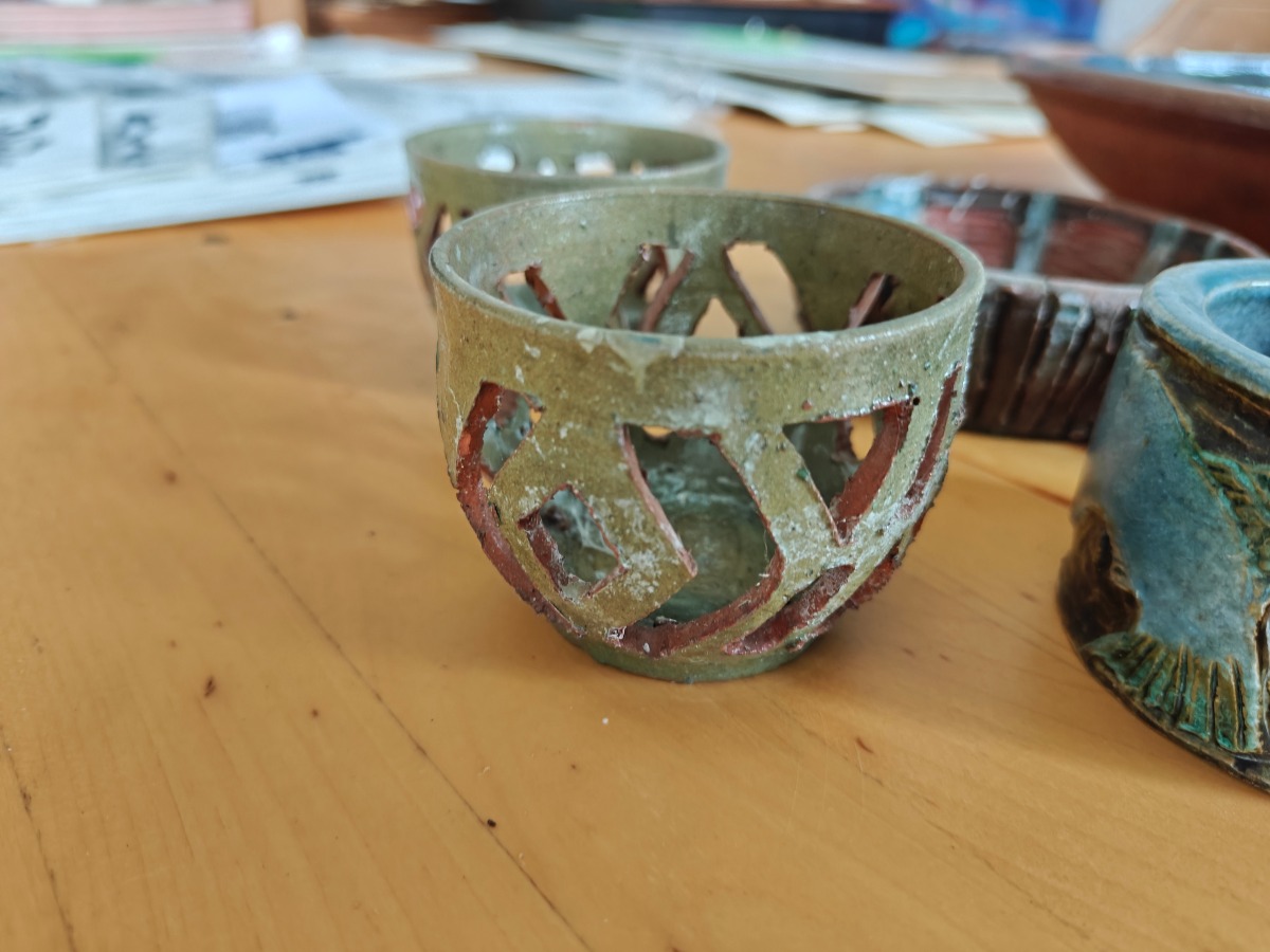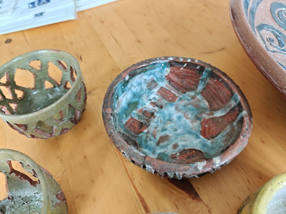 6 dele keramik. Ubek. kunstnere. Ø. på fad til sammenligning, 35 cm. Effekterne stammer alle fra Boet efter Kunstner Marianne Permin. Keramik af kunstneren selv er 2. sort. Derfor kan der forekomme fejl eller mangler.