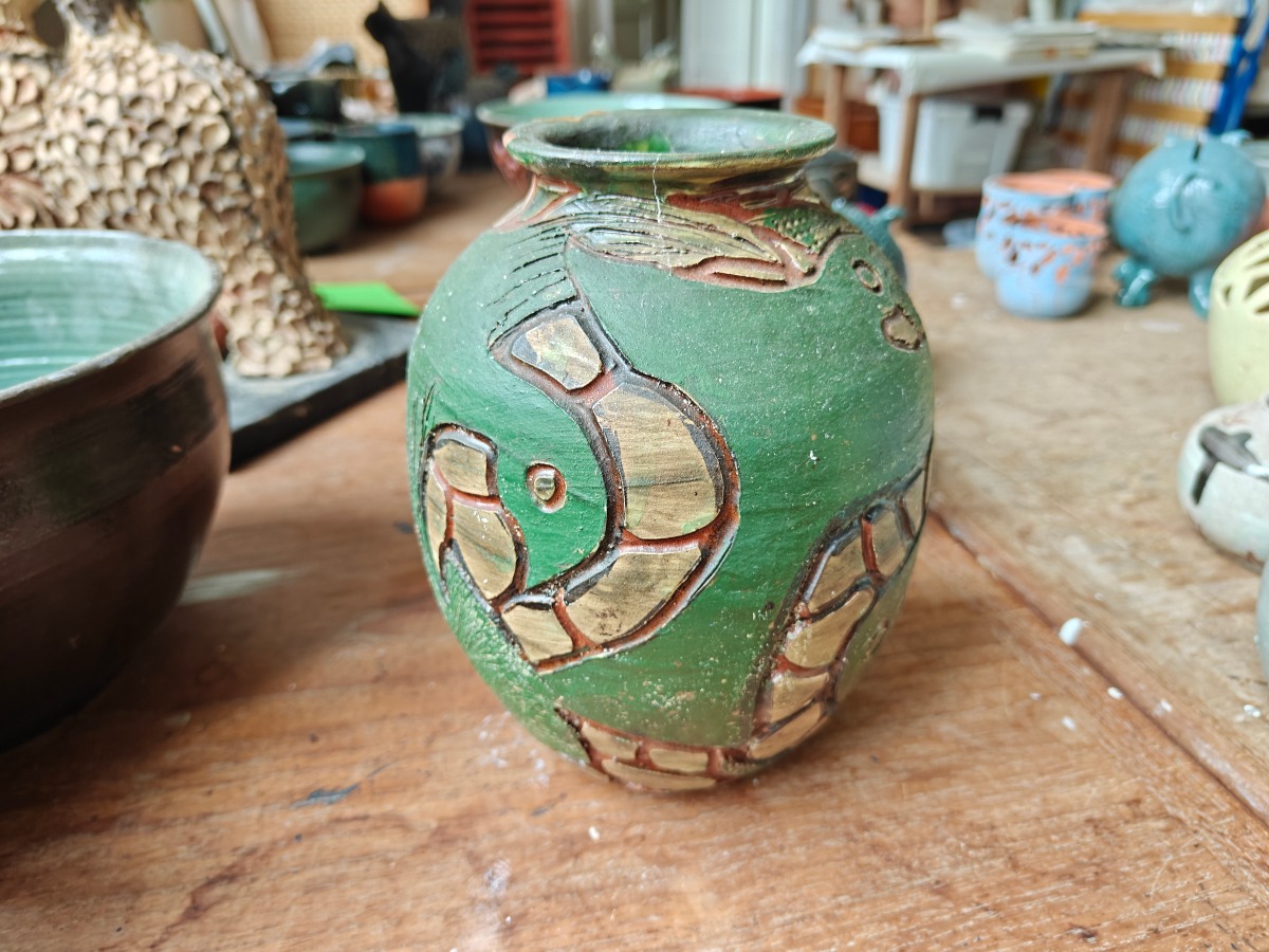 Marianne Permin keramik med glasur i grønlige toner. H. for største 20 cm. Effekterne stammer alle fra Boet efter Kunstner Marianne Permin. Keramik af kunstneren selv er 2. sort. Derfor kan der forekomme fejl eller mangler.