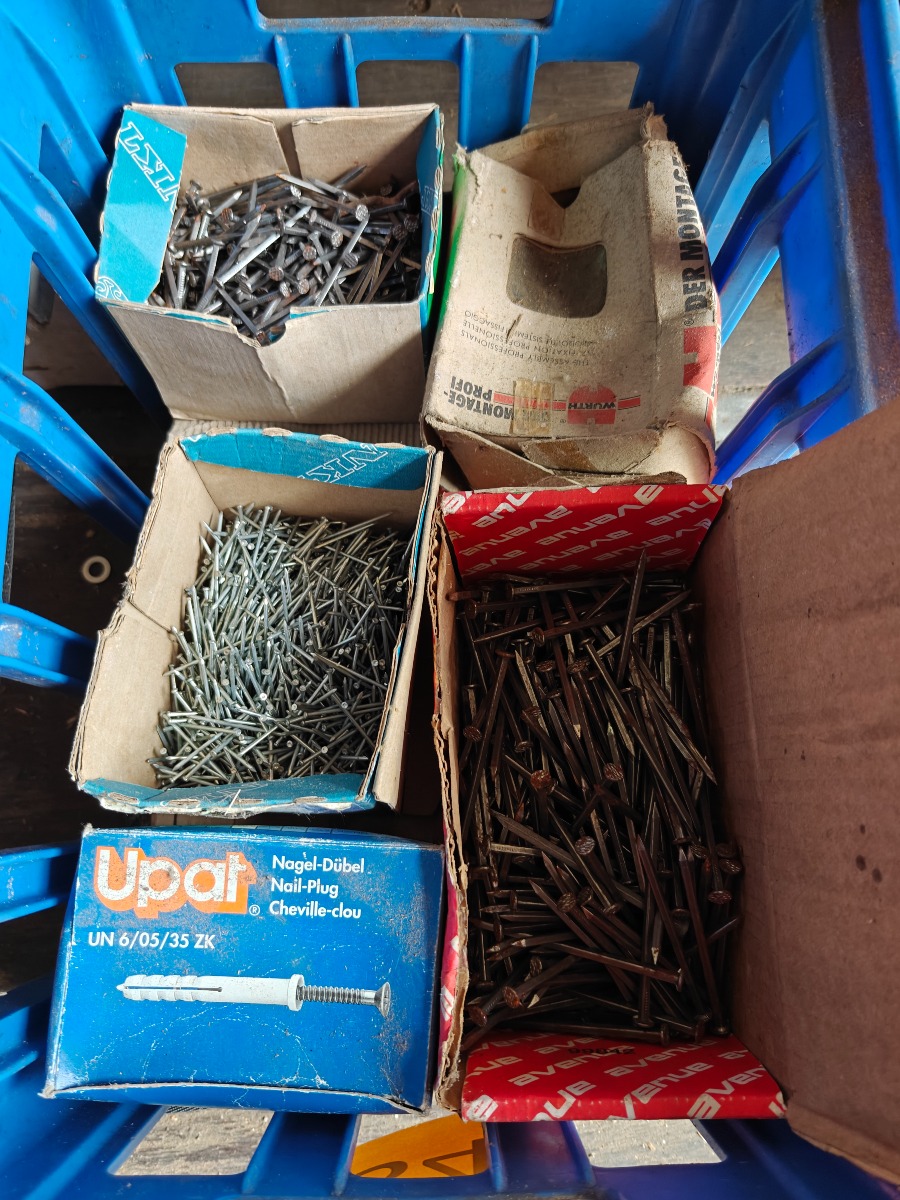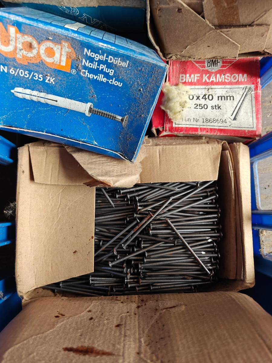 Kasse med div. søm, skruer & emballagebånd