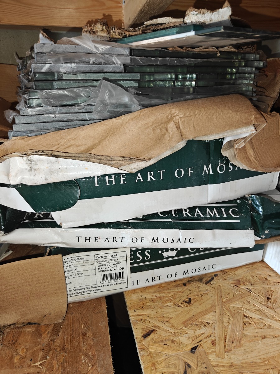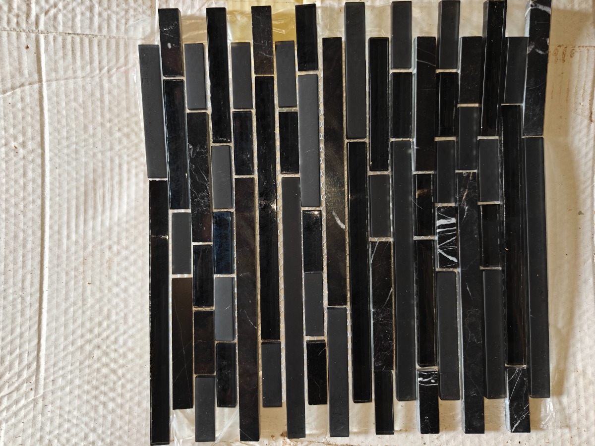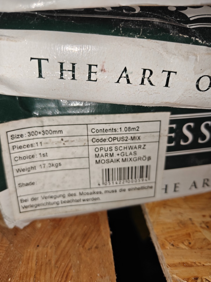 Parti mosaik ca 3 m2. kasse med 20 x 600 ml fugemasse hvid, i pose & 4 stk trappe fliser GRANDONE ELLE black gloss 60 x 33 cm
