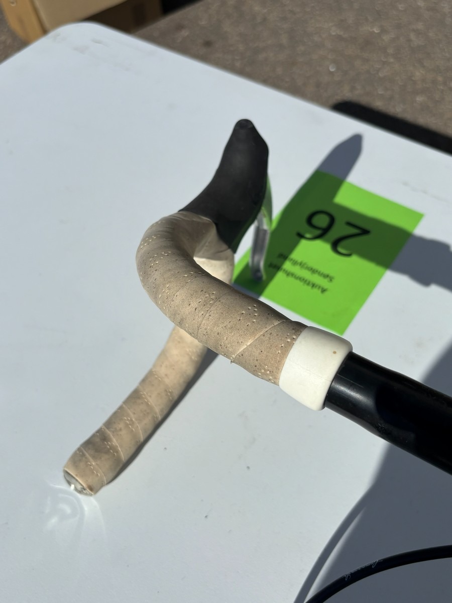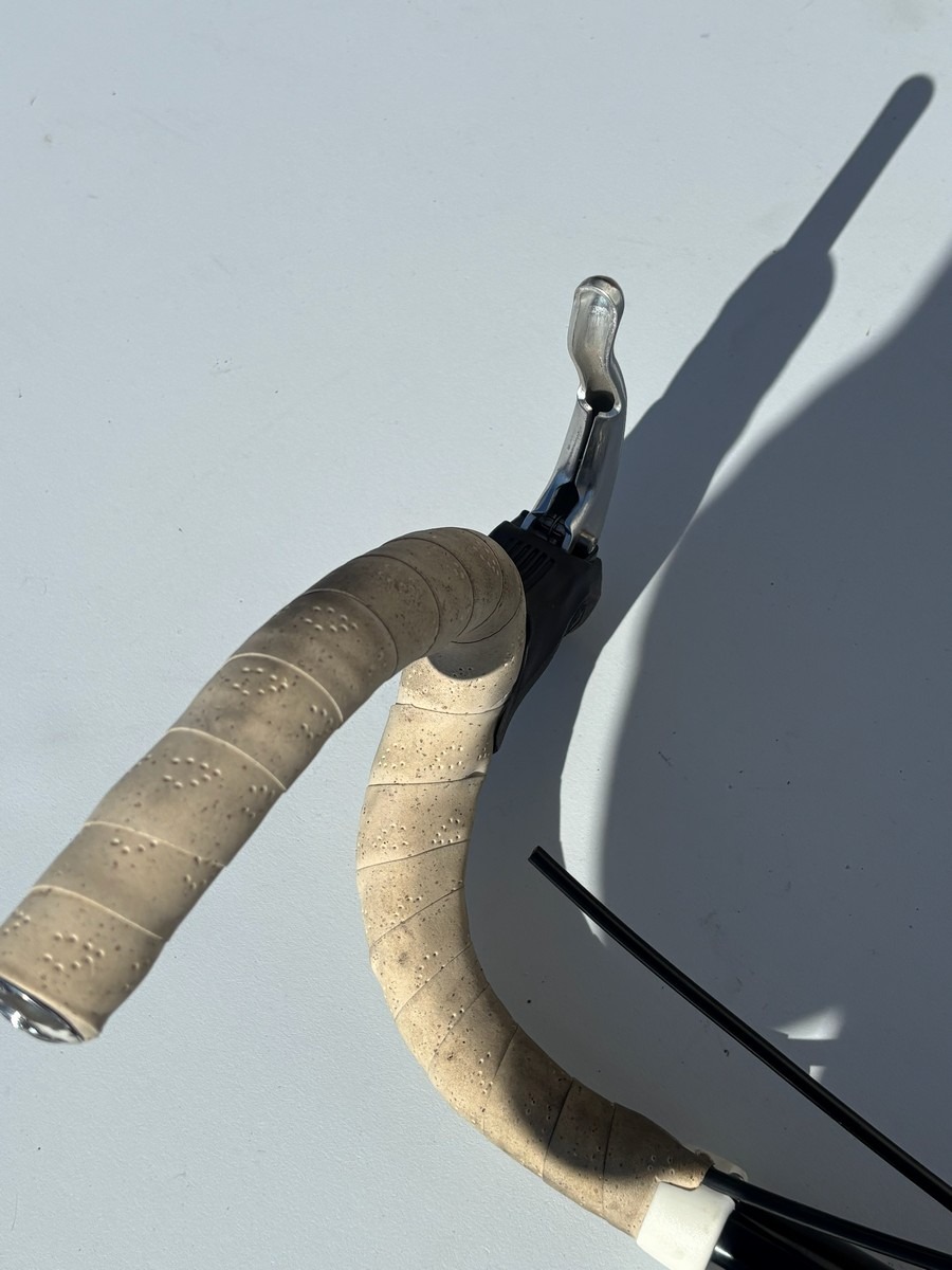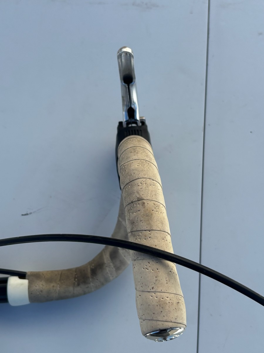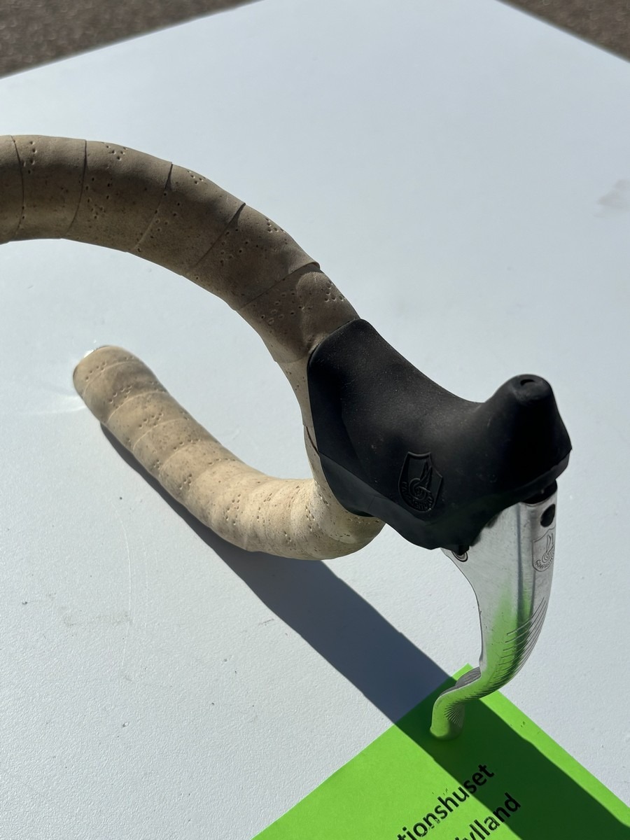 Styrbånd er monteret, men fremstår brugt og kan med fordel skiftes. Der er almindelige brugsspor på både styr og greb, men alt virker som det skal.