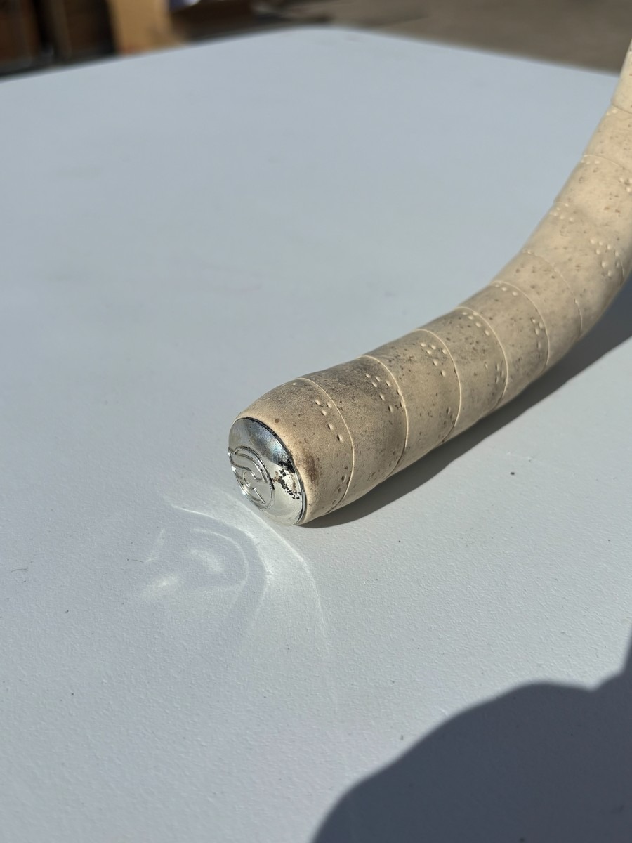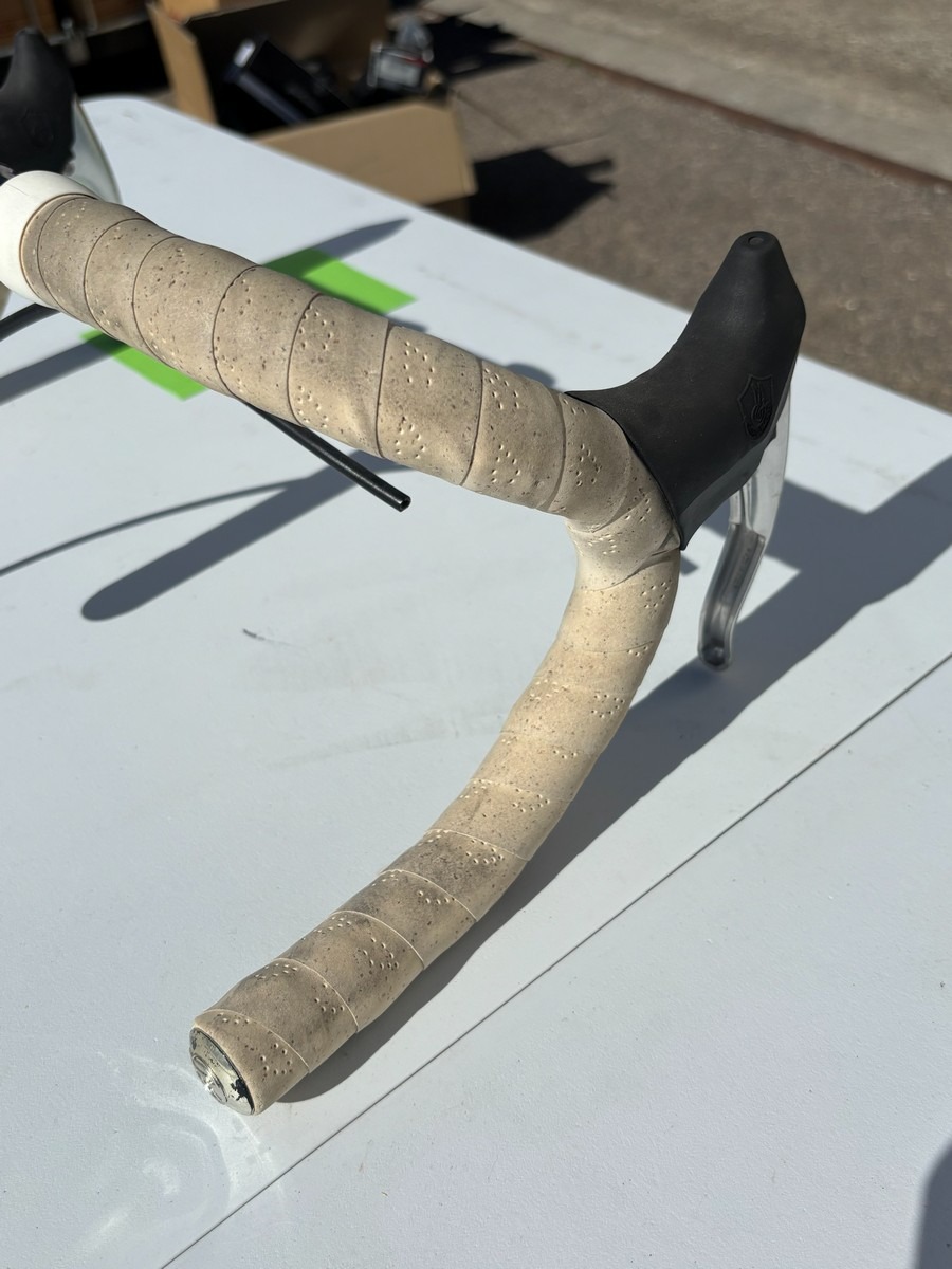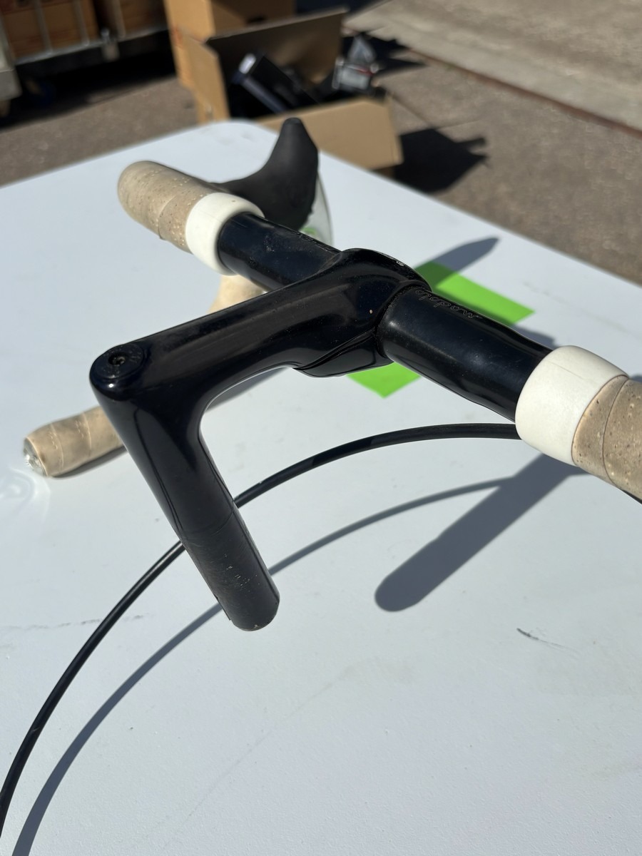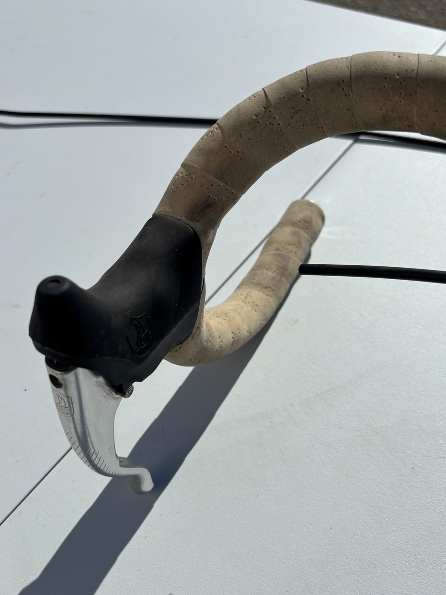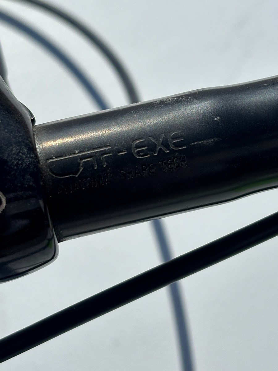 Styrbånd er monteret, men fremstår brugt og kan med fordel skiftes. Der er almindelige brugsspor på både styr og greb, men alt virker som det skal.