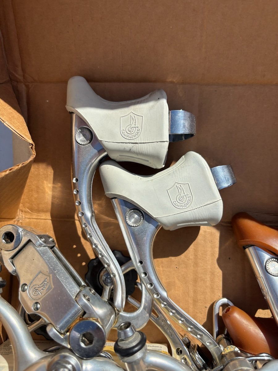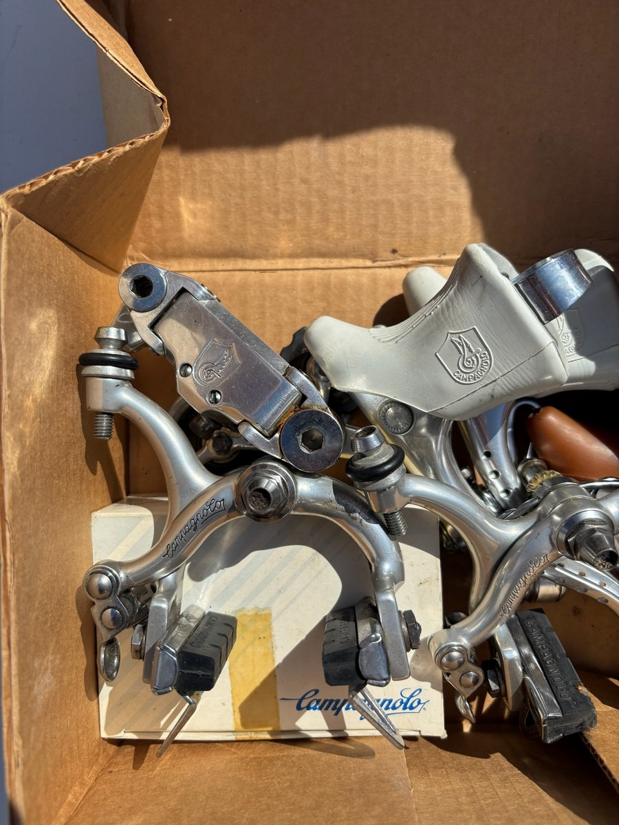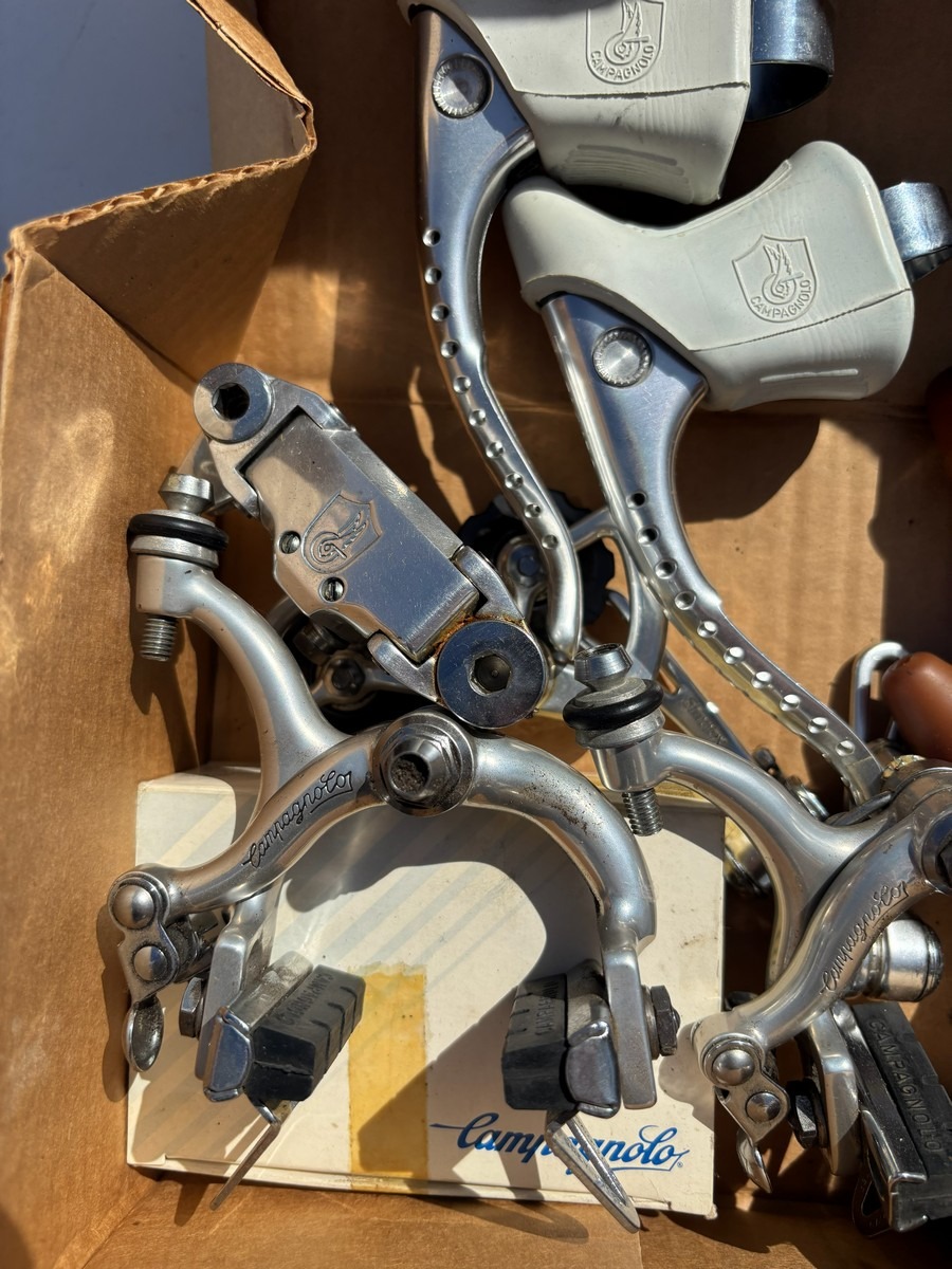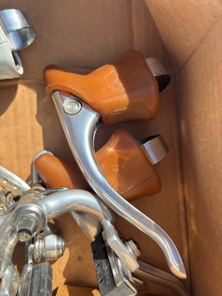 Blandet parti Campagnolo racercykelkomponenter, bestående af ældre bremsekalibre og bremsegreb i klassisk design
