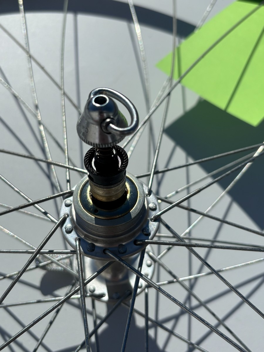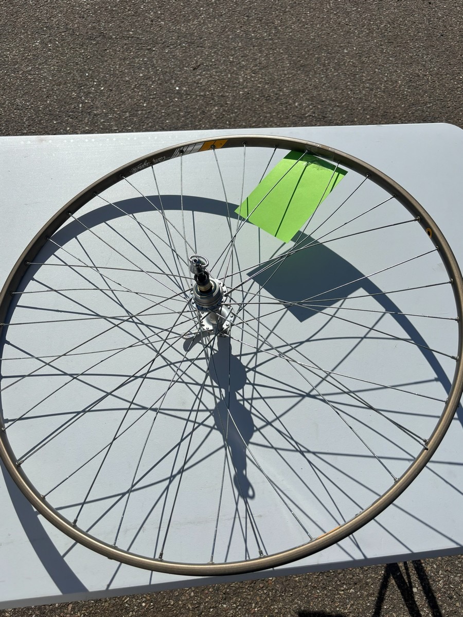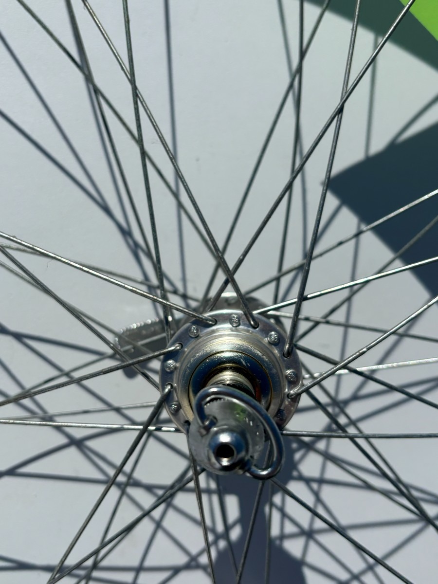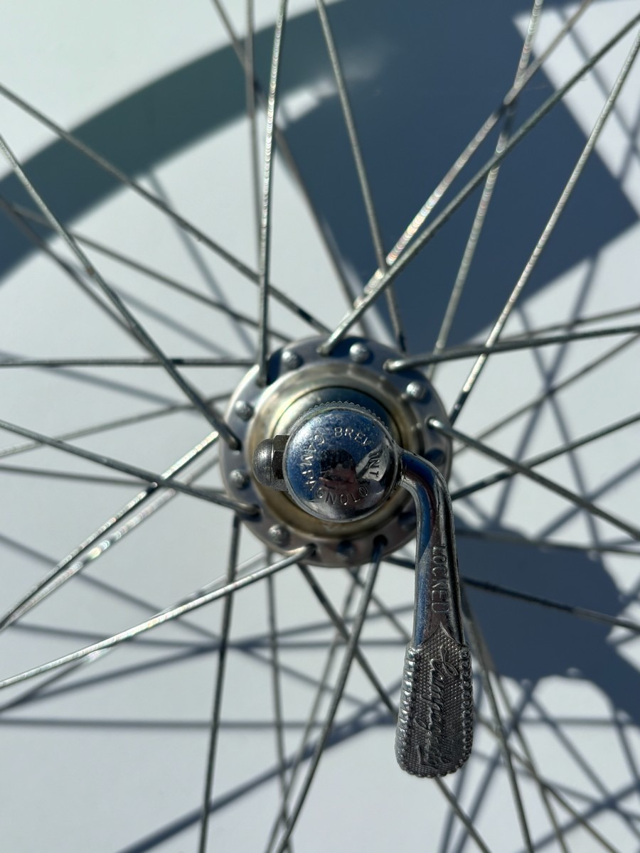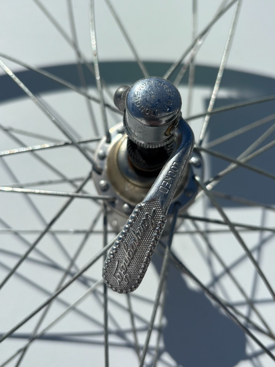Ældre Campagnolo hjulsæt i klassisk sølvfinish med traditionelle eger og nav. Indeholder både for- og baghjul med quick release.