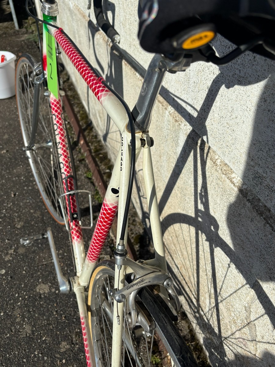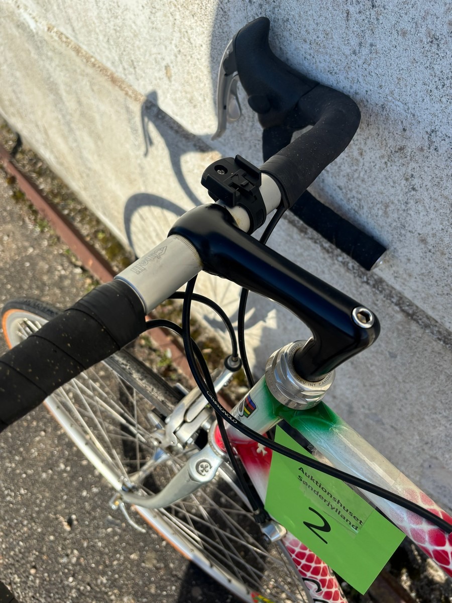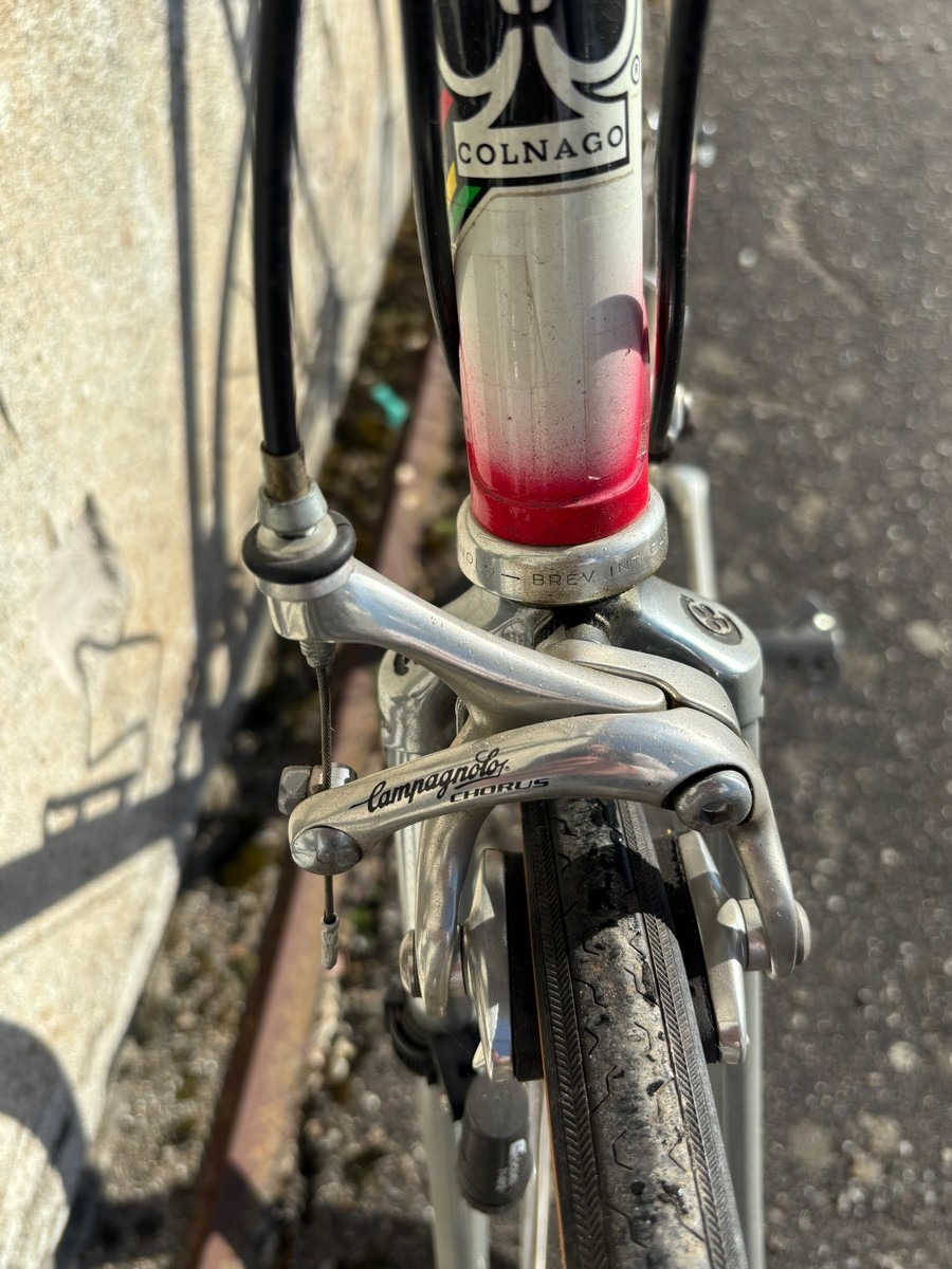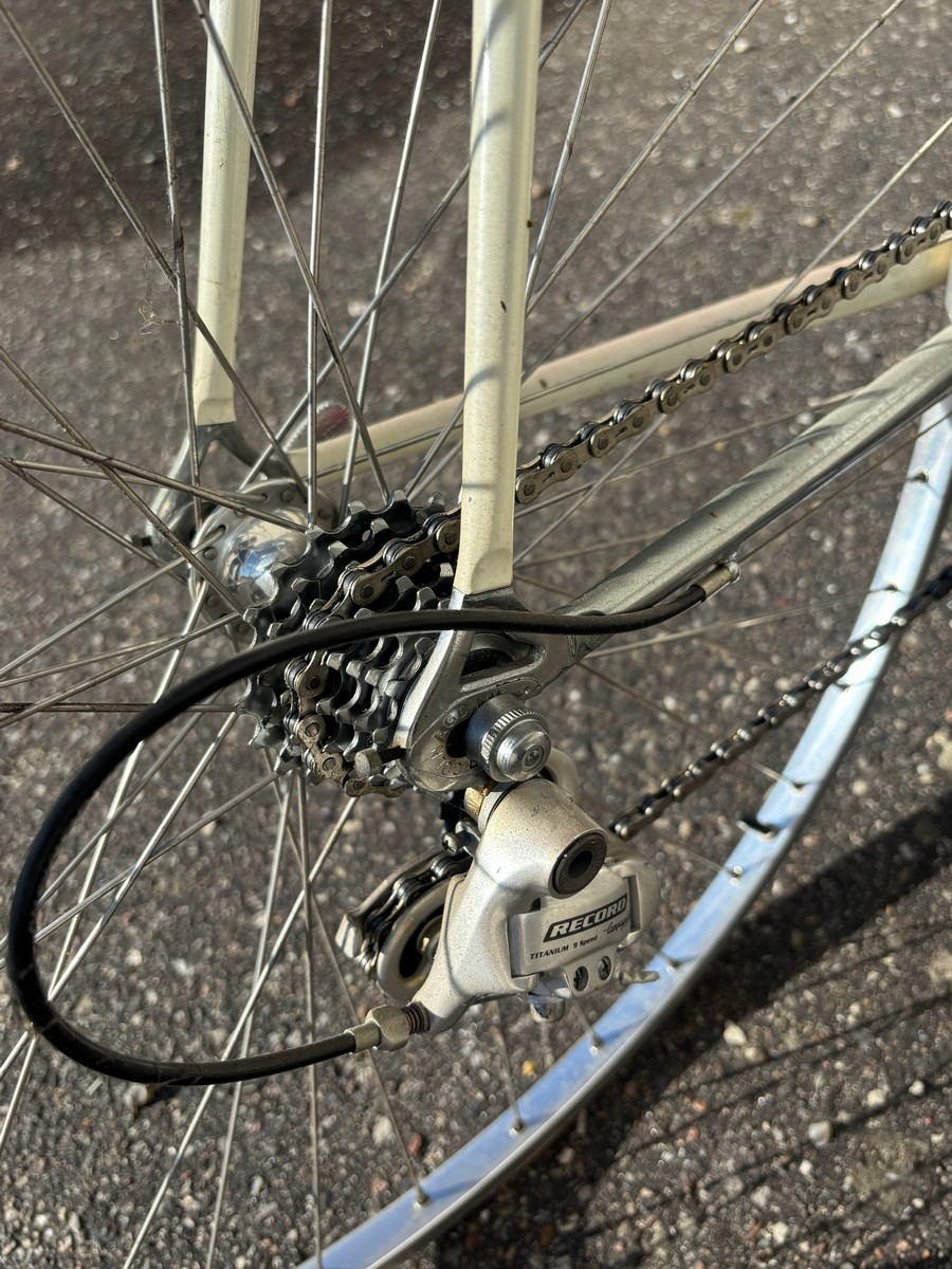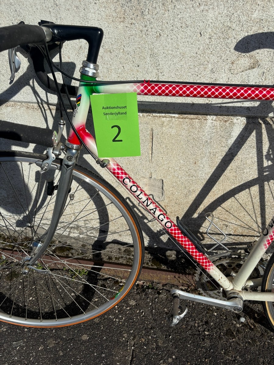 Colnago racercykel med Campagnolo Record – brugt. Klassisk italiensk racercykel med Columbus stel (Made in Italy). Udstyret med Campagnolo Record Titanium 9-speed geargruppe samt Campagnolo bremser. Fremstår i brugt stand med almindelige brugsspor, herunder mindre kosmetiske mærker og lidt rust ved krankområde. Monteret med racerstyr, smalle dæk og flaskeholdere.