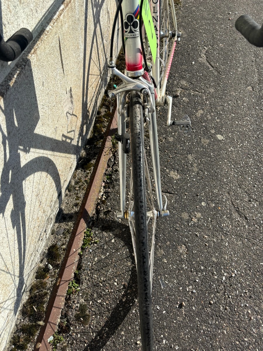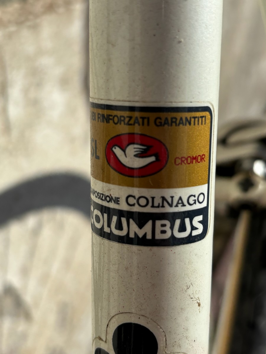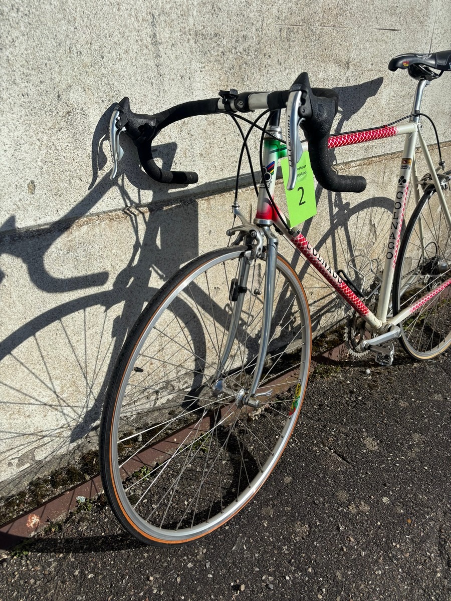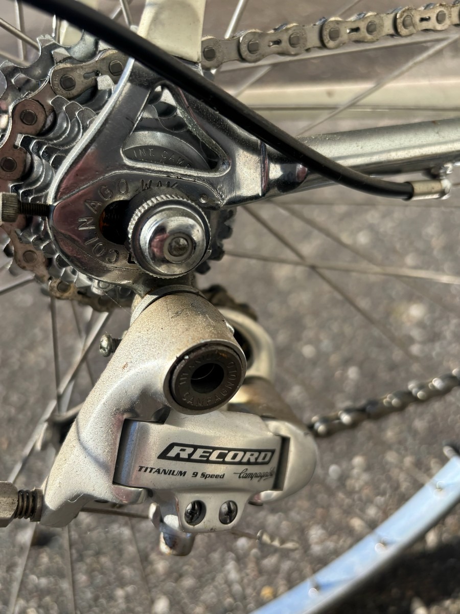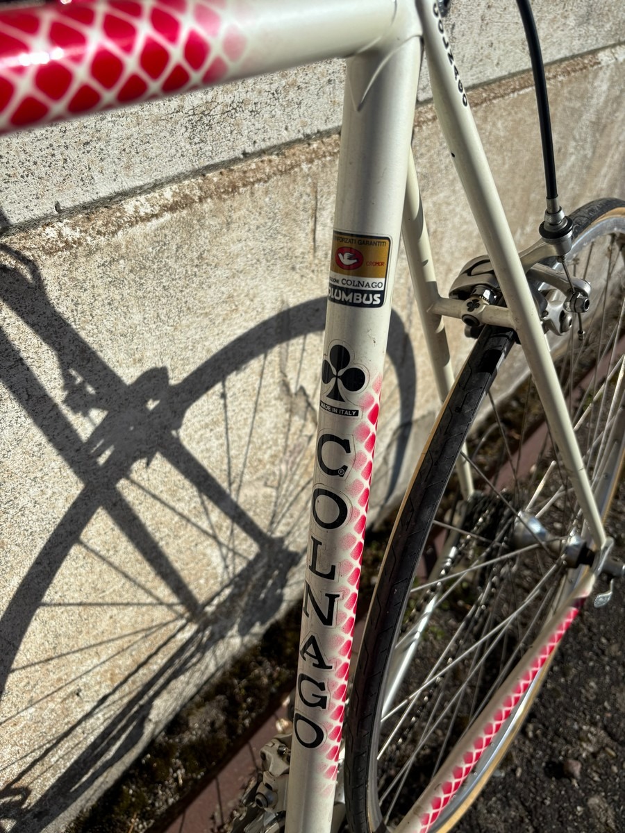 Colnago racercykel med Campagnolo Record – brugt. Klassisk italiensk racercykel med Columbus stel (Made in Italy). Udstyret med Campagnolo Record Titanium 9-speed geargruppe samt Campagnolo bremser. Fremstår i brugt stand med almindelige brugsspor, herunder mindre kosmetiske mærker og lidt rust ved krankområde. Monteret med racerstyr, smalle dæk og flaskeholdere.