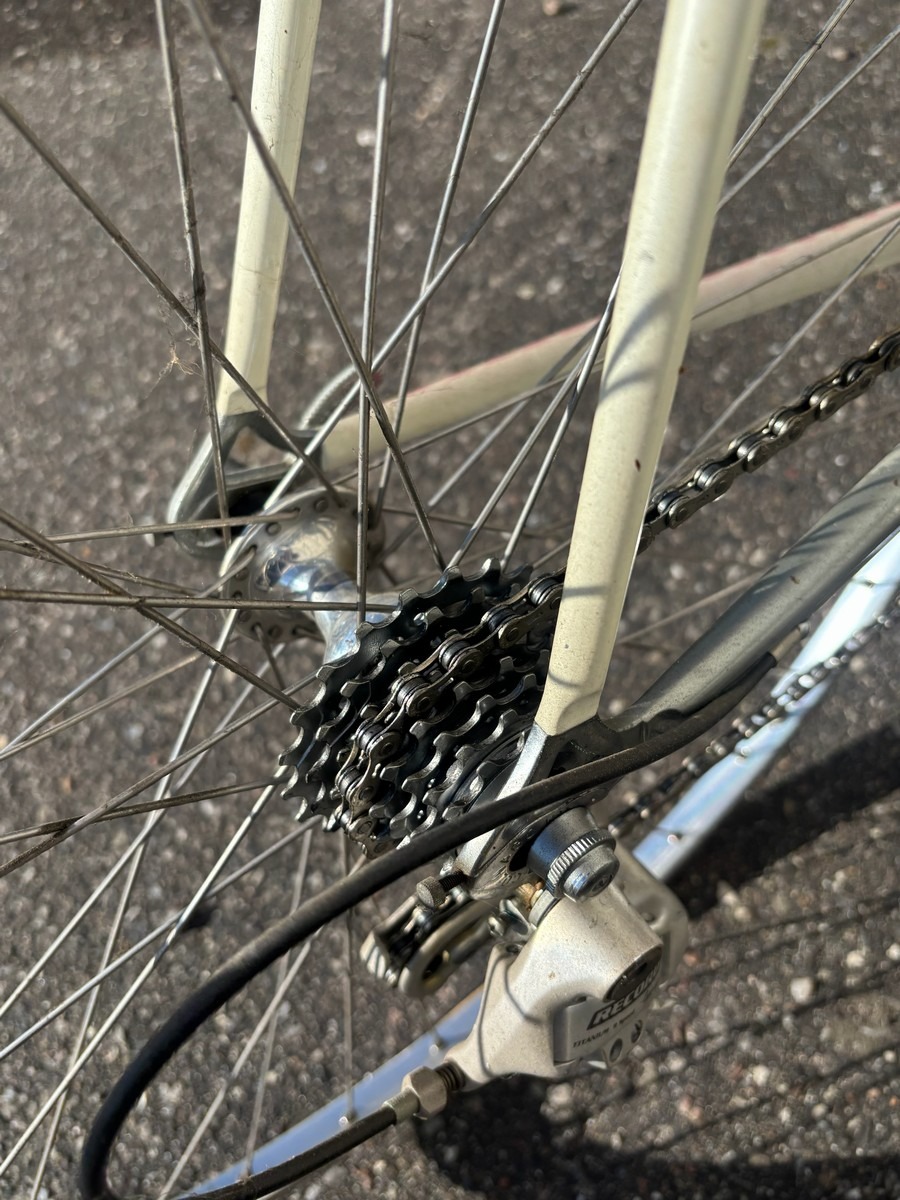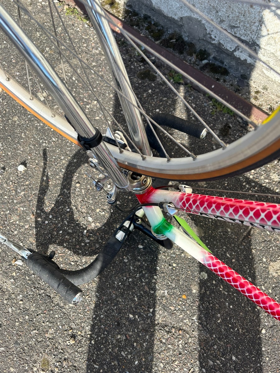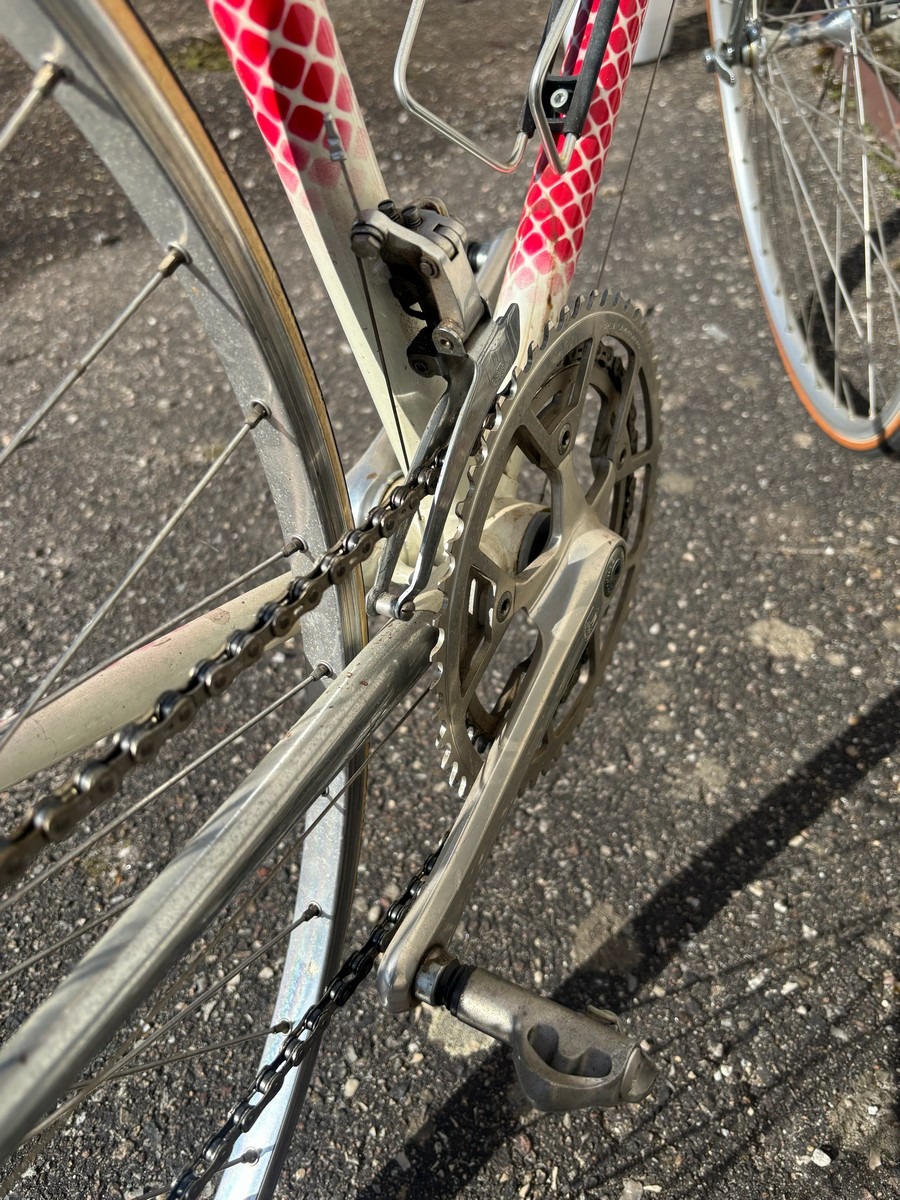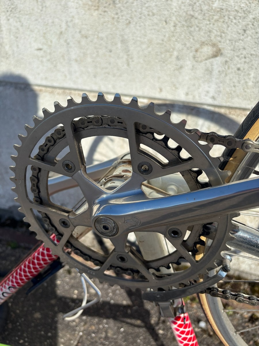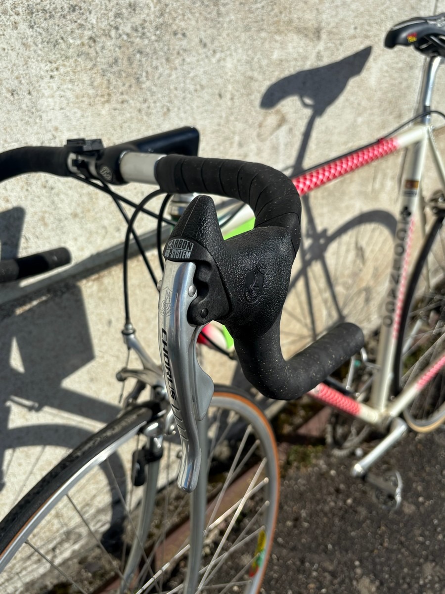 Colnago racercykel med Campagnolo Record – brugt. Klassisk italiensk racercykel med Columbus stel (Made in Italy). Udstyret med Campagnolo Record Titanium 9-speed geargruppe samt Campagnolo bremser. Fremstår i brugt stand med almindelige brugsspor, herunder mindre kosmetiske mærker og lidt rust ved krankområde. Monteret med racerstyr, smalle dæk og flaskeholdere.