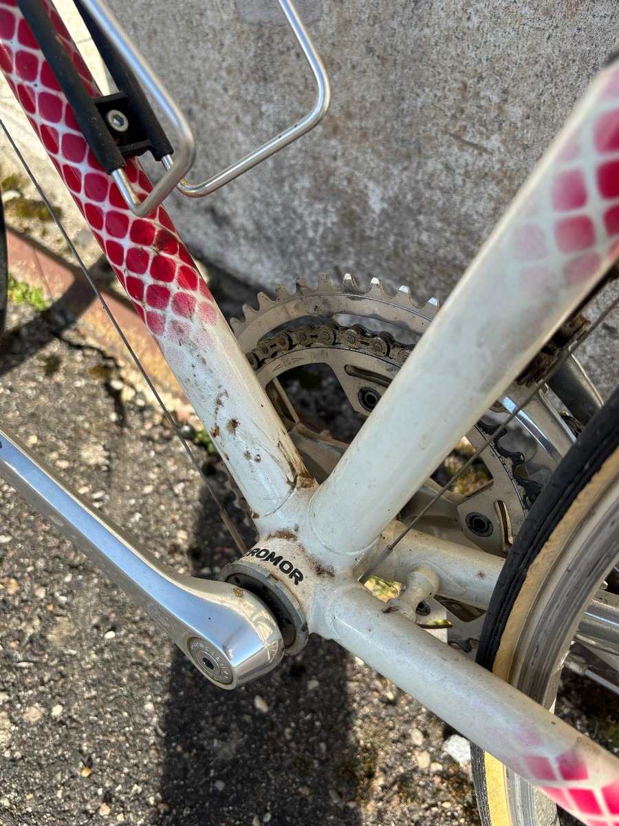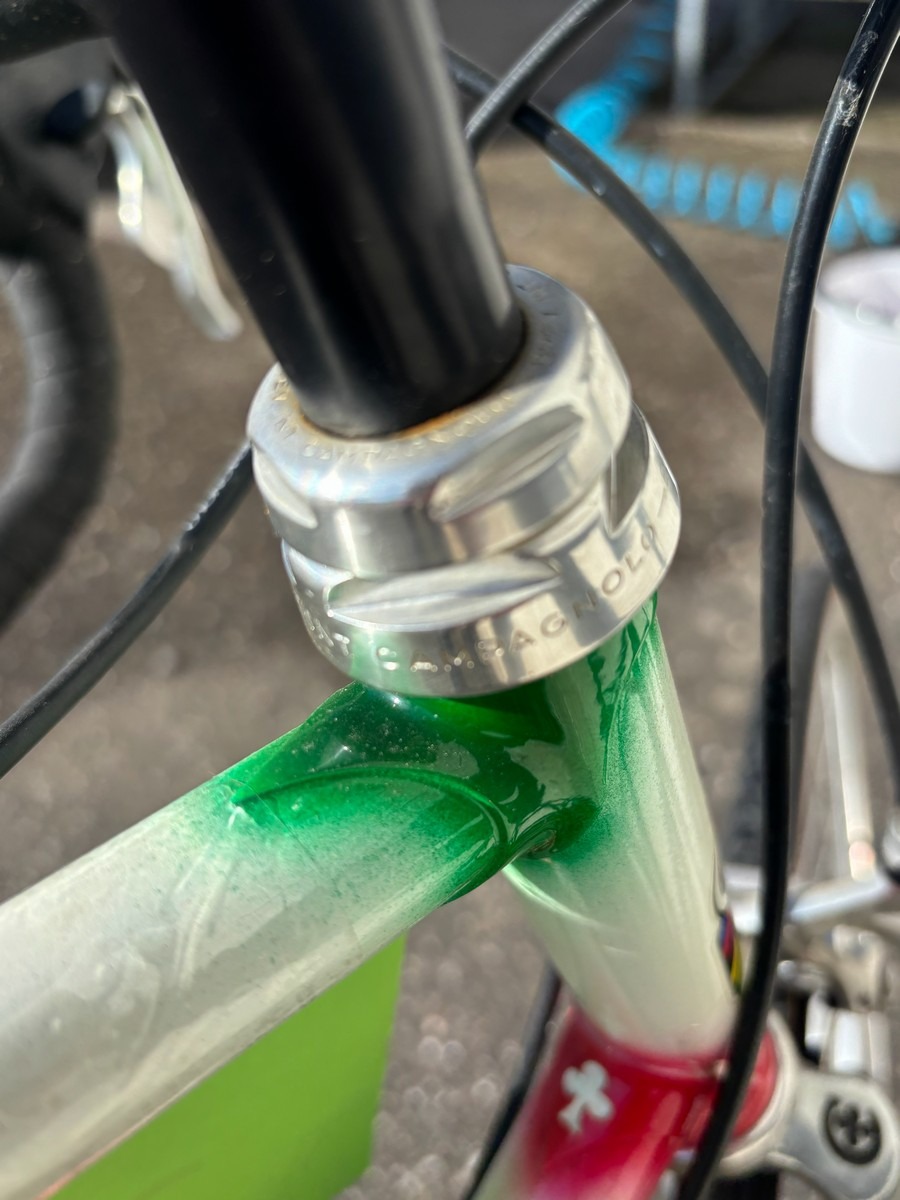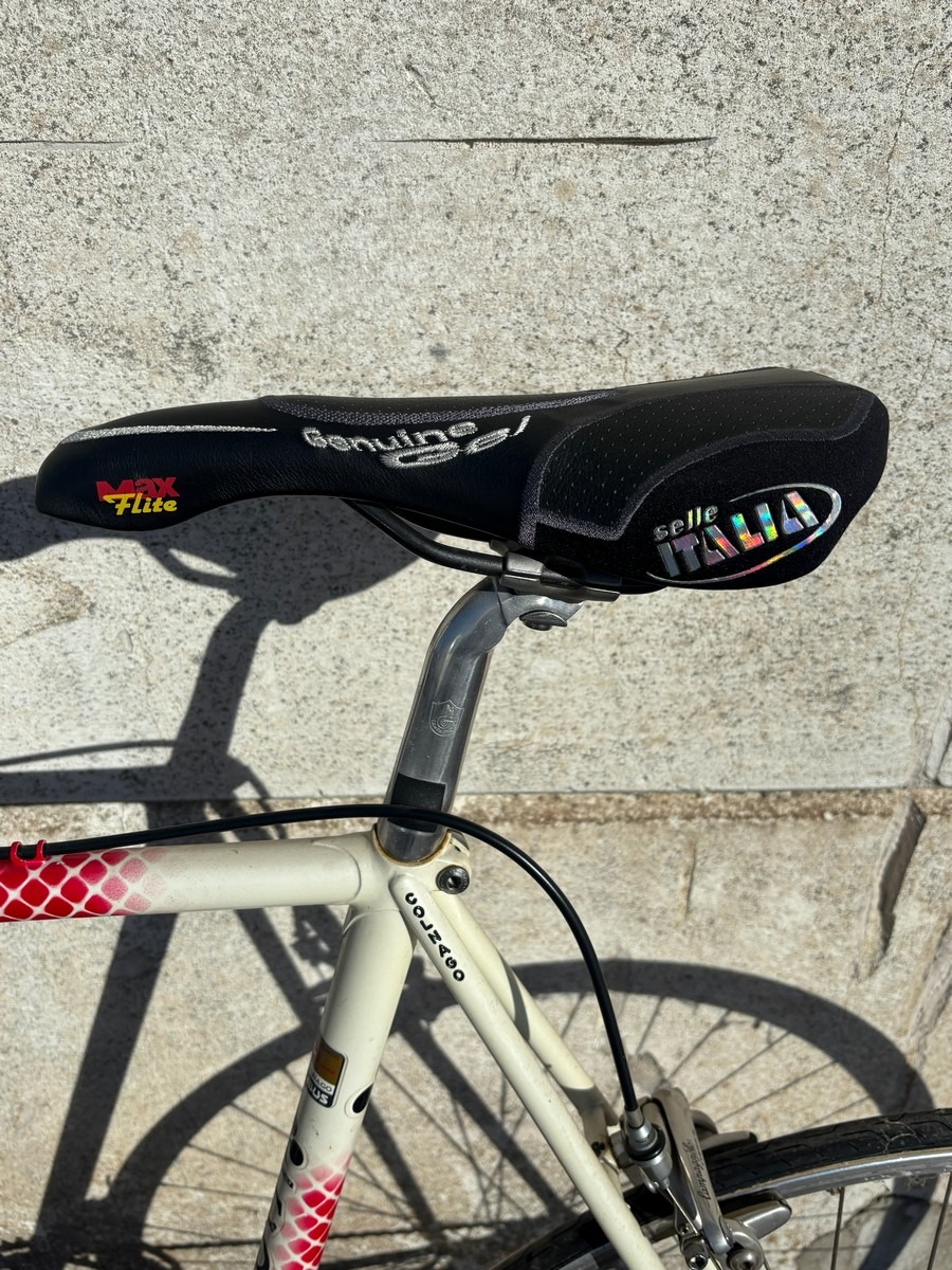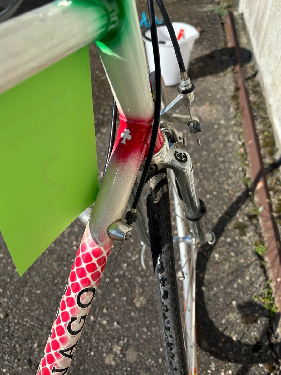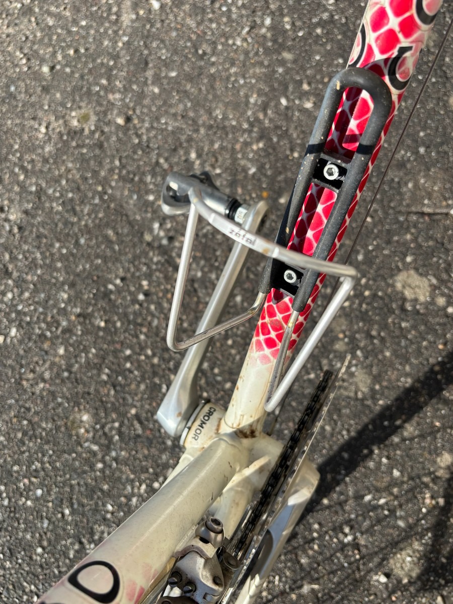 Colnago racercykel med Campagnolo Record – brugt. Klassisk italiensk racercykel med Columbus stel (Made in Italy). Udstyret med Campagnolo Record Titanium 9-speed geargruppe samt Campagnolo bremser. Fremstår i brugt stand med almindelige brugsspor, herunder mindre kosmetiske mærker og lidt rust ved krankområde. Monteret med racerstyr, smalle dæk og flaskeholdere.