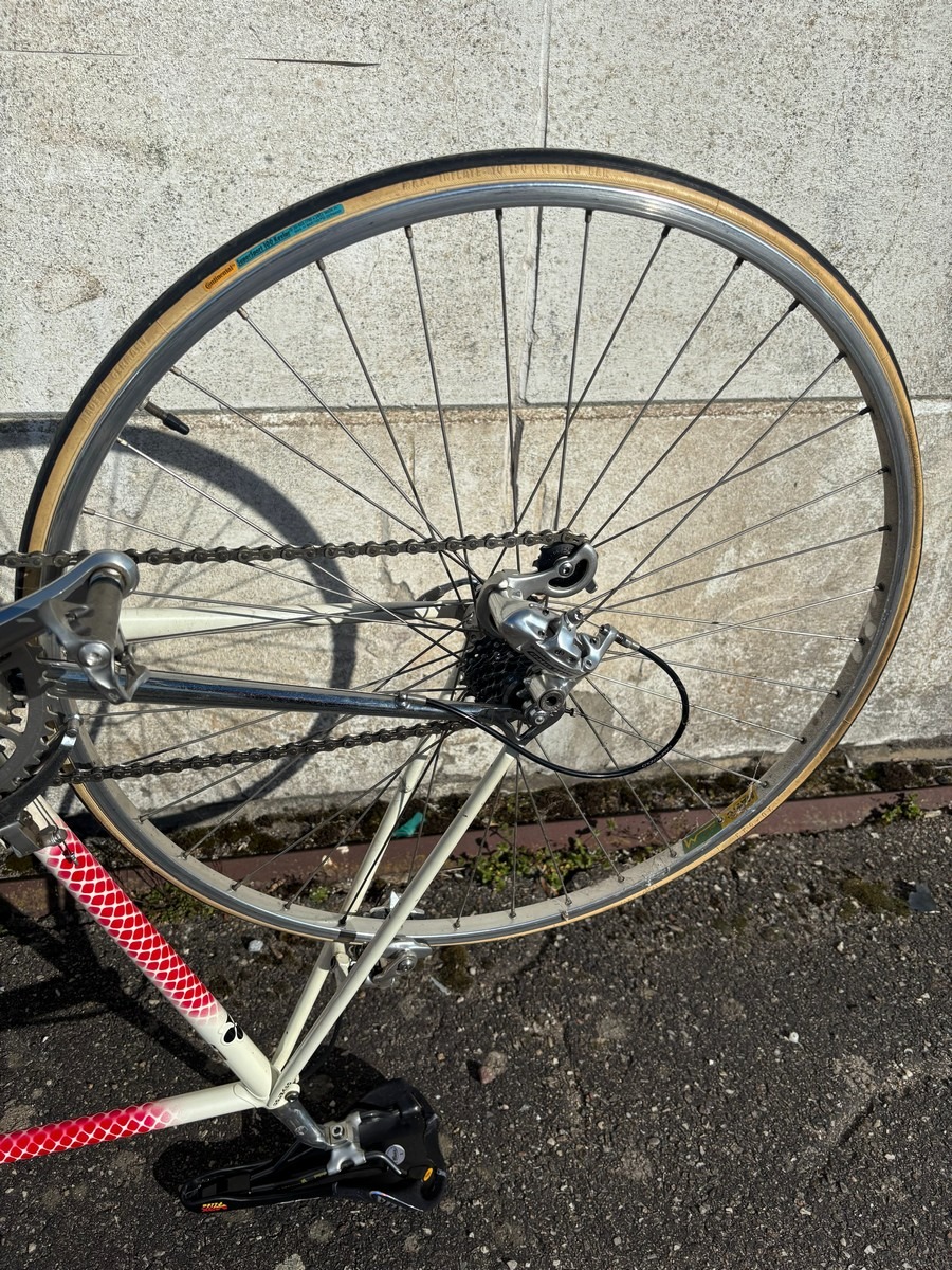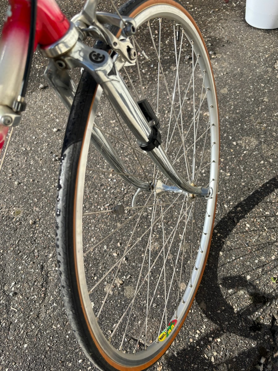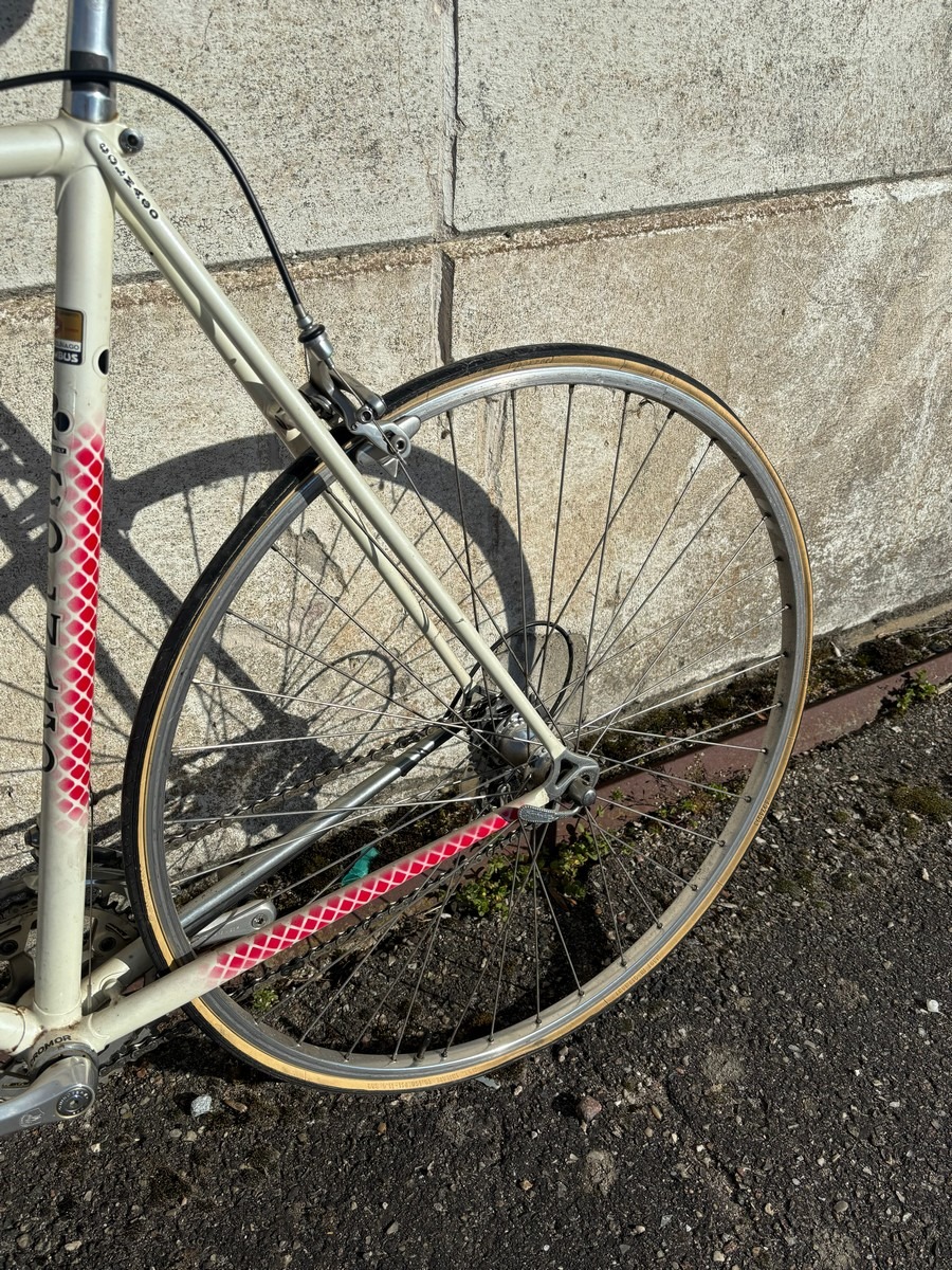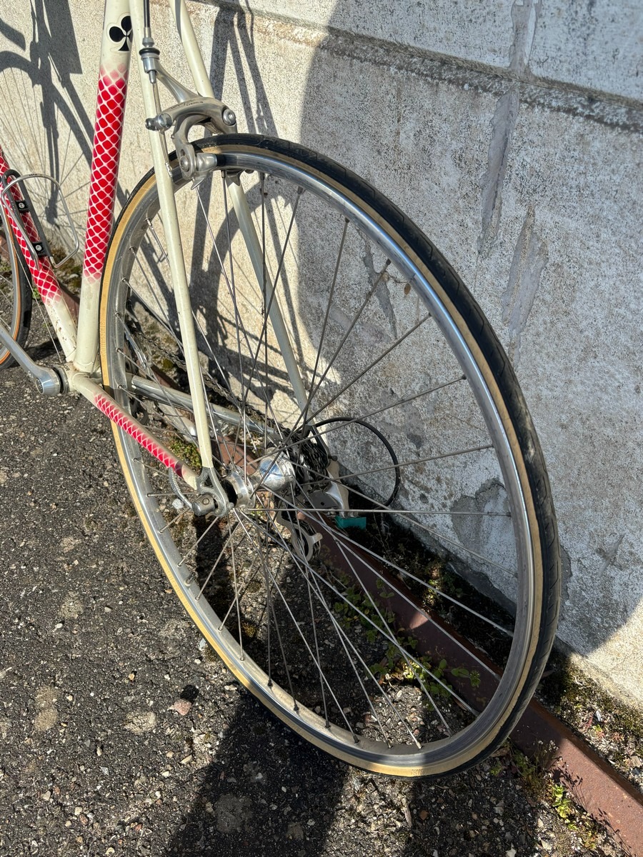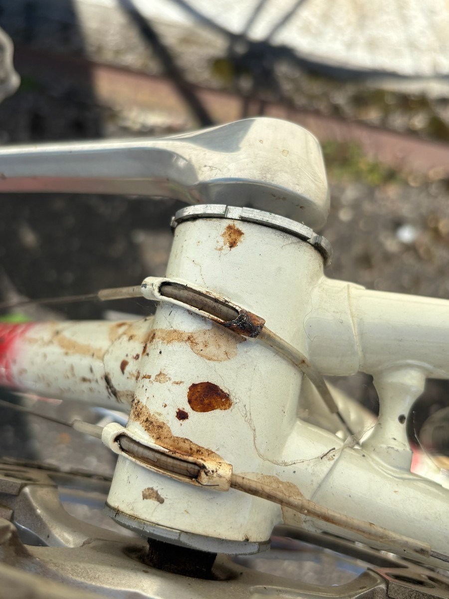 Colnago racercykel med Campagnolo Record – brugt. Klassisk italiensk racercykel med Columbus stel (Made in Italy). Udstyret med Campagnolo Record Titanium 9-speed geargruppe samt Campagnolo bremser. Fremstår i brugt stand med almindelige brugsspor, herunder mindre kosmetiske mærker og lidt rust ved krankområde. Monteret med racerstyr, smalle dæk og flaskeholdere.