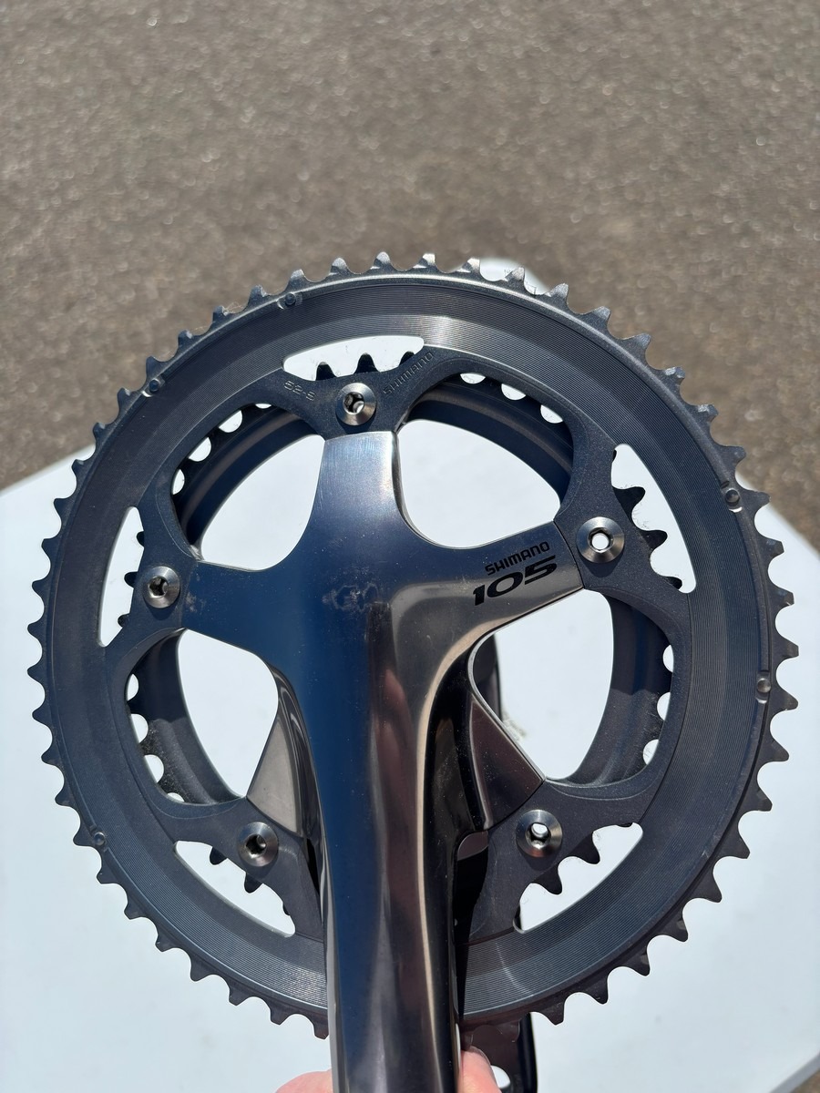 Shimano 105 kranksæt med dobbelt klinge, fremstår i flot brugt stand med minimale brugsspor, solid og driftssikker kvalitet