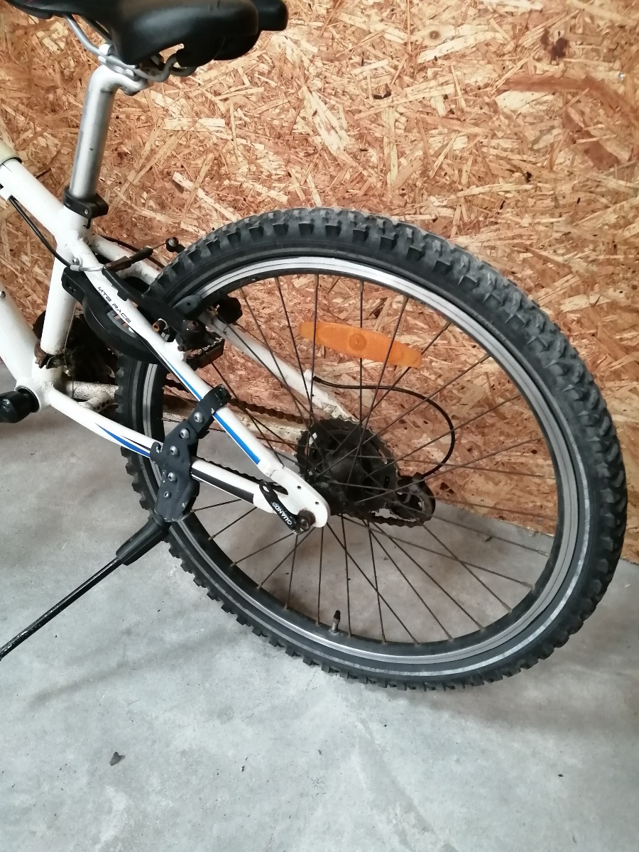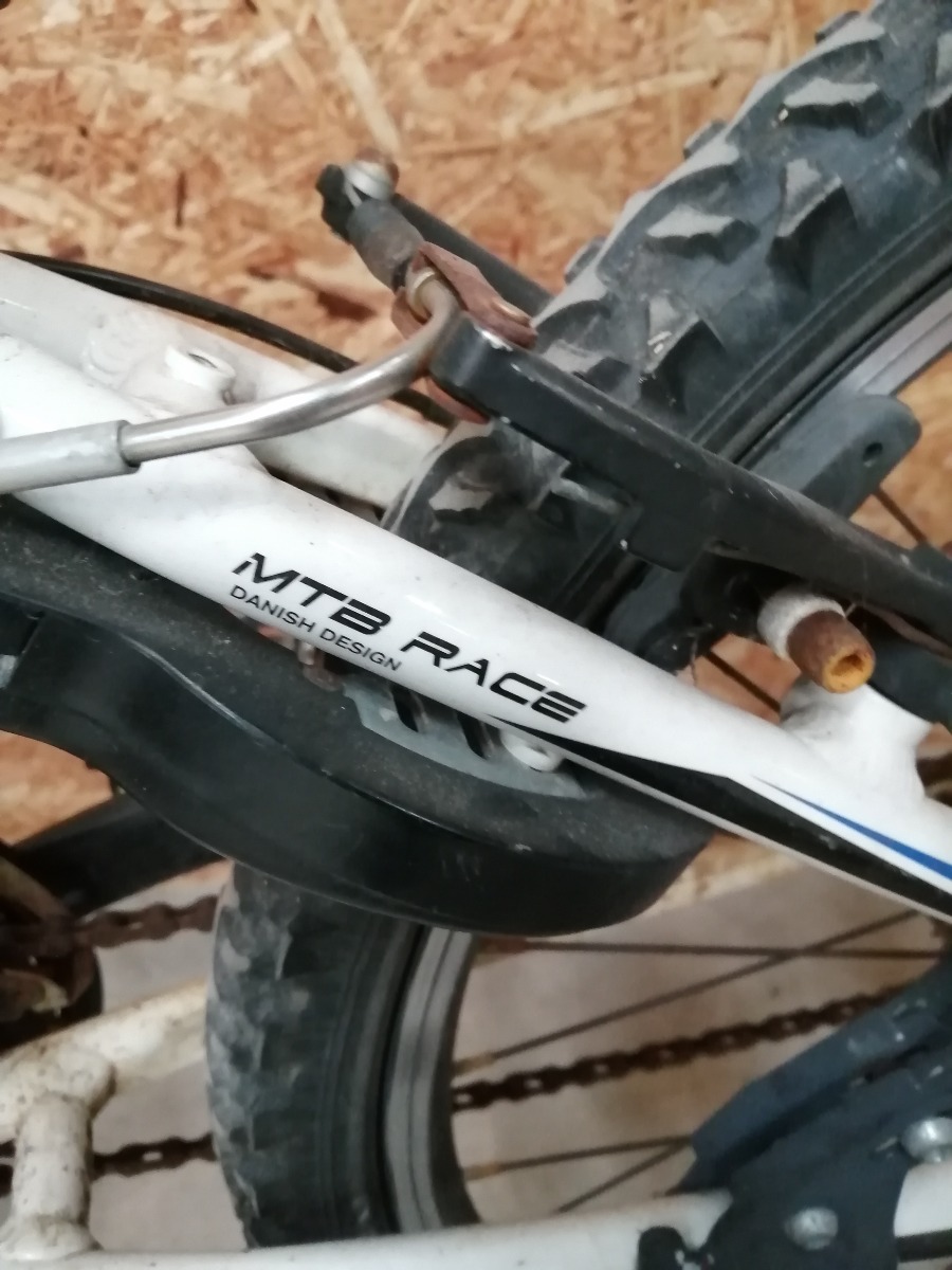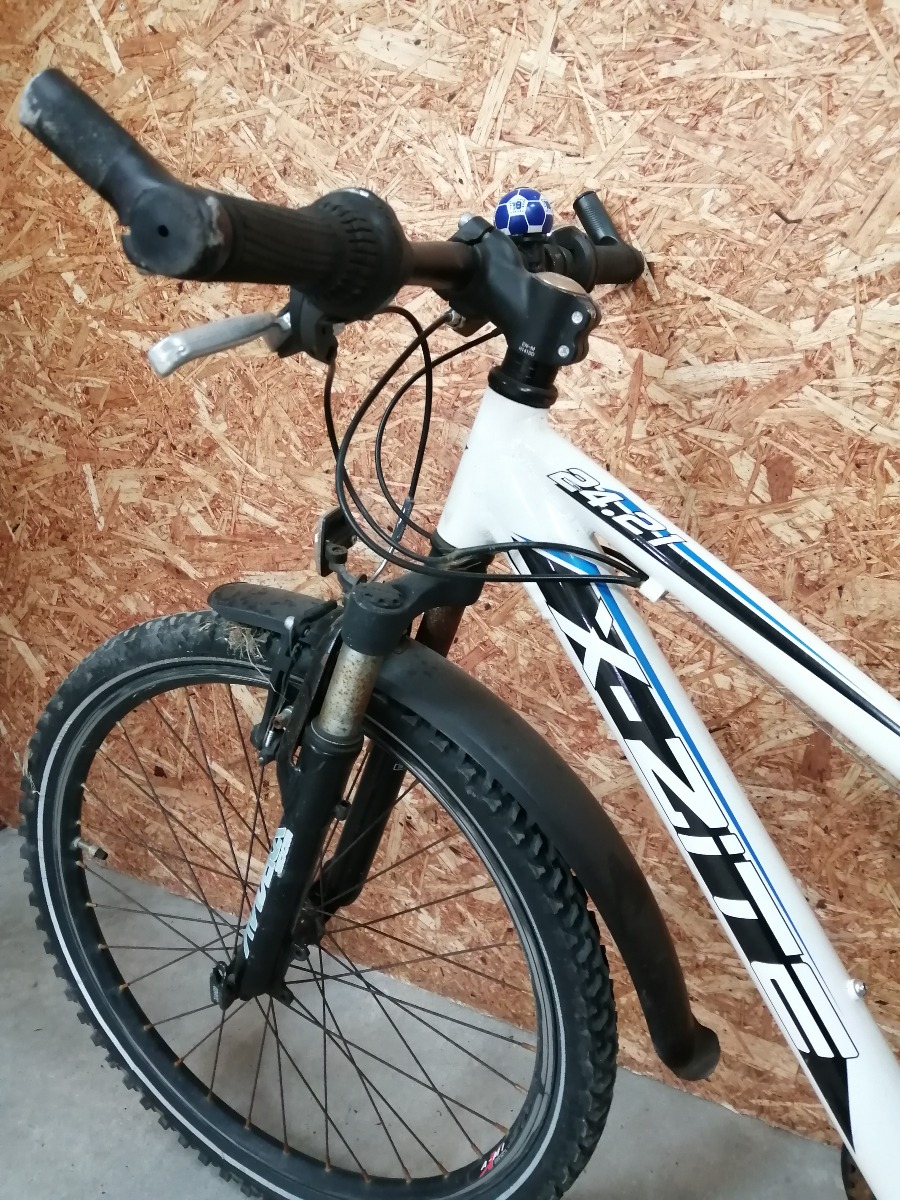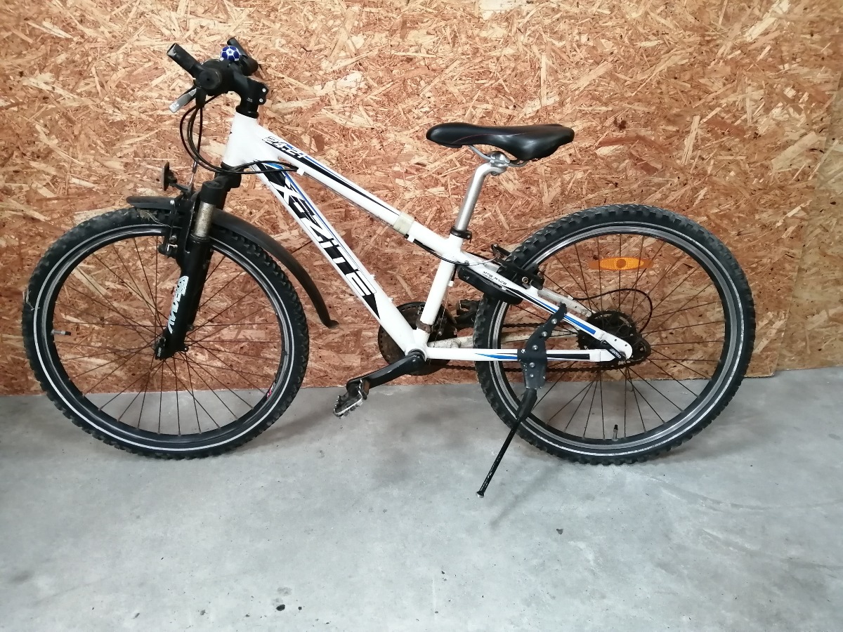 X - zite barnecykel, MTB Race, med udv. gear. 24 tommer. Stelstr. 30 cm. Med støtteben. UDEN nøgle til lås. Den har brugsspor, rust og trænger til et eftersyn. Brugt