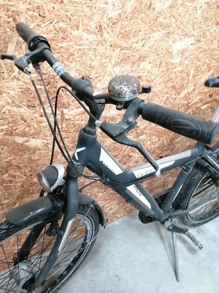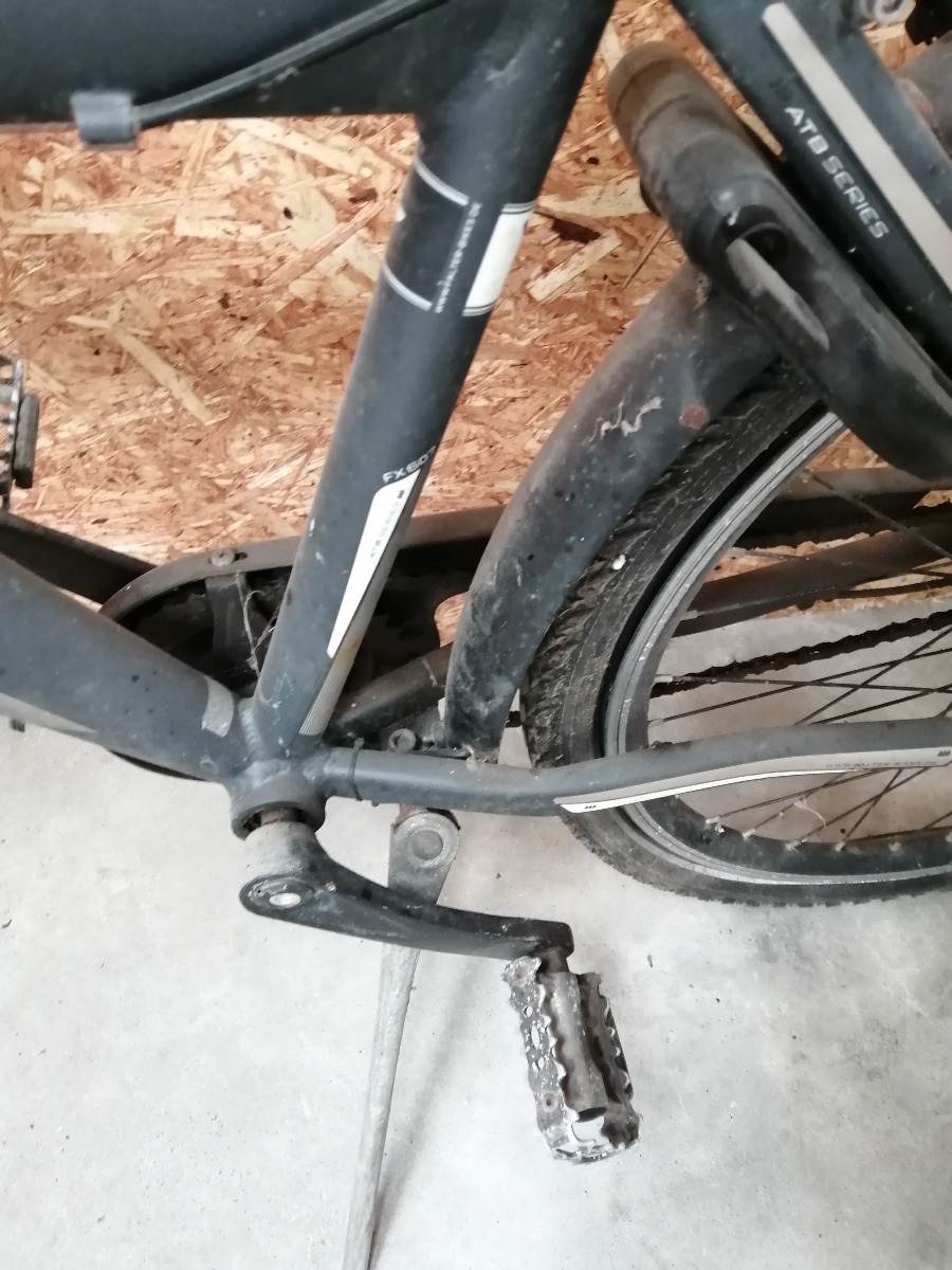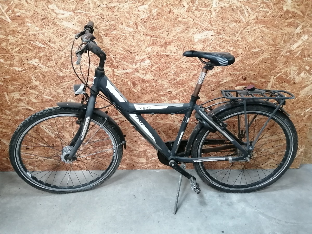 ATB series FX 607 cykel.  Med 7 gear. 26 tommer. Stelstr. 45 cm. Flad på dæk. Den mangler skærm ved gear, bagskærm er knækket. Med støtteben og lys foran. Den har brugsspor, rust og trænger til et eftersyn. Brugt.